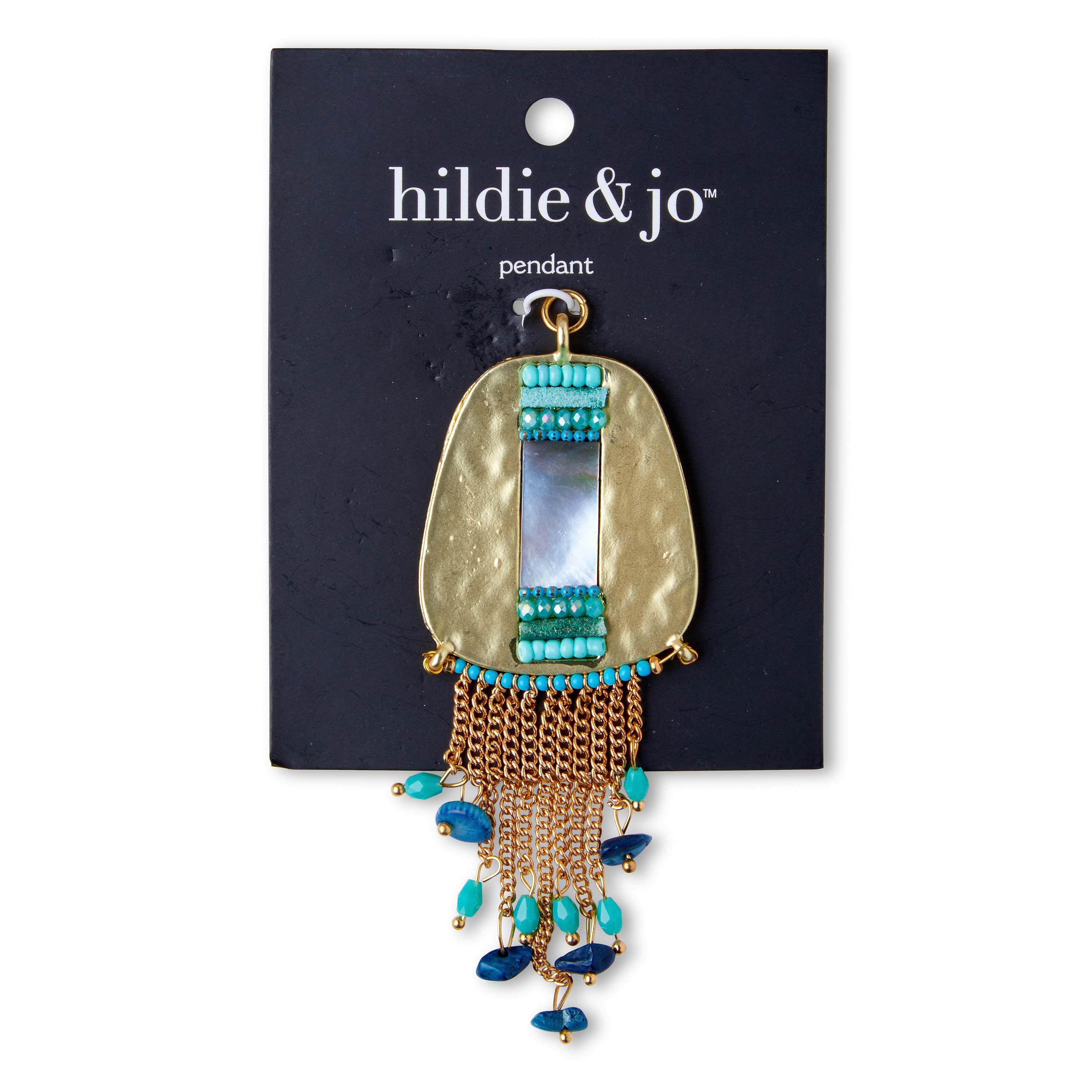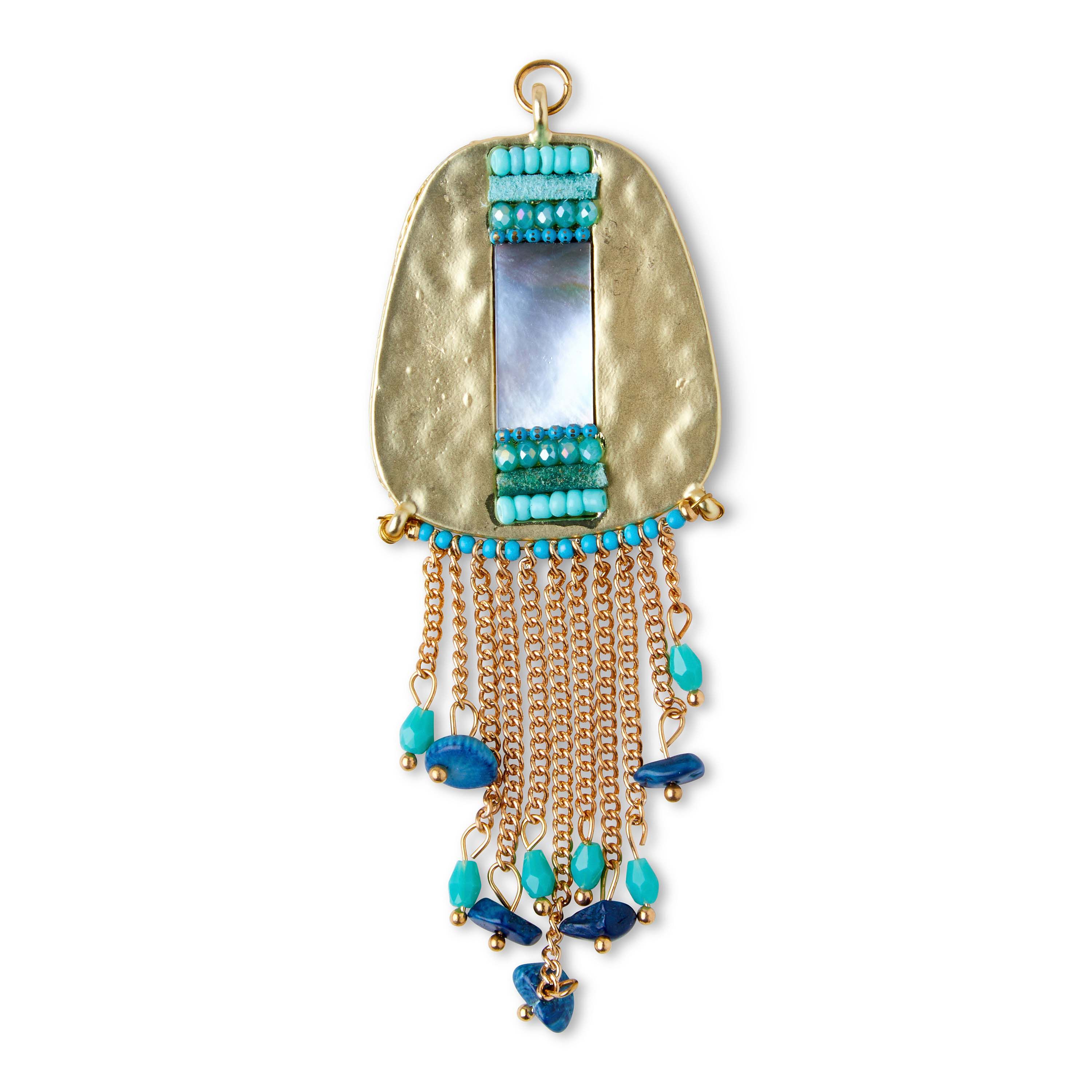 Adorn your necklace with this lovely hildie & jo Effortless Charm Pendant with Turquoise Bead Dangles-Gold. The textured gold pendant is in the shape of a trapezoid with rounded edges. Down the center is a rectangle of shell with turquoise beads on each end. At the bottom there is a row of turquoise beads, in-between each bead is a chain, in varying lengths, with a turquoise bead dangling from the end. Add it to a chain for an eye-catching effect. It has a jump ring for easy attachment.