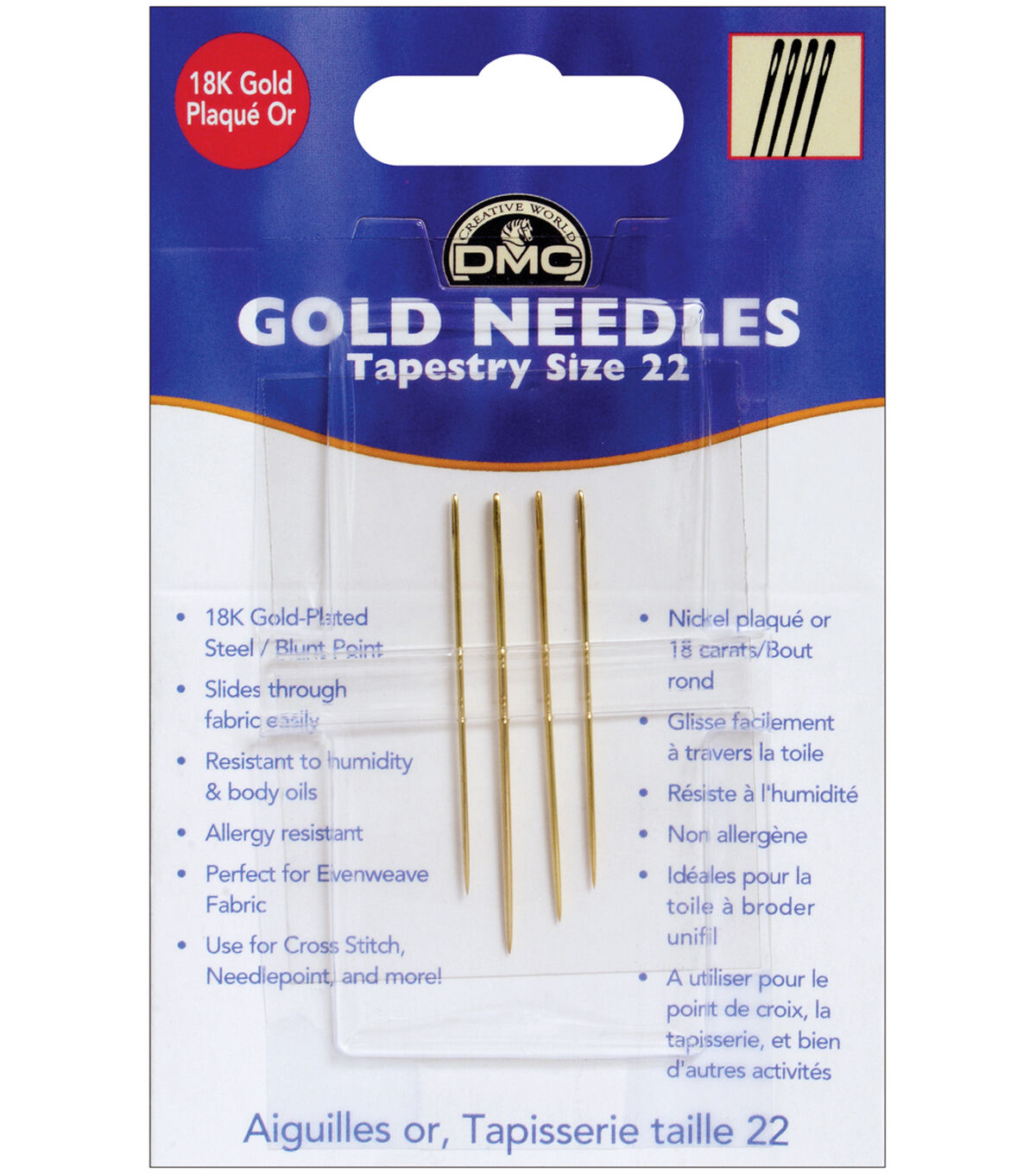 DMC-Gold Tapestry Needles are superior quality needles that are resistant to humidity, body oils and rust. Perfect for cross- stitch, needlepoint, and counted threadwork. Four needles per package. Size: 22. Made in France.