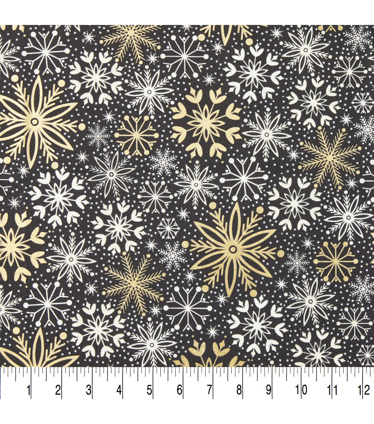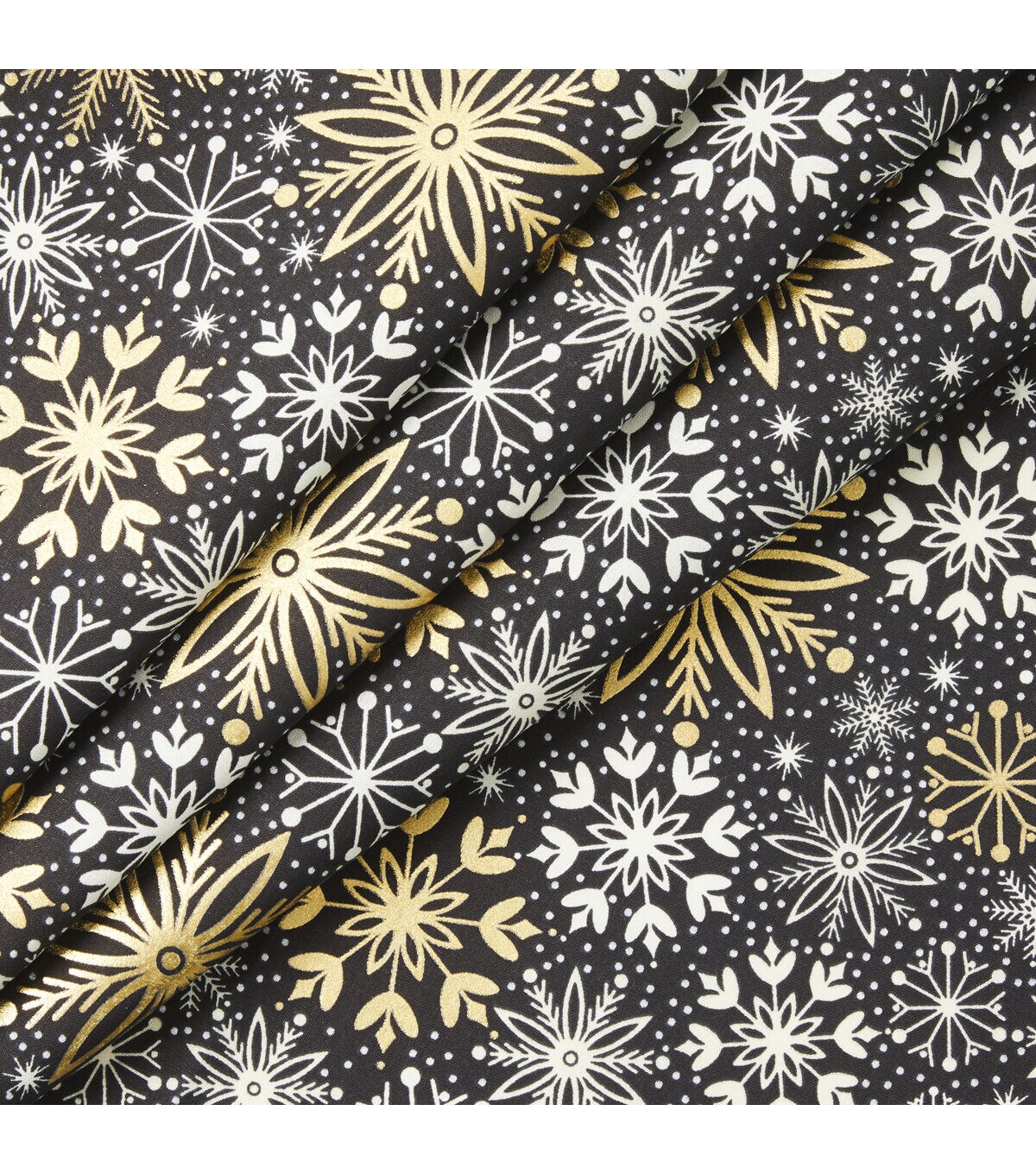 Get in the Holiday Spirit with Gold & White Snowflakes on Black Christmas Foil Cotton Fabric