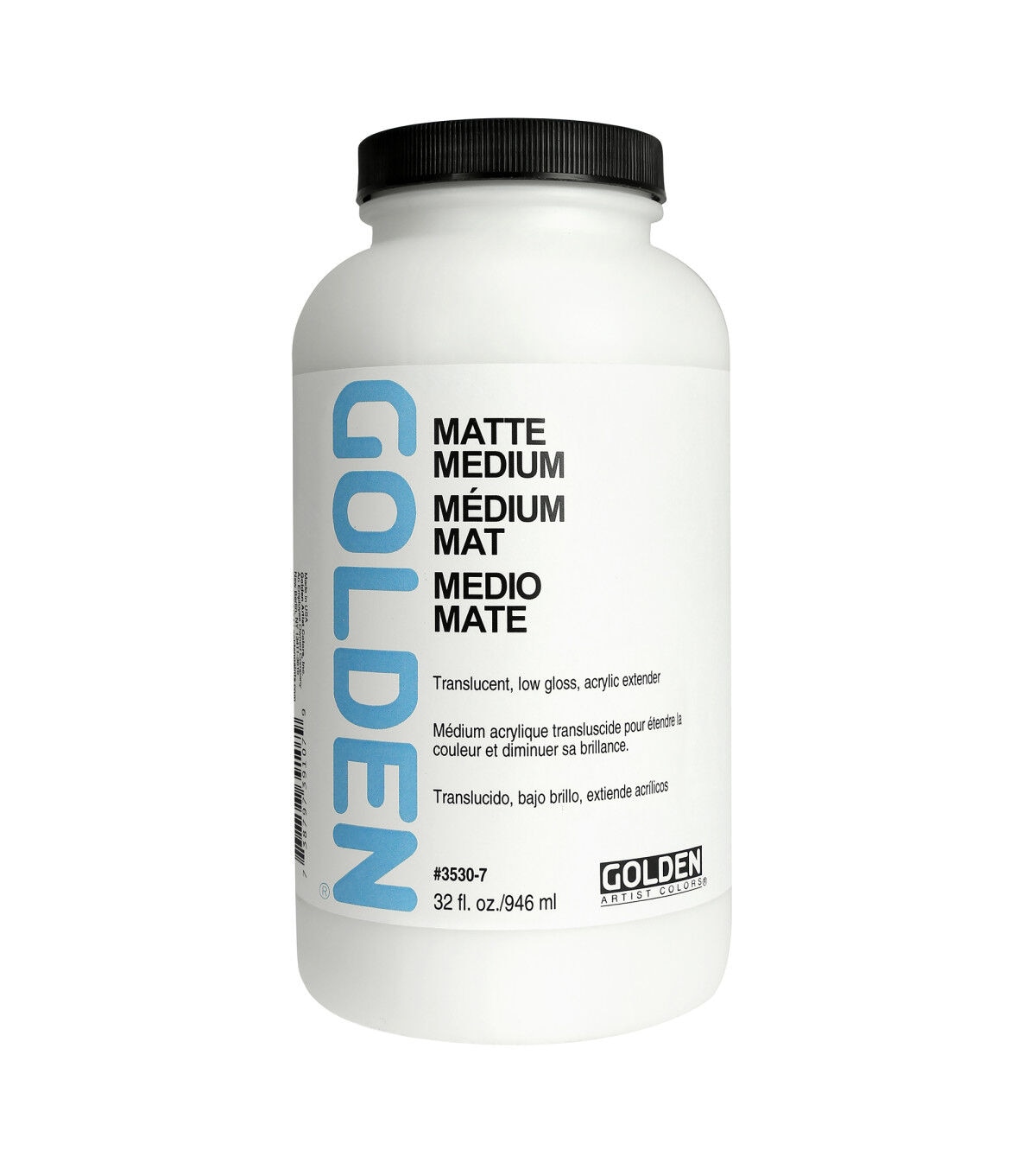 Golden® Matte Medium is useful for extending color, decreasing gloss and increasing film integrity. Build the foundation for your work and use as a nearly clear ground on canvas instead of gesso.