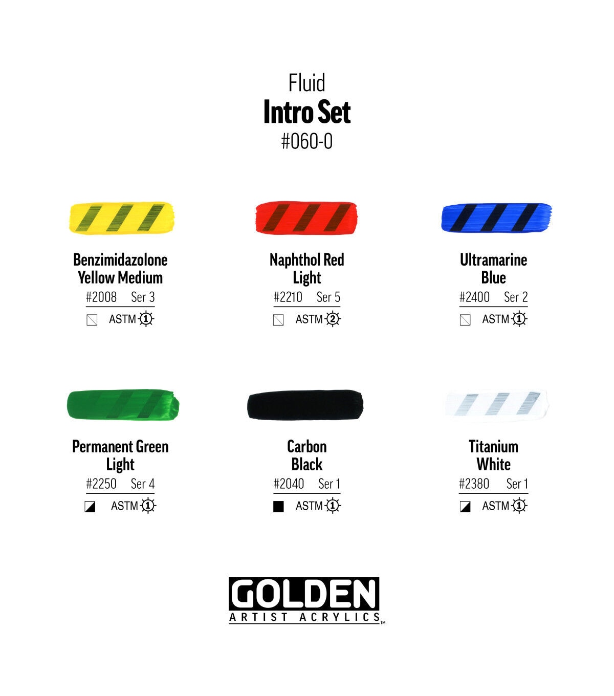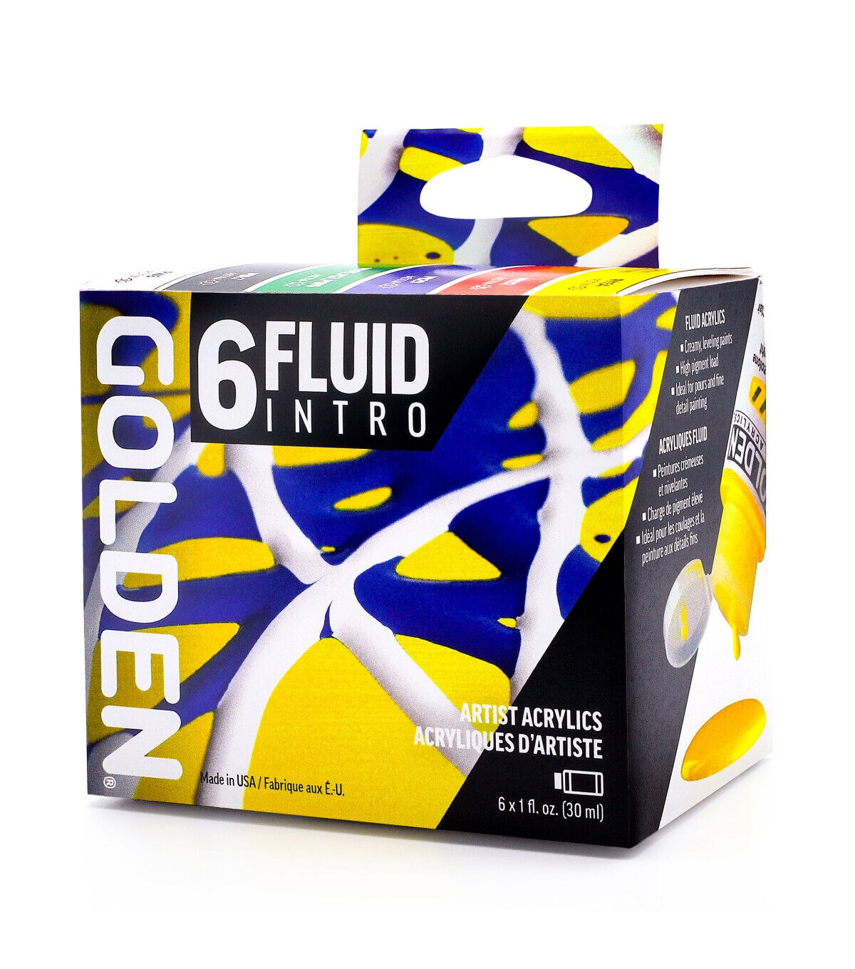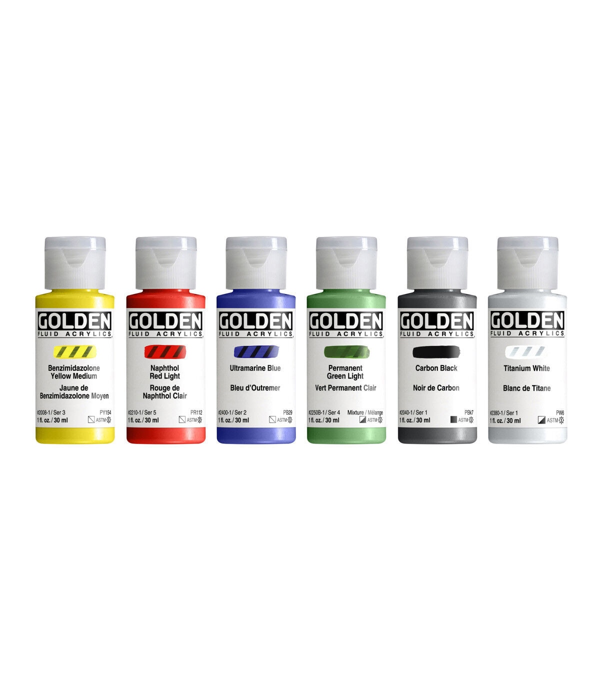 These highly intense, permanent colors from Golden have a consistency similar to heavy cream. They are produced from lightfast pigments, not dyes. No fillers or extenders are added. Fluid Acrylics contain high pigment levels suspended in an acrylic polymer vehicle.