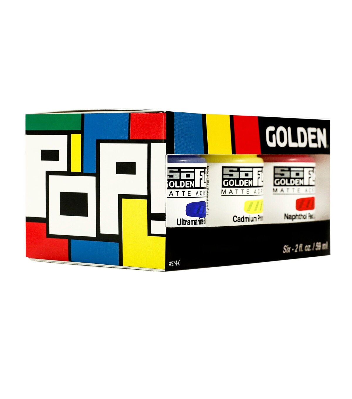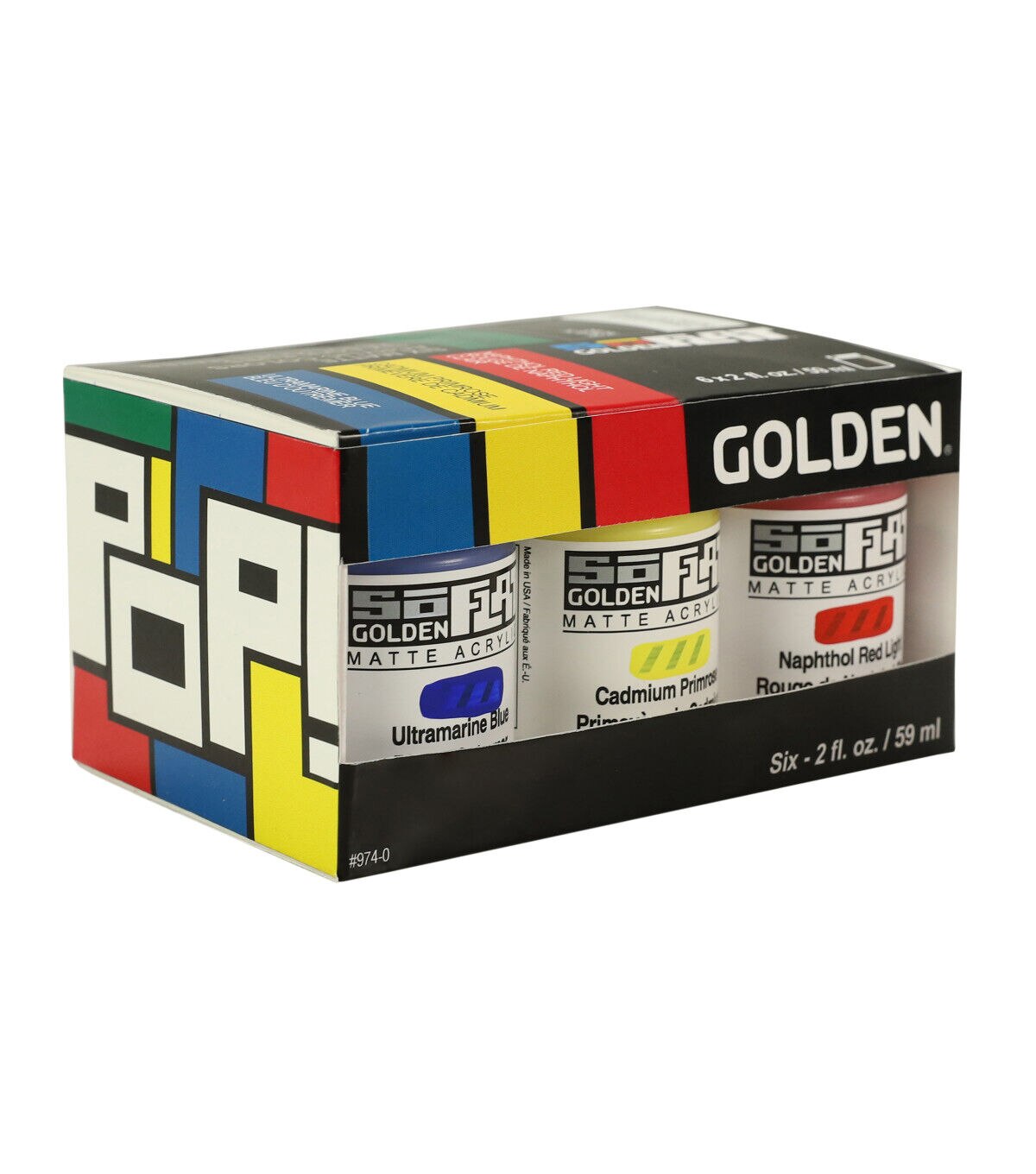 SoFlat Matte Acrylic delivers an unmatched combination of intense matte color with enhanced leveling and opacity. The paint is formulated to make it easier for you to create uniform fields of rich matte color in fewer layers than Golden's other color lines. Ideal for creating large, graphic, matte and flat works of art: the matte surface is free of glare or brushstrokes for creating uninterrupted fields of intense color. Artwork created with SoFlat shows up beautifully in photographs and looks fantastic online. This set includes cadmium primrose, naphthol red light, ultramarine blue, permanent green, black and titanium white.
