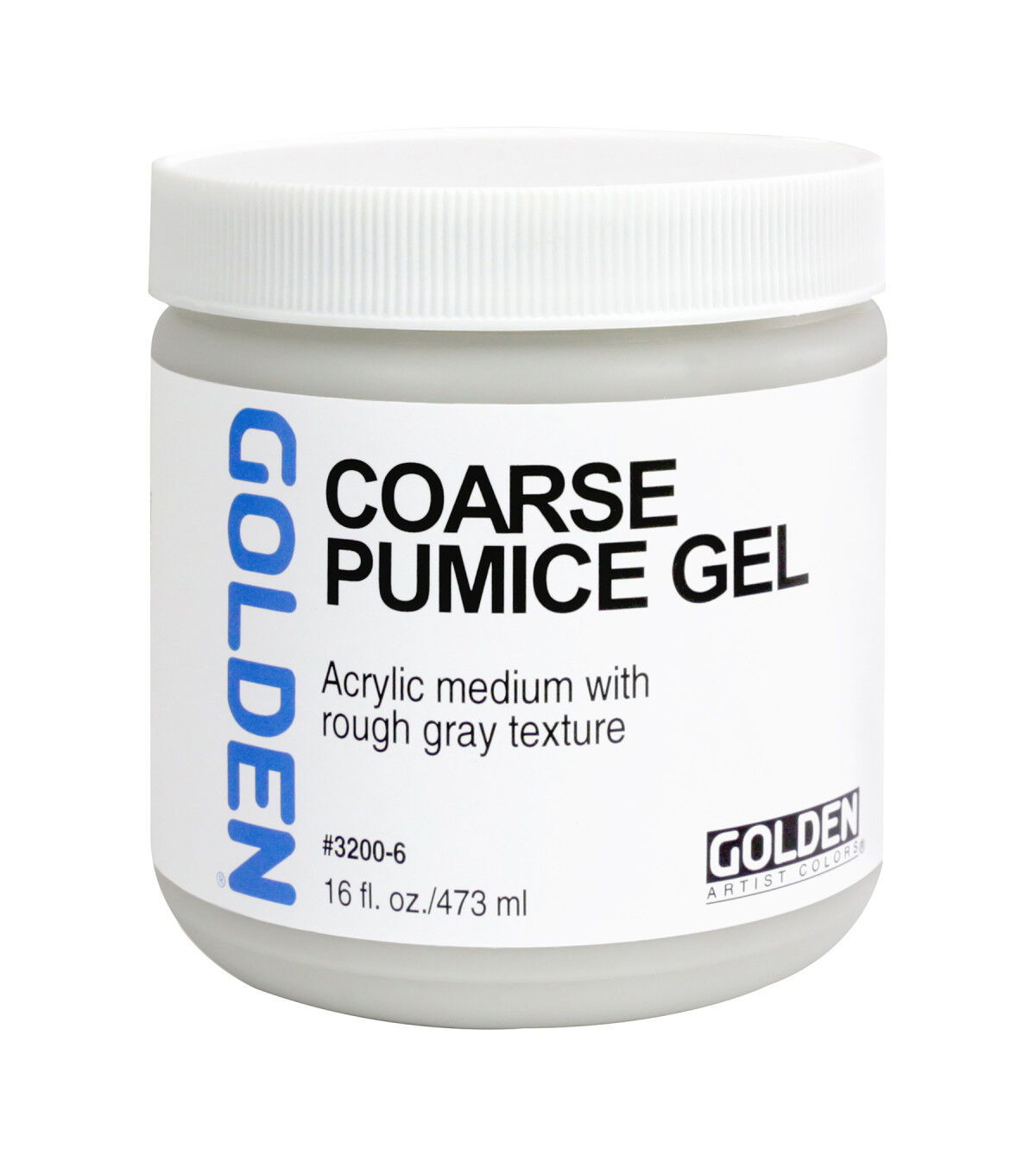 This coarse pumice gel yields a concrete-like finish with acrylic paints. Create finely textured surfaces and blend with Golden Acrylic colors to increase flexibility.