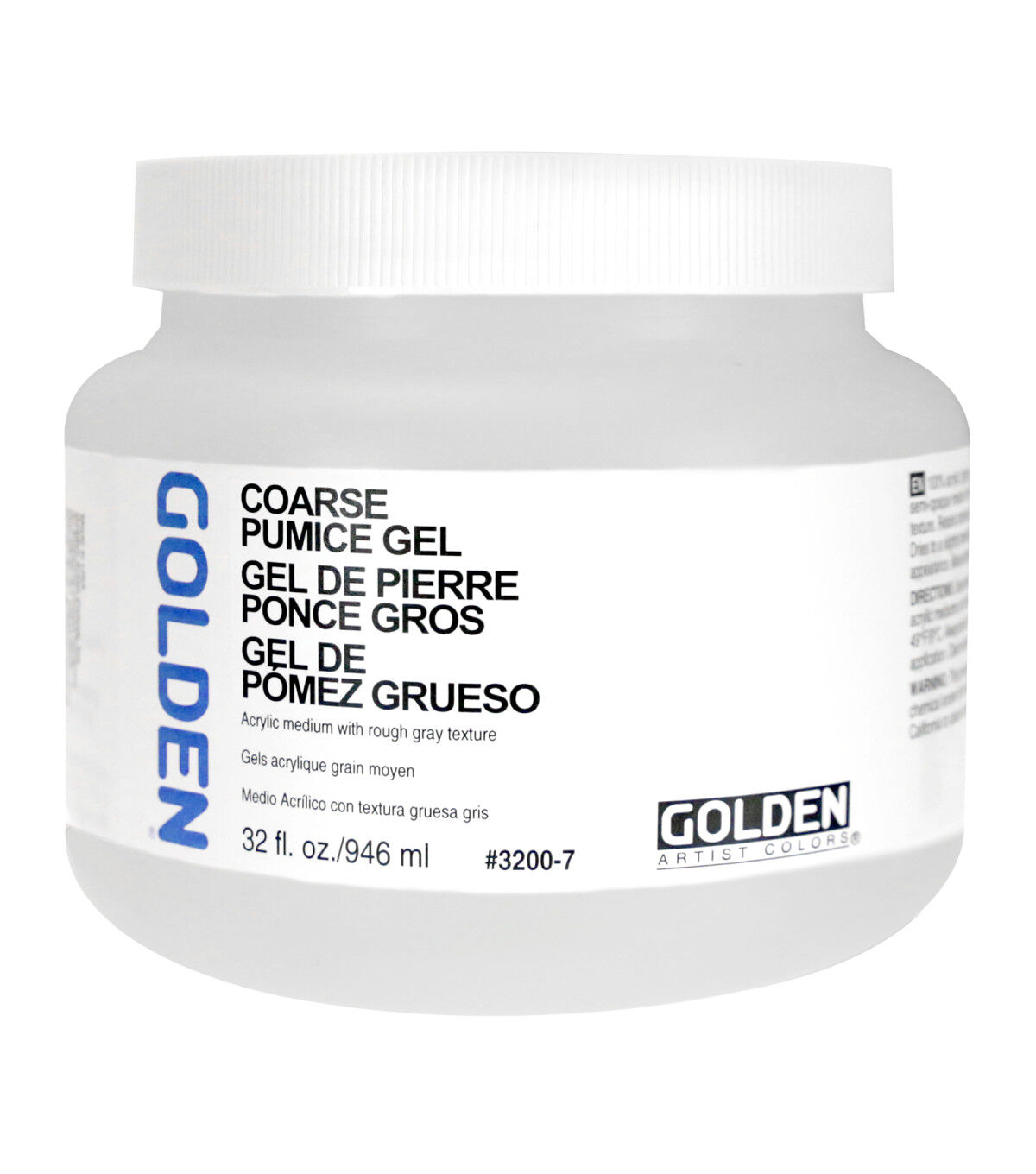 This coarse pumice gel yields a concrete-like finish with acrylic paints. Create finely textured surfaces and blend with Golden Acrylic colors to increase flexibility.