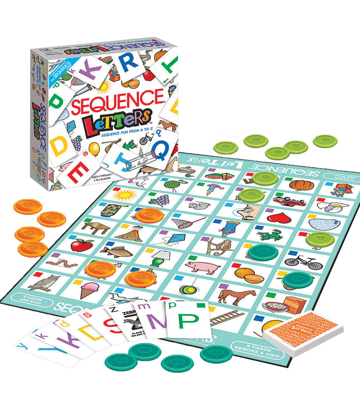 Players sound out the letter on their cards, match it to the beginning sound of a picture on the gameboard, then place a chip there. Each card features a letter of the alphabet in upper and lower case. Colored squares on the cards and gameboard help with faster recognition. When you have 4 of your chips in a row, you've got a Sequence! Kids will have fun playing the great game of Sequence while learning the letters of the alphabet. Dot your 'i's' and cross your 't's',it's the Sequence way to learn your ABC's! Contents: Folding Game Board, Playing Cards, Playing Chips, Game Instructions.
