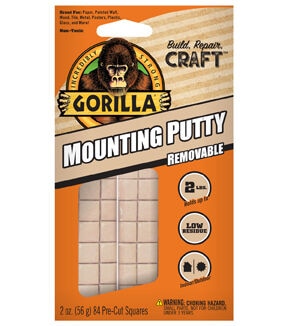 The Gorilla Removable Mounting Putty Pre-cut Squares is just what you need to securely hang lightweight posters, paintings, decor accents on surfaces such as paper, cement, wood, tile, glass and more. It is cut into squares, non-toxic, removable, repositionable and holds up to 2 pounds of weight. This mounting putty doesn’t dry out or harden and is a great alternative to traditional tapes, push pins and fasteners.