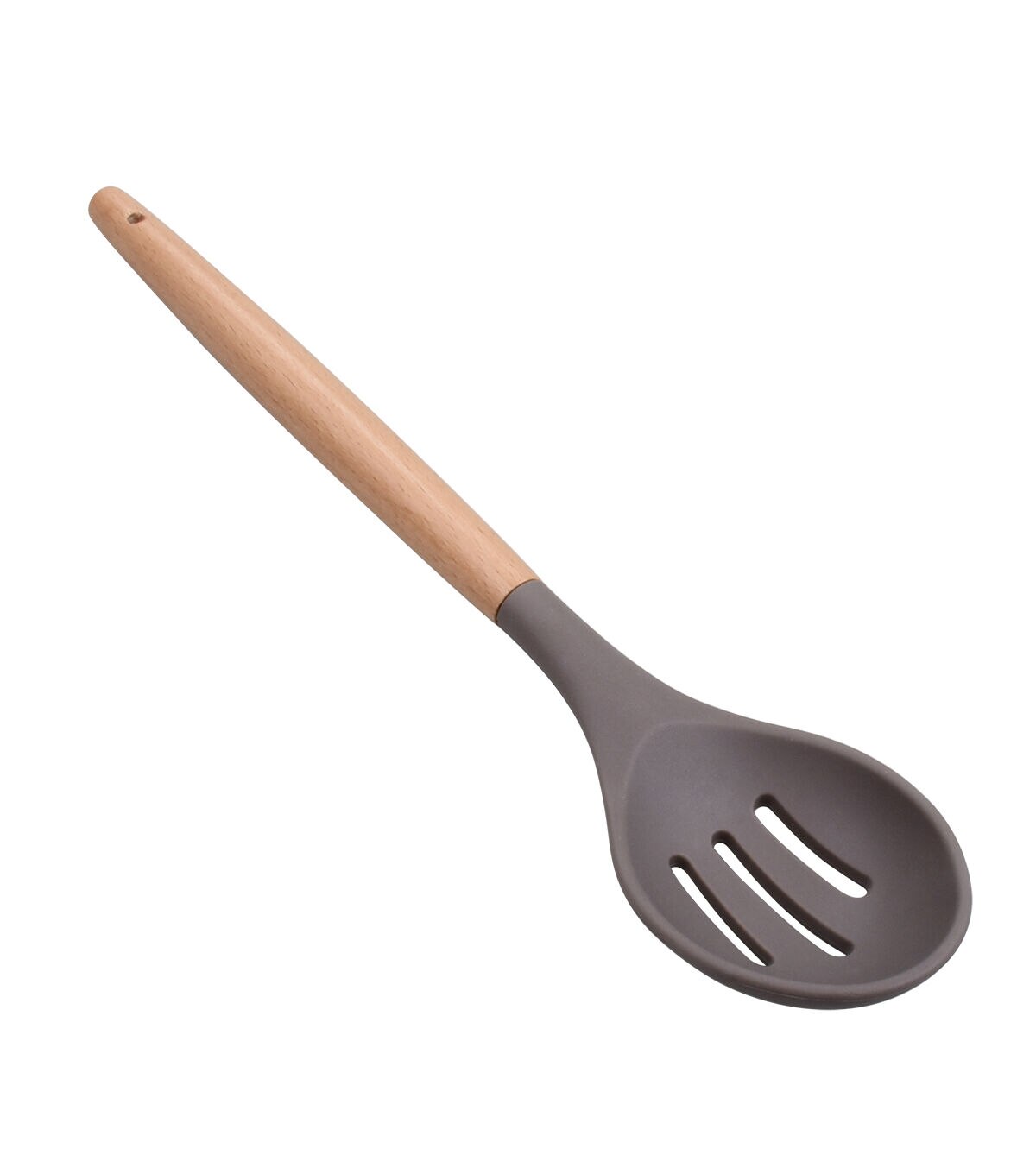 Classy wood handle adorned with a sophisticated gray silicone head. Perfect for everyday cooking. Easily scoops foods from liquids and allows flexibility to get in harder to reach corners.