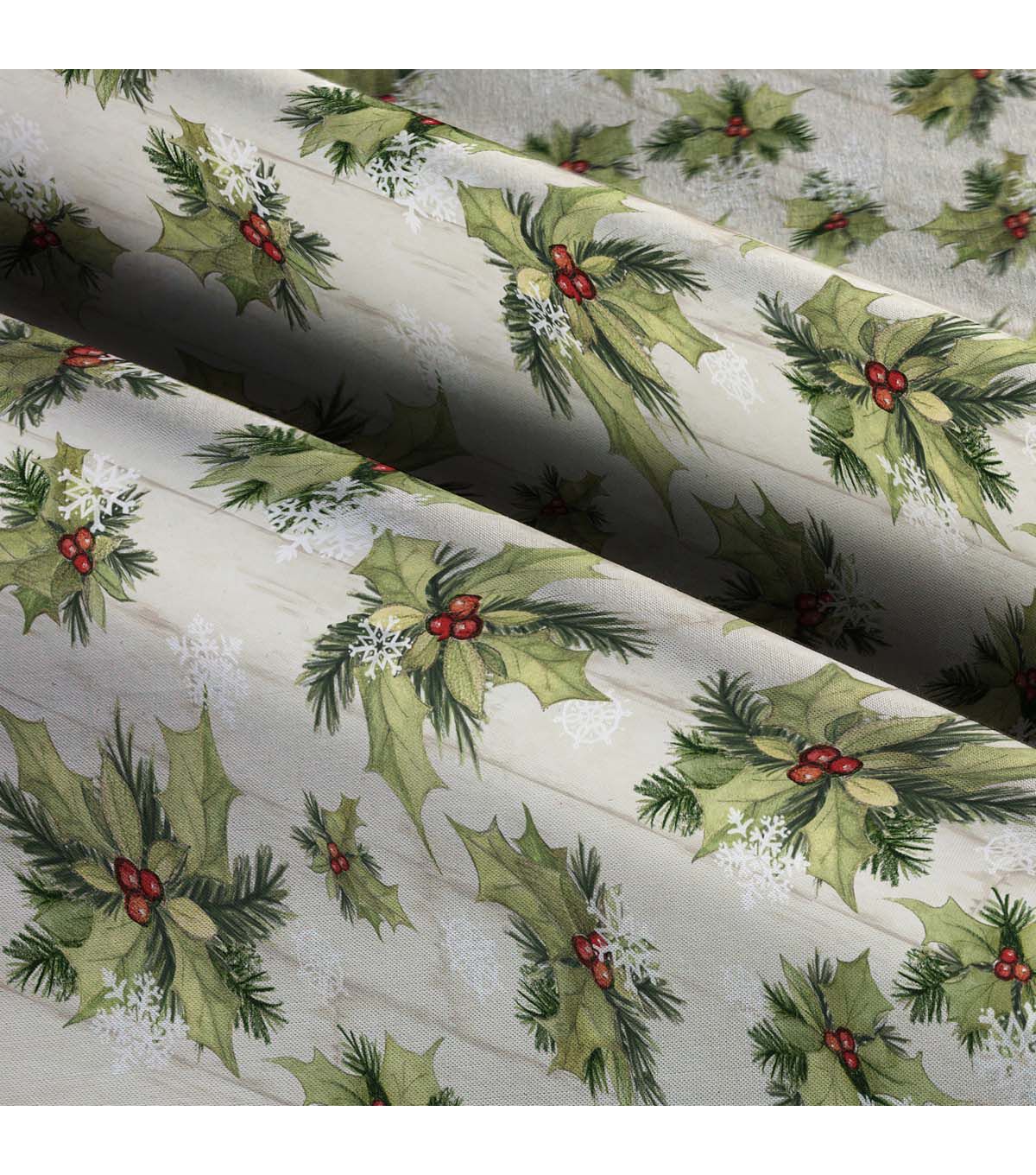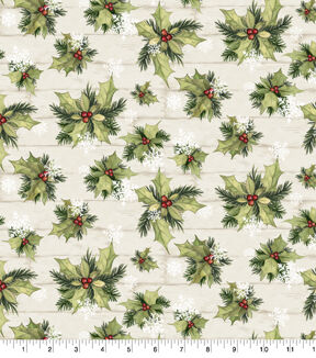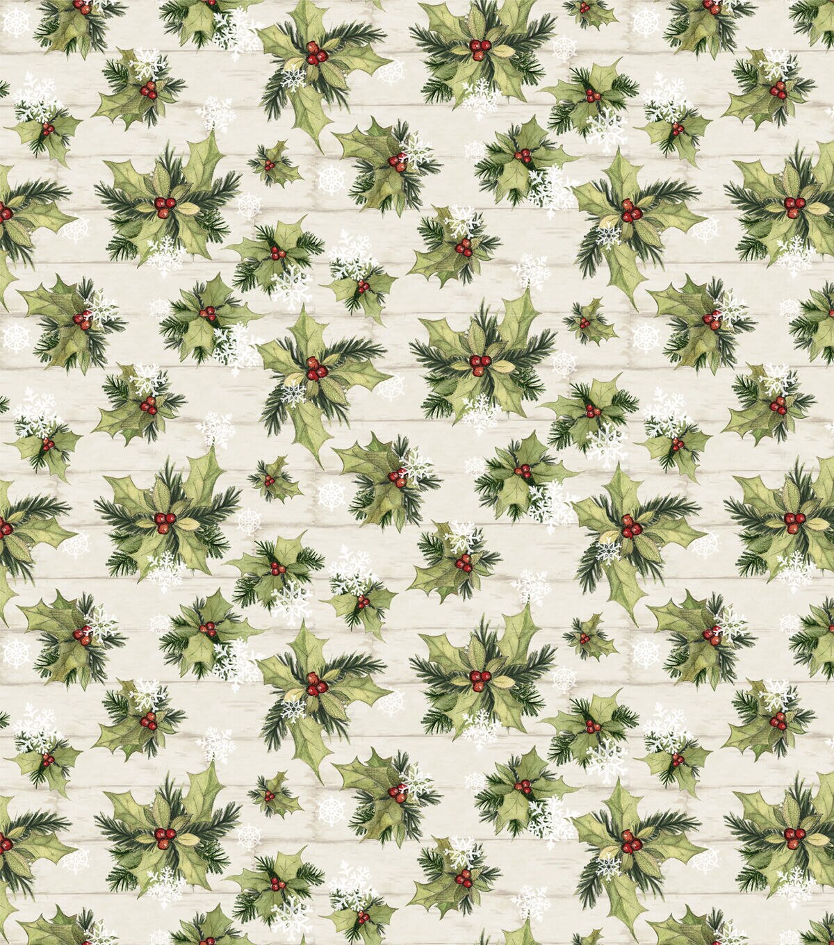 Green Holly & Snowflakes on Wood Christmas Cotton Fabric