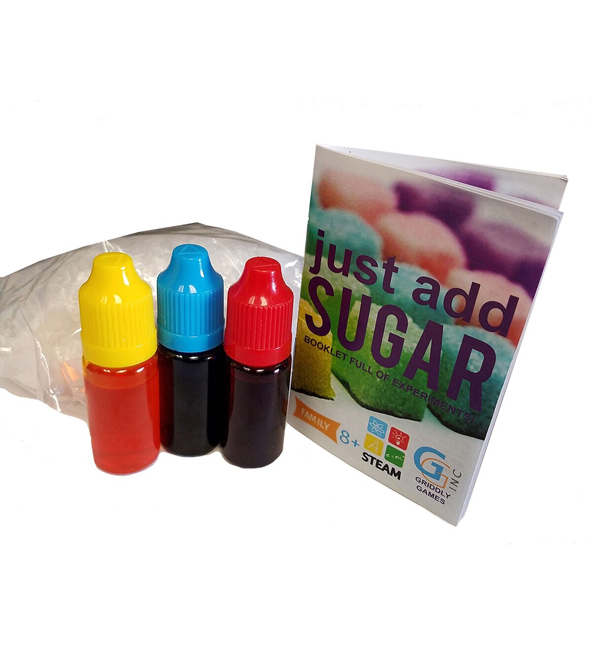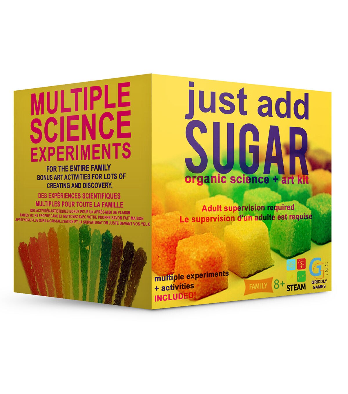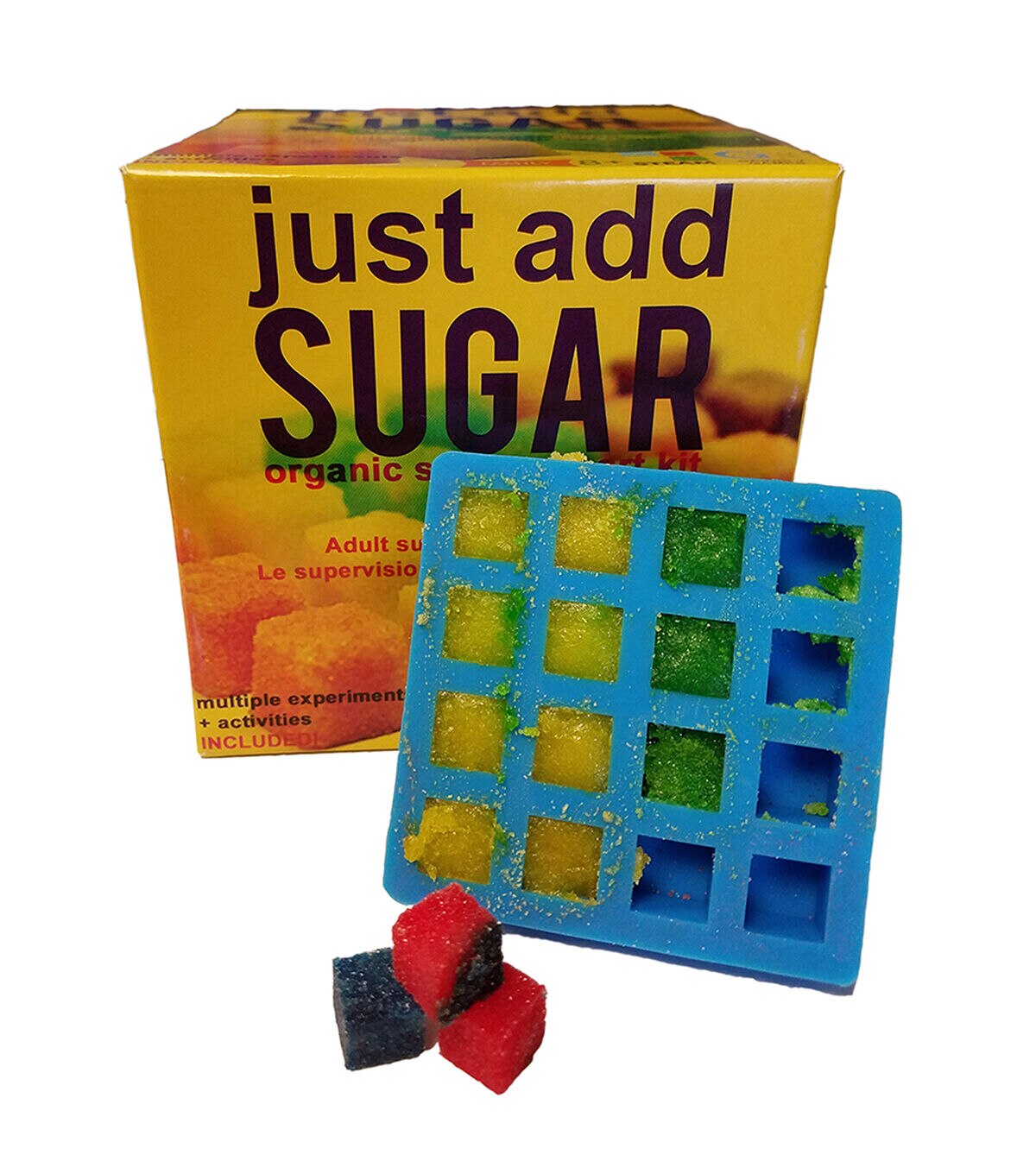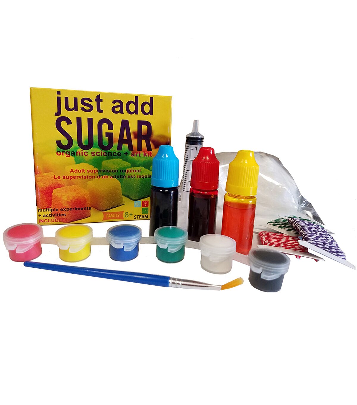 The bio-organic STEAM Griddly Games Just Add Sugar Organic Science + Art Kit will inspire artists and scientists alike. Kids can make their own candy, sugar cubes and then clean up with their own homemade soaps. It includes card stock, a rules booklet, food coloring, a silicon tray, paint, white glycerin, syringe and reusable box. This play-and-learn kit includes activities like making sugar crystals, sugar cubes, soaps, ice worm pond, edible play dough and super tie-dyed shirts.