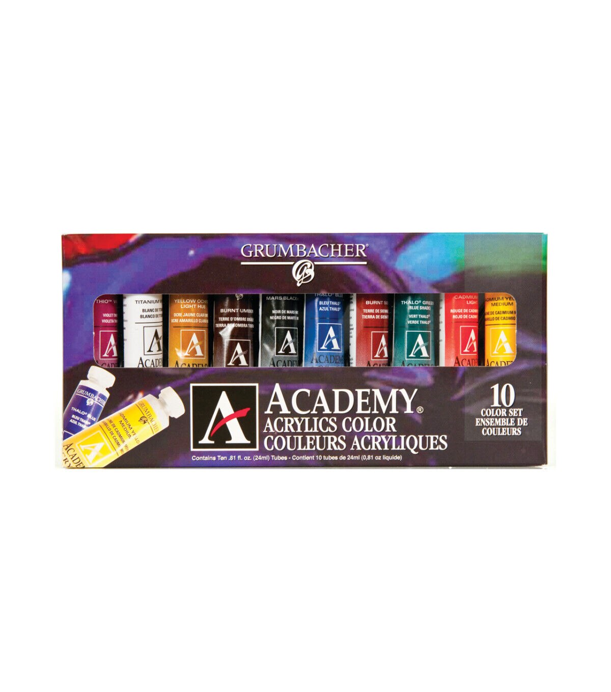 This set of acrylic paints provides high quality at an affordable price, ideal for students and price-conscious artists. Genuine pigments are used to produce a smooth, consistent colors. This set includes burnt sienna, burnt umber, cadmium red light, cadmium yellow medium, mars black, Pthalo blue, Pthalo green, Thio violet, titanium white and yellow ochre.