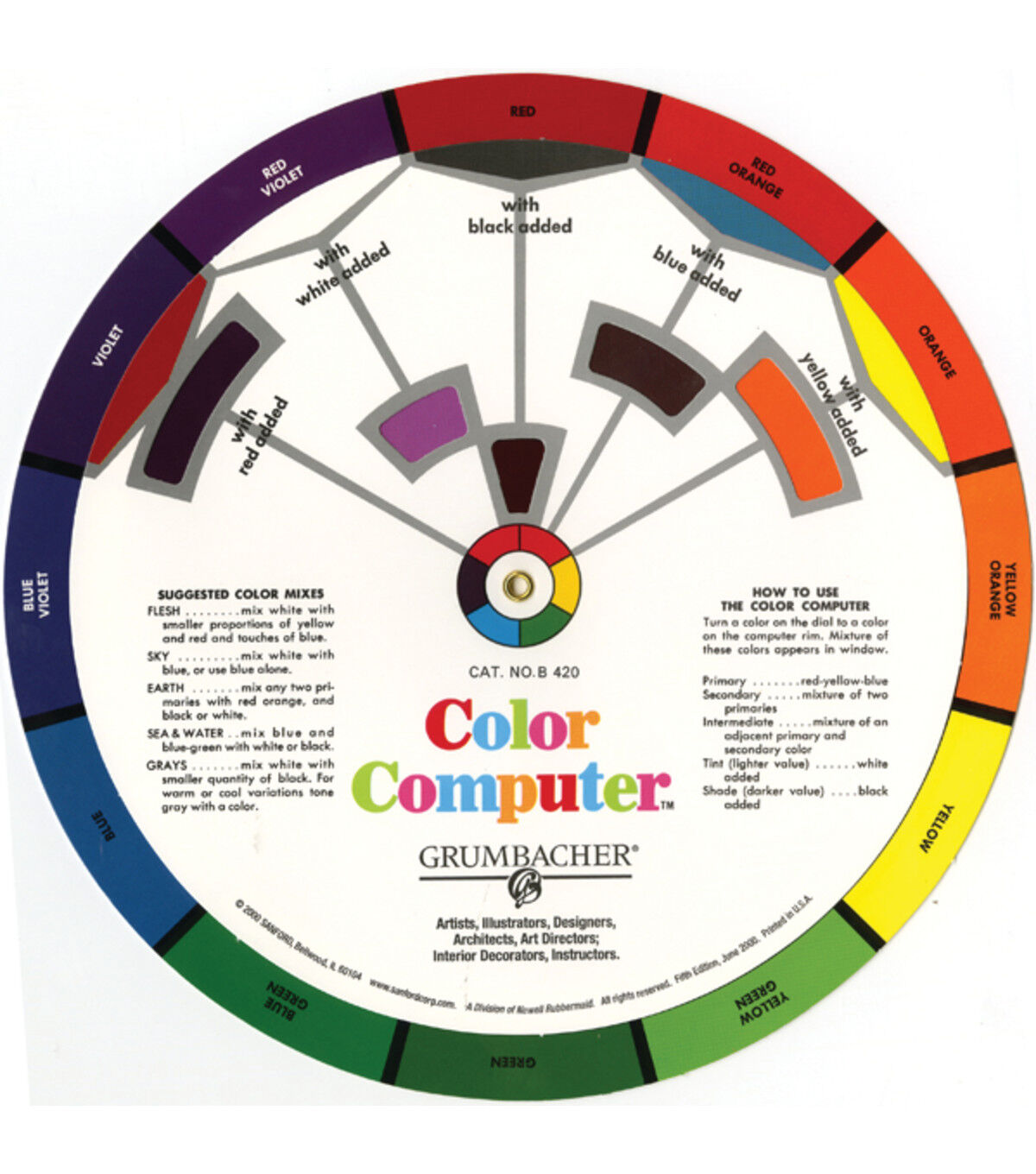 Color charts are incredibly useful for selecting your palette, clarifying color relationships and learning more about mixing colors. This rotating paper disk shows results of mixing twelve colors with degrees of black, blue, red, white and yellow.