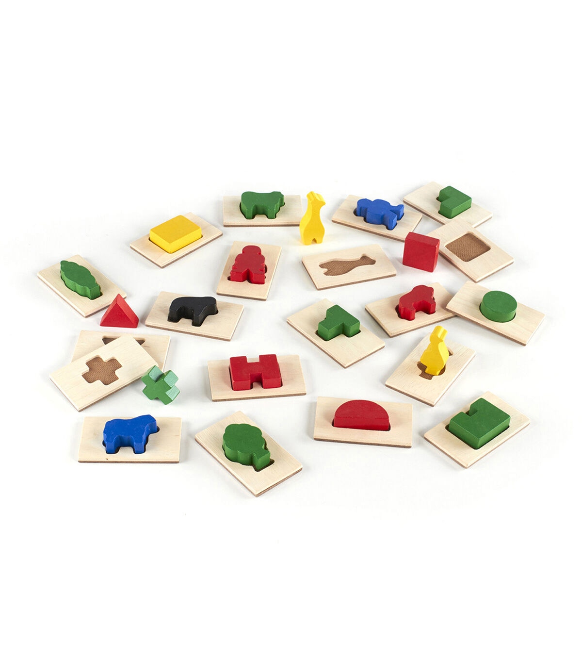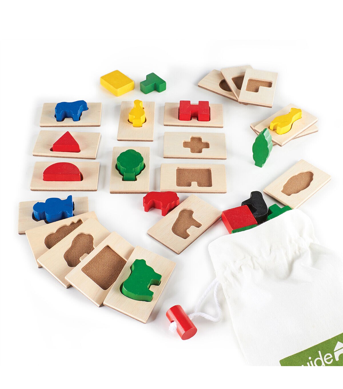 Complete with 20 wooden shapes and matching, textured tiles provided in a durable canvas bag. Deal out the tiles and children reach into the bag to feel and find the corresponding wooden shape. Includes geometric and object shapes. Pieces can also be used as 20 mini whole-object puzzles! Safe non-toxic paints. • Wooden shape and tile matching game to reinforce cognitive development • Set includes 40 chunky puzzle pieces and canvas bag with drawstring • Find a shape and match the symbols to the tiles • Chunky puzzle pieces • Material: Rubberwood, MDF, chipboard and canvas bag • Educational Focus: Visual and tactile exercises, matching skills and color identification • Suggested Age: 3+