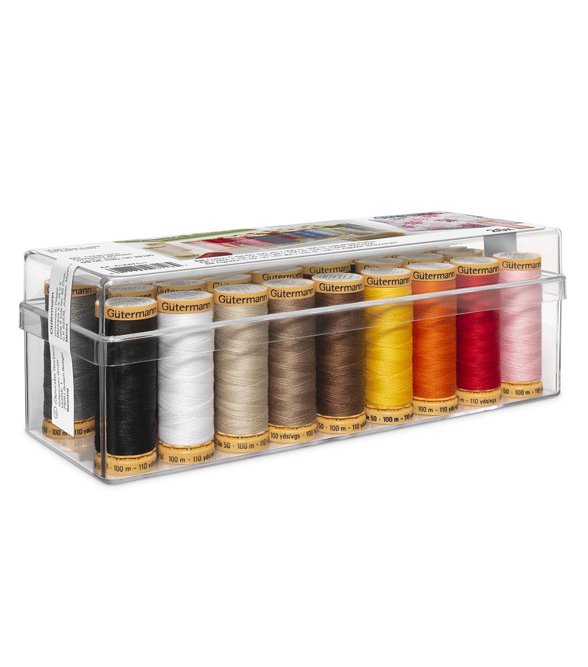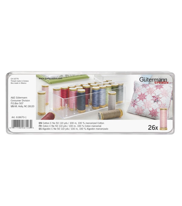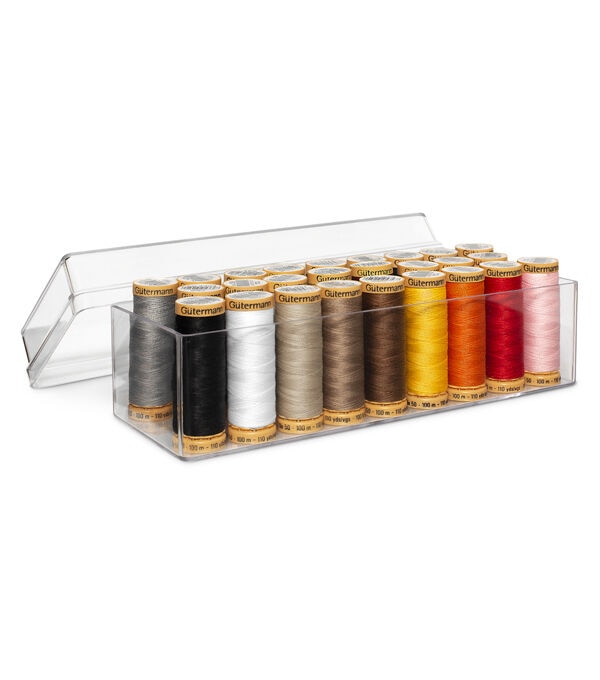 Following the tradition of the ever popular 26 Spool Polyester Thread Box … Gutermann is now offering this 26 Spool Cotton Thread Box; Receive 26 of the most popular Gutermann premium cotton colors in 100m spools; All included in clear plastic box with individual spindles to hold spools in place; Great storage box and easily transported; This item is a must for all quilters as it is a great starter kit yet offers variety of colors for the expert quilter and their numerous quilting projects; Offered at value pricing when compared to purchasing 26 separate spools ... plus receive storage box!