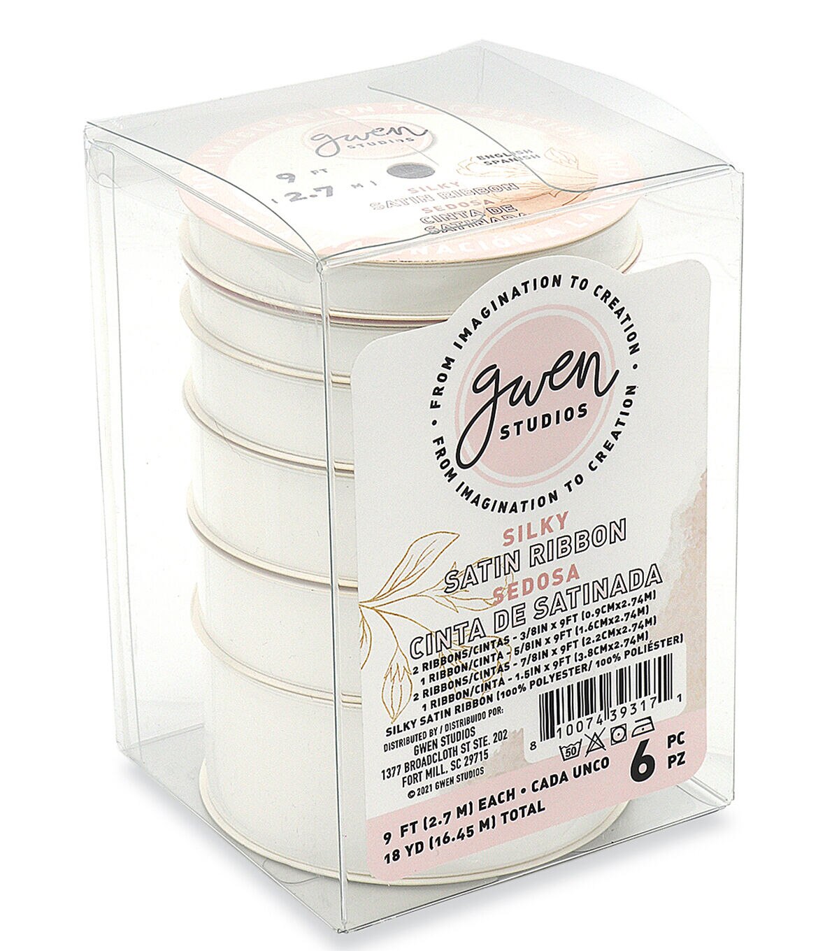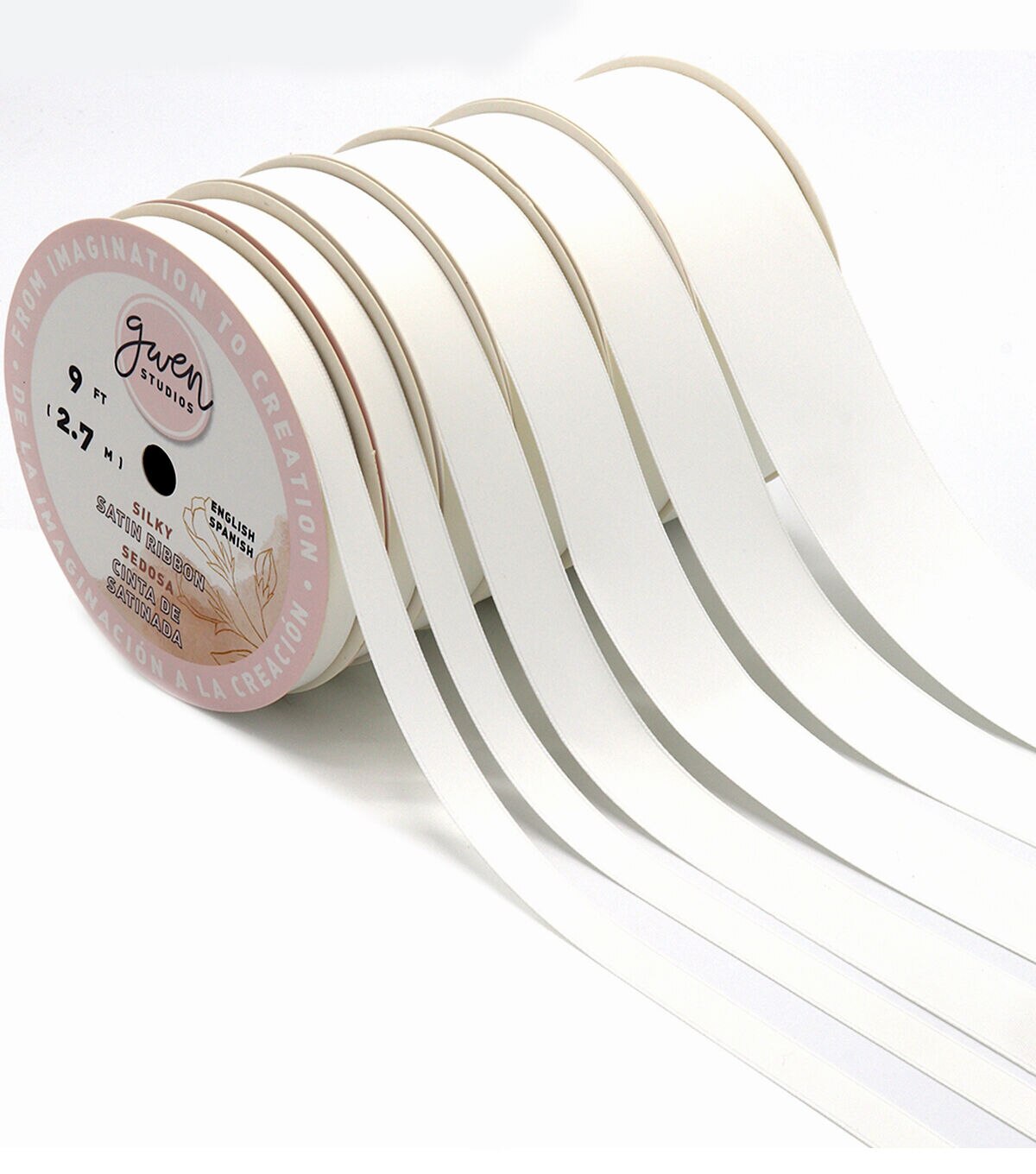Gwen Studios silky soft White Satin Ribbon comes 6 Spools for a total of 18 Yards. White Satin Ribbon Tower includes 4 widths of satin ribbon: 3/8" (6 Yards), 5/8" (3 Yards), 7/8" (6 Yards) and 1.5" (3 Yards). Our 100% Polyester Satin Ribbon has a silky sheen that's preferred for wedding projects, embroidery, sewing and crafts. Single Faced Satin is soft, light and luxurious enough to use for your most important projects, gifts and special occasions.