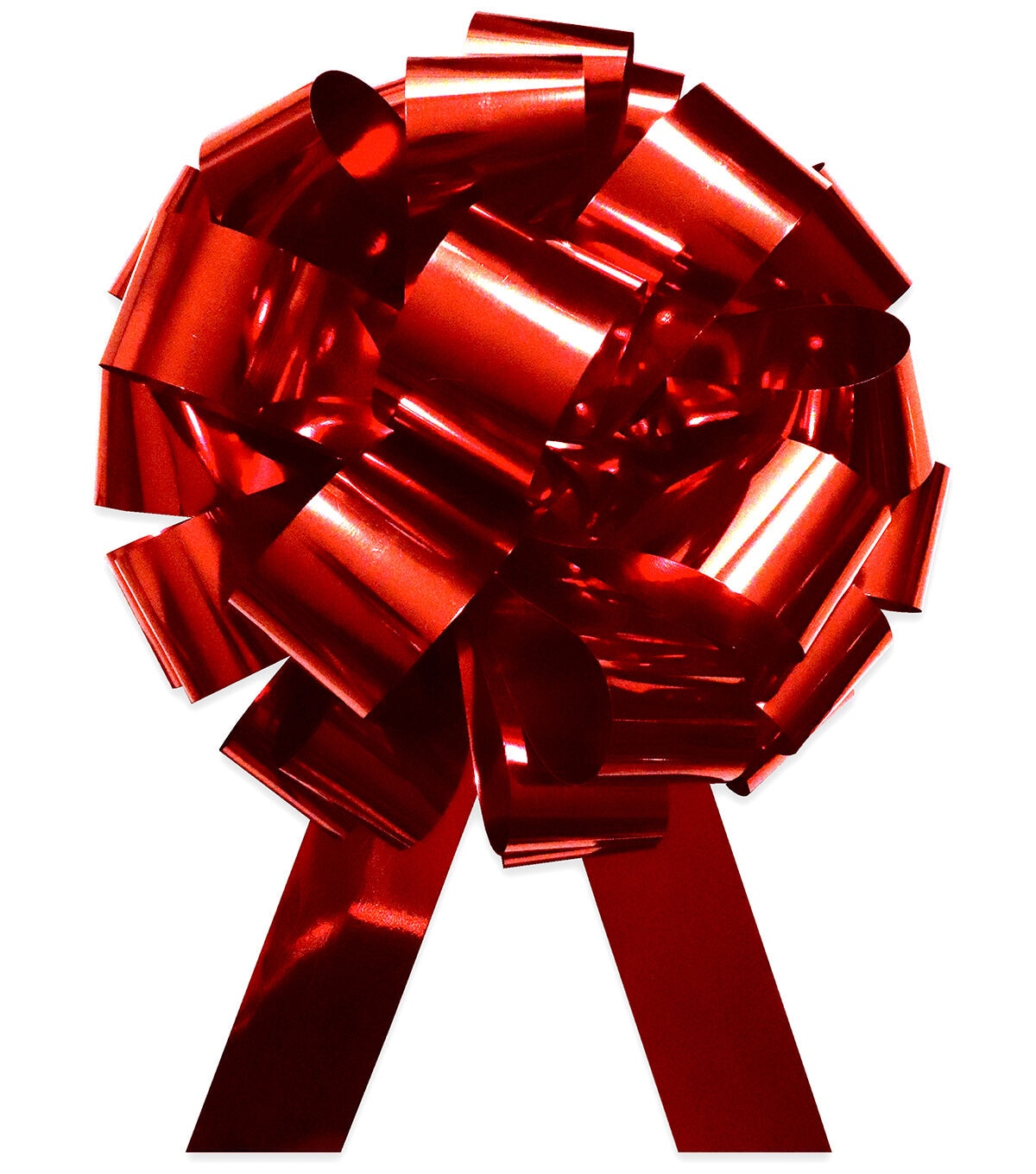 Our Gwen Studios Giant, 24" Red Car Bow for perfect for big presents, parties and celebrations. This big red bow pulls to open in less than 30 seconds! Shiny metallic bow ships flat, but quickly becomes a beautiful bow with 24 giant loops. Fully opened, Giant Red Gift Bow measures 24" wide x 12" high with 25' tails. Make your gift or special occasion stand out. From grand openings to graduations, holiday gifts to special presents, this Red Car Bow makes a huge statement! Red Car Bow is reusable and made of waterproof polypropylene ribbon, making it suitable for both indoors and outdoors gifts and events. Bow is made of extra wide ribbon but has 25' of strings that can be used to tie the bow onto a car, bike or present. For cars, the tails can be wrapped and tied under the car roof or hood. Car Bows are fun to use any time you want to make your gift or special event stand out! To expand Car Bow: Step 1. Find the two ribbon tails and using your thumb and forefinger, grasp the tails just under the plastic tab. Step 2. With the other hand, gently pull the tails away from the tab until the bow is fully open. Step 3. Tape or tie onto a car, wall, door or gift!