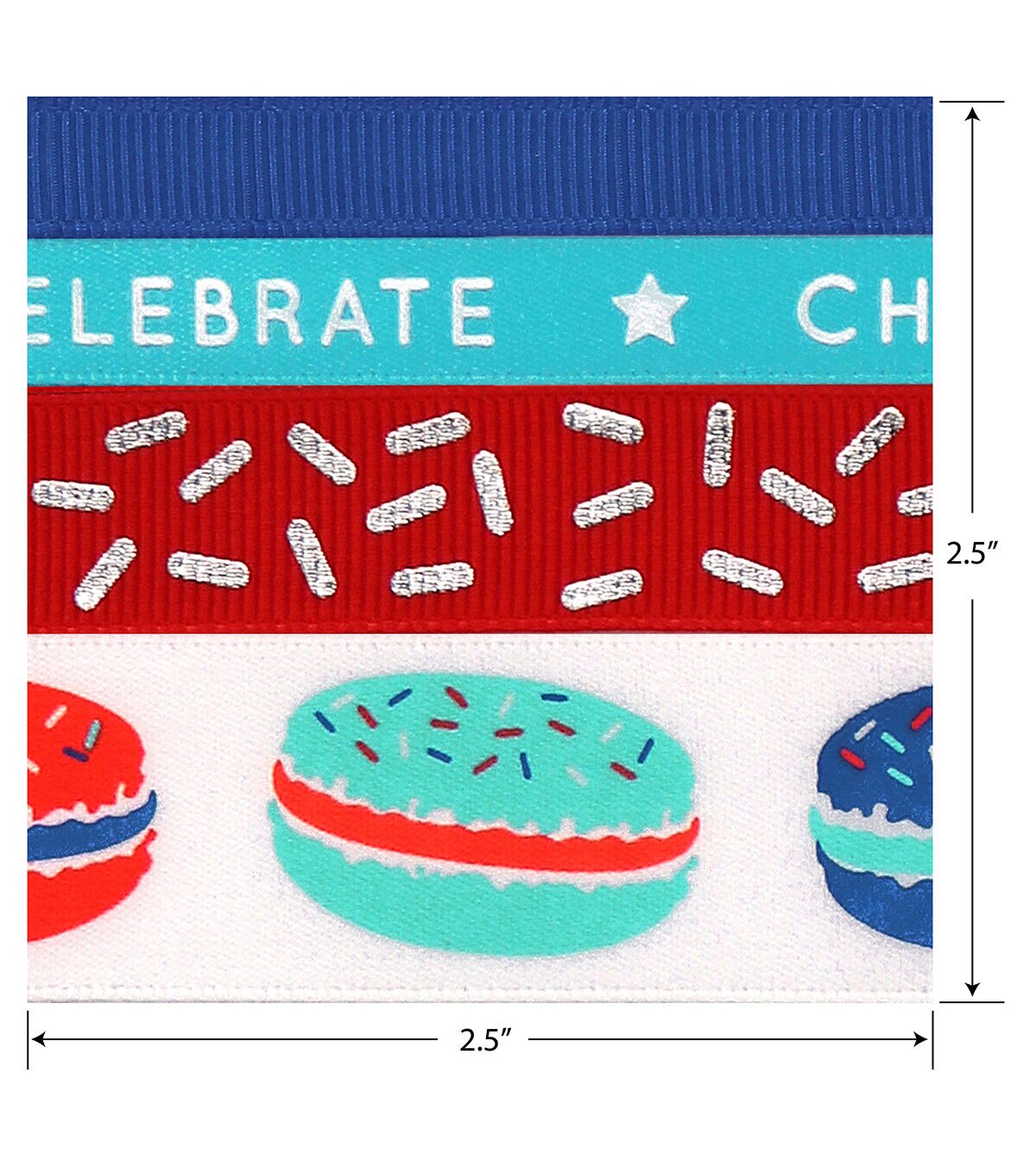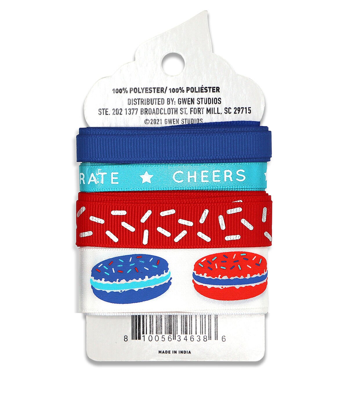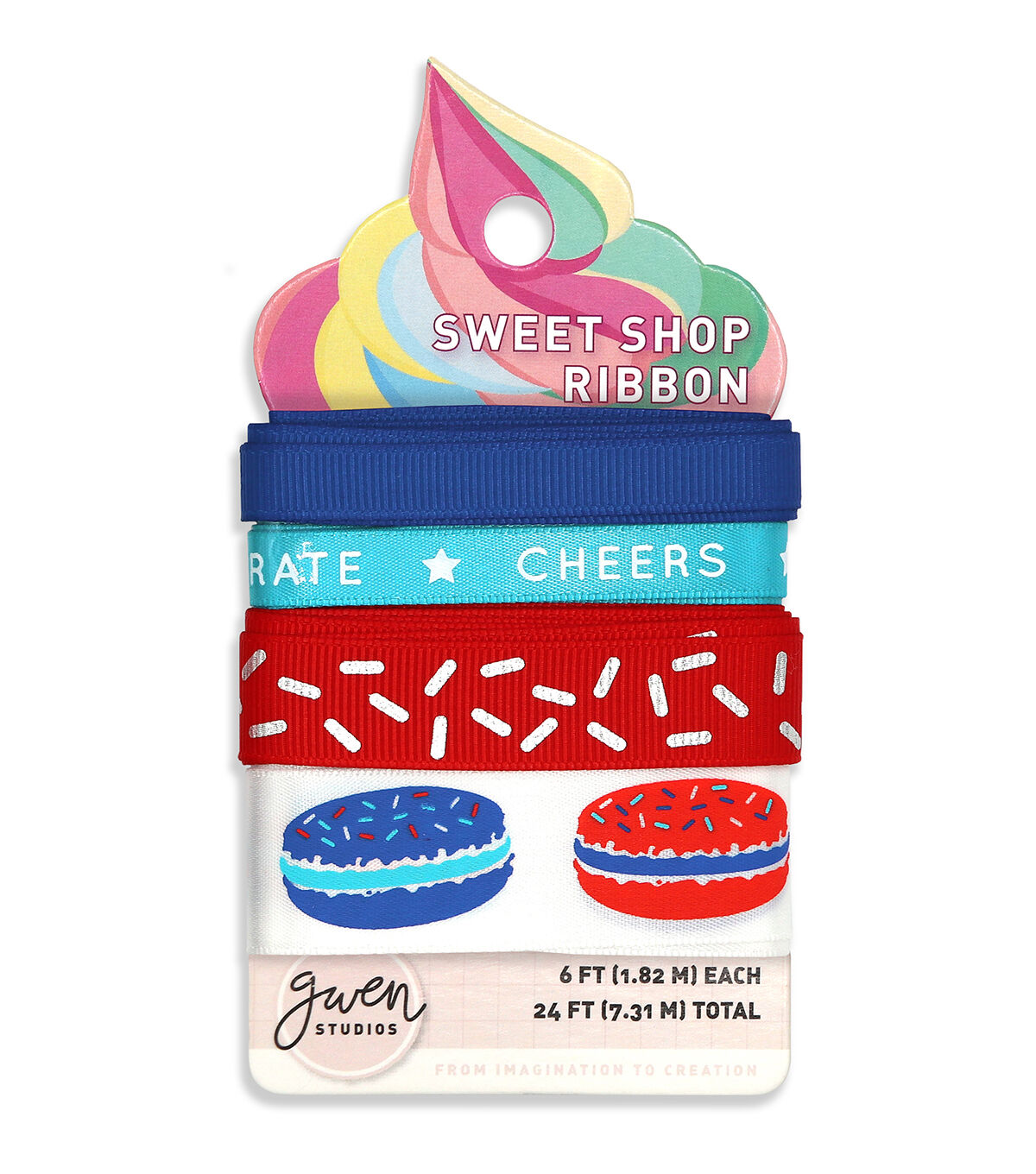 You'll love Gwen Studios Sweet Shop Patriotic red, white and blue printed ribbon. Satin and Grosgrain Ribbon come in 4 styles including adorable macaron printed ribbon. Ribbons are 3/8" or 5/8" wide for a total of 8 Yards. Decorate crafts, sweet treats and gifts with this adorable collection. Washable 100% Polyester Grosgrain and Satin Ribbon can be used for hair bows, sewing crafts and more.