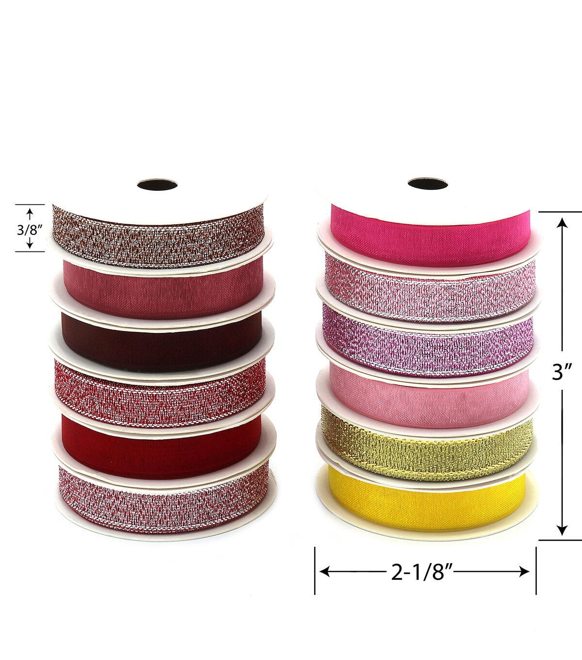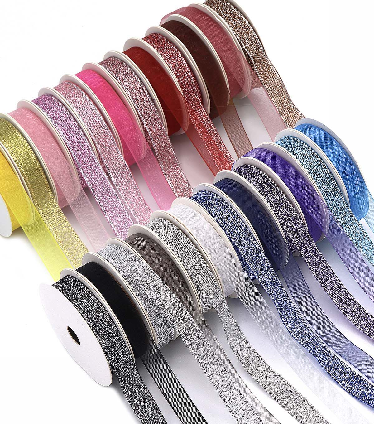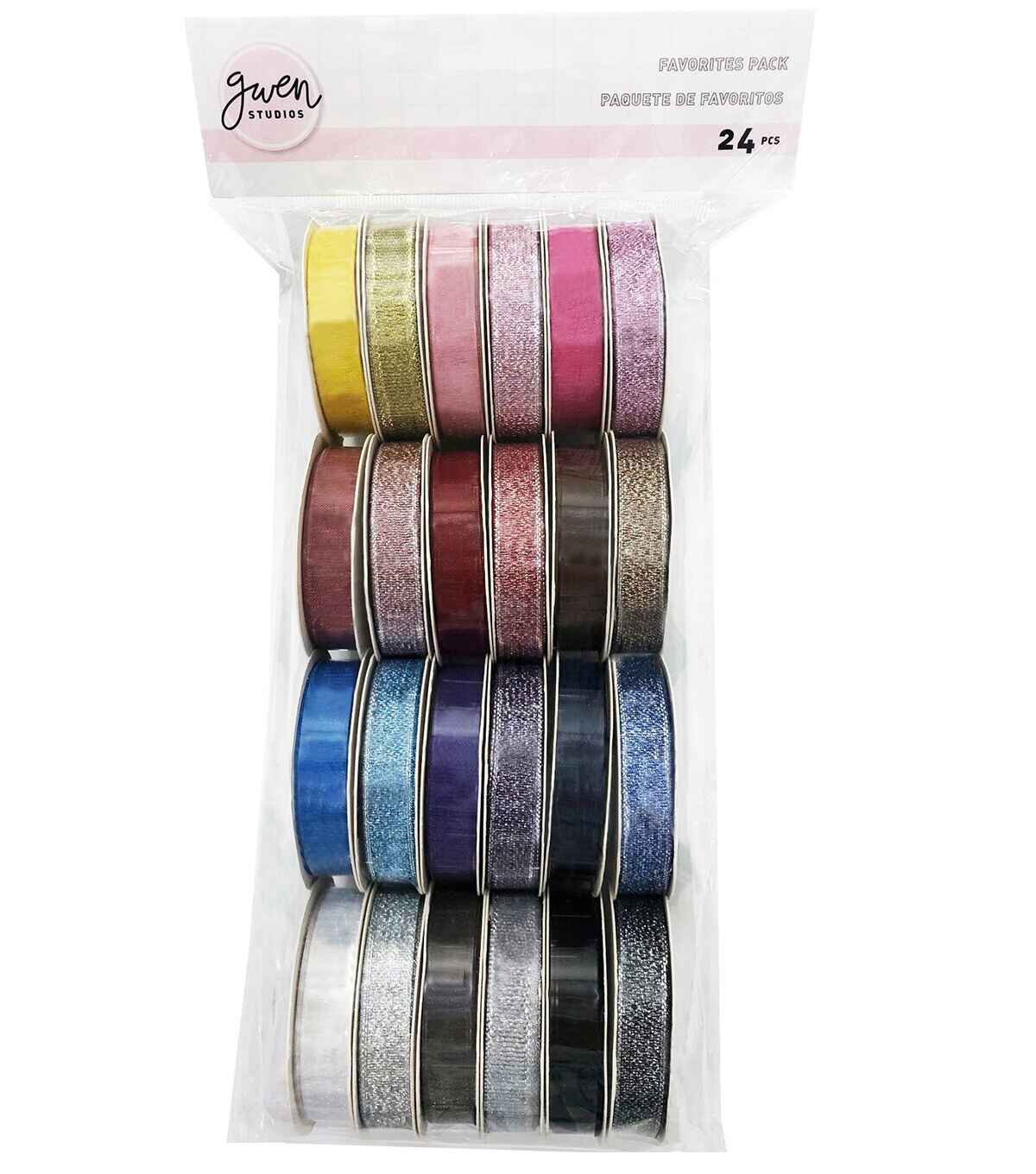 Gwen Studios Sheer and Metallic Ribbon Pack is perfect for gift wrapping and crafts. Assorted Ribbon Pack includes beautiful Sheer and Metallic Ribbon in 24 Shades. Elegant, sparkly 24-pack of ribbon comes on convenient 2-Yard Spools (48 yards total). 3/8" Ribbon colors include shades of Yellow, Gold, Pink, Red, Blue, Brown, Purple, Silver, White and Black. With this many colors, you'll have the perfect ribbon for any occasion or project!