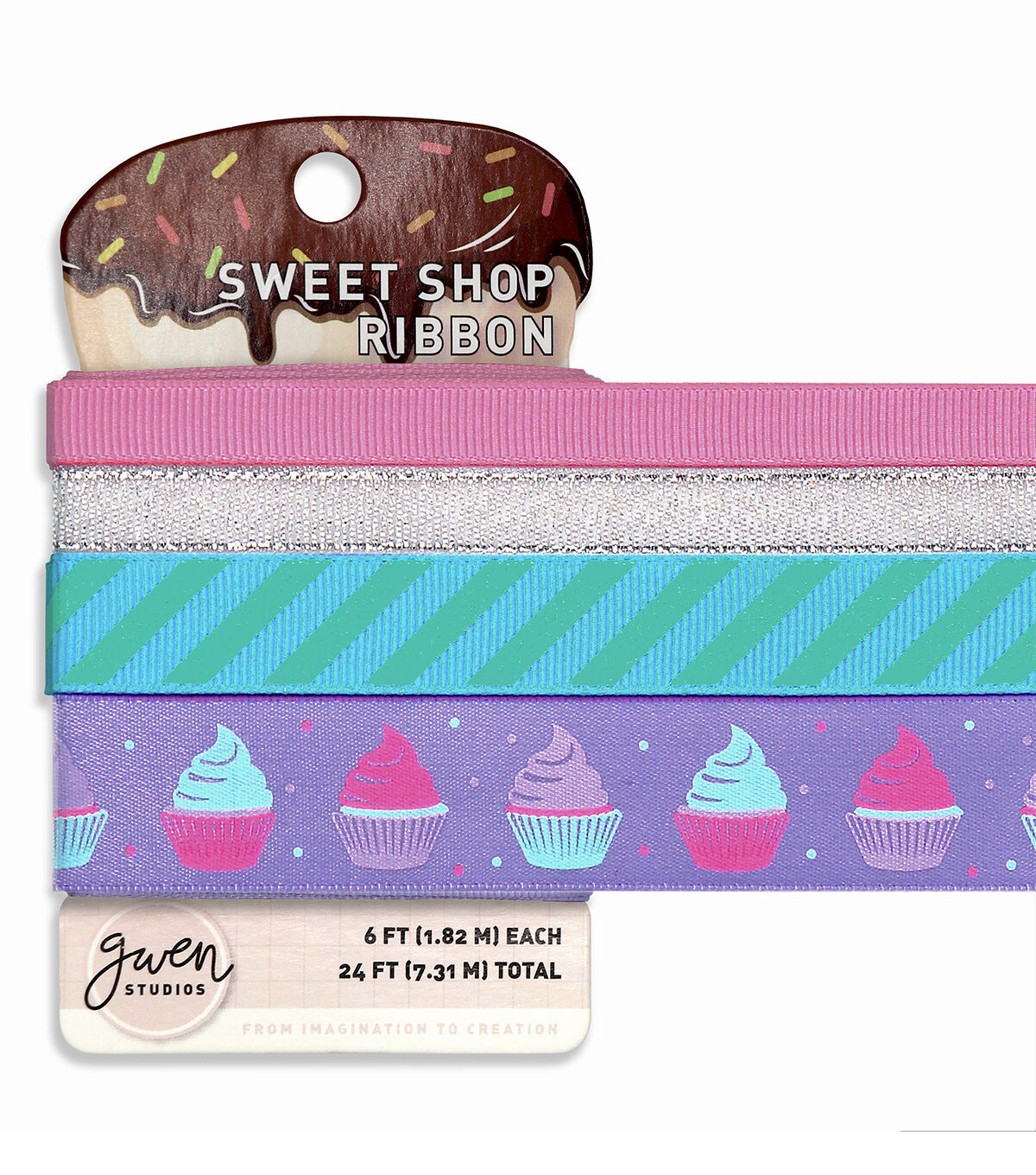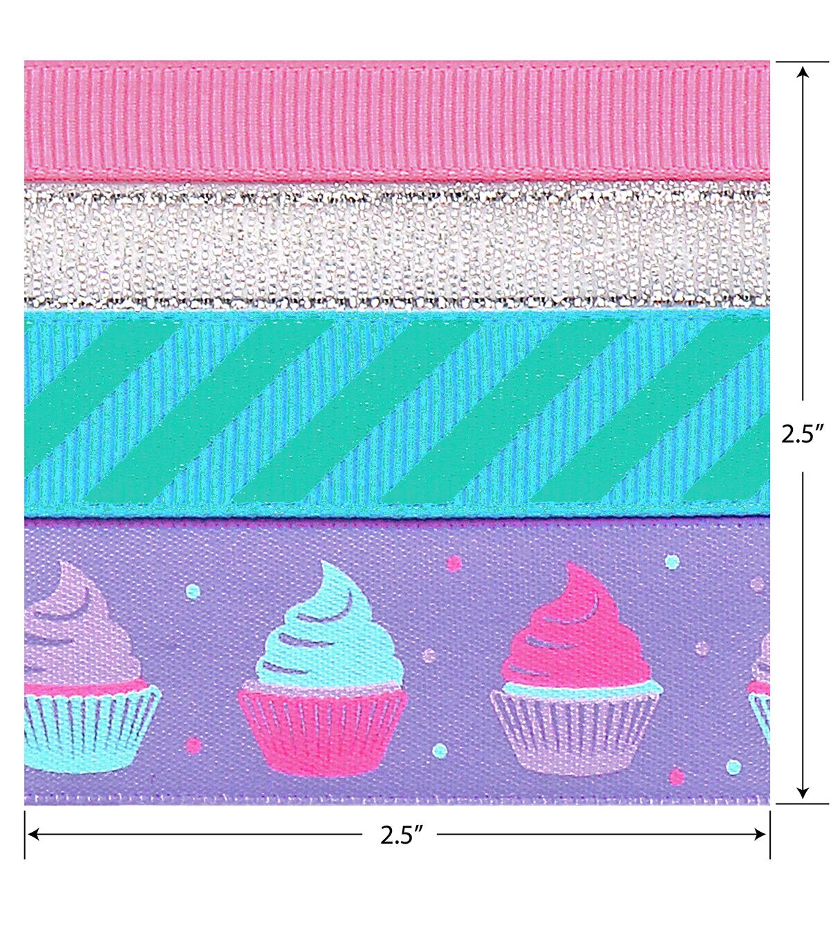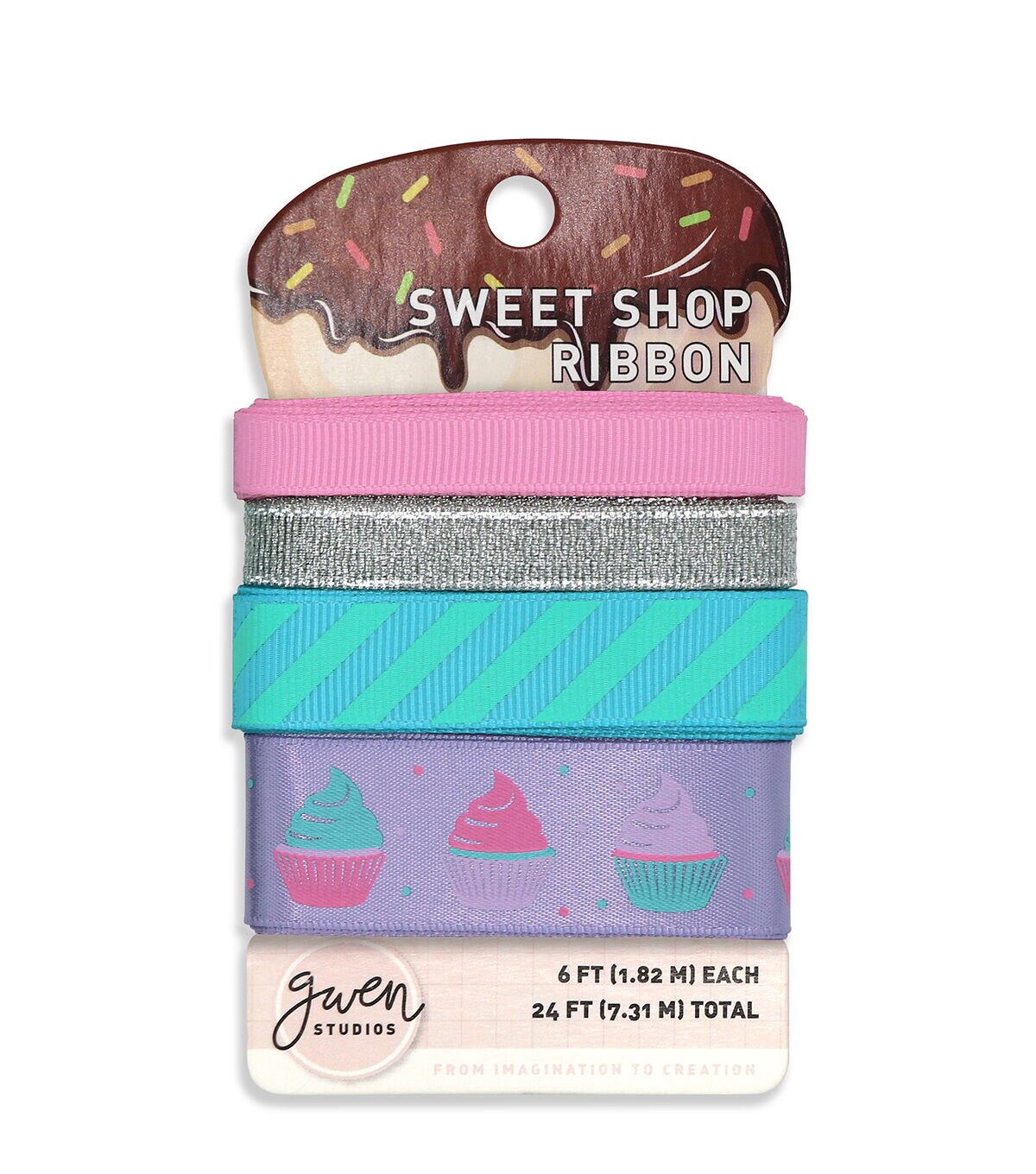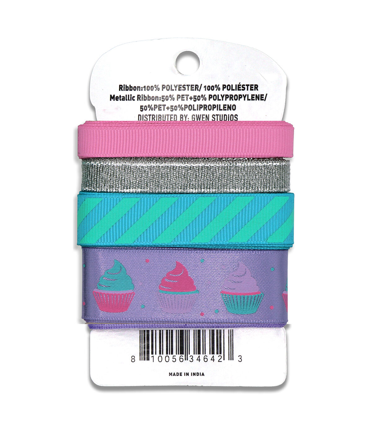 You'll love Gwen Studios Sweet Shop pink, silver and teal printed Ribbon. Satin and Grosgrain Ribbon come in 4 styles including adorable cupcake printed ribbon. Ribbons are 3/8" or 5/8" wide for a total of 8 Yards. Decorate crafts, sweet treats and gifts with this adorable collection. Washable 100% Polyester Grosgrain and Satin Ribbon can be used for hair bows, sewing crafts and more.
