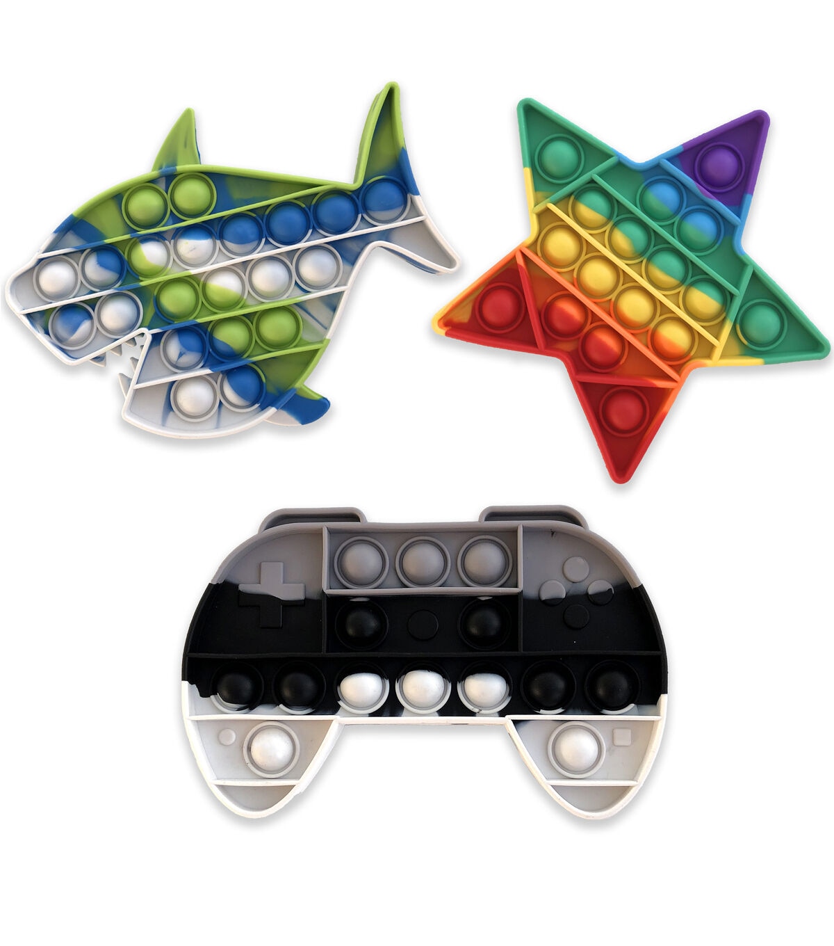 This set of 3 Gotta Pop fun, shaped Bubble Pop It Fidget Toys makes thoughtful party favors or stocking stuffers! Includes 3 Bubble Pop It Toys: Star, Shark and Game Controller shapes. Bubble Pop It Toys are a great way for kids and adults to relieve stress manage anxiety and maintain focus. Used as a game, it also exercises mathematical thinking and reasoning. For a game, take turns seeing who can pop the most un-popped bubbles in a row, and do not be the player to pop the last bubble. Gotta Pop Fidget Toys are made of soft, washable silicone. Perfect for school, travel, car rides and the office.