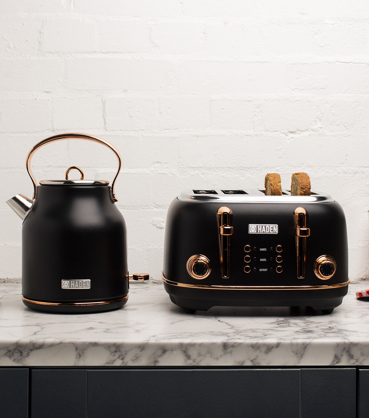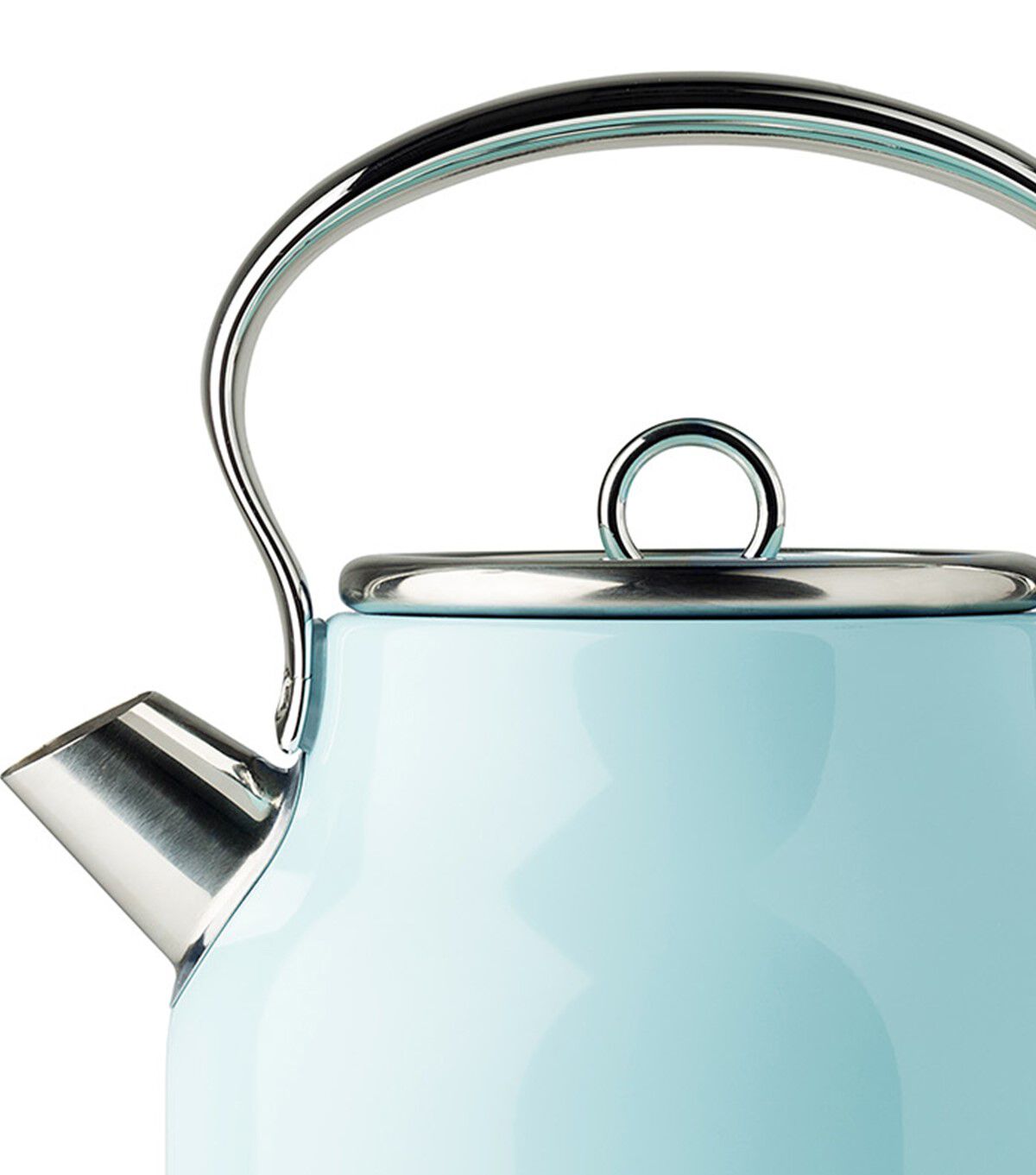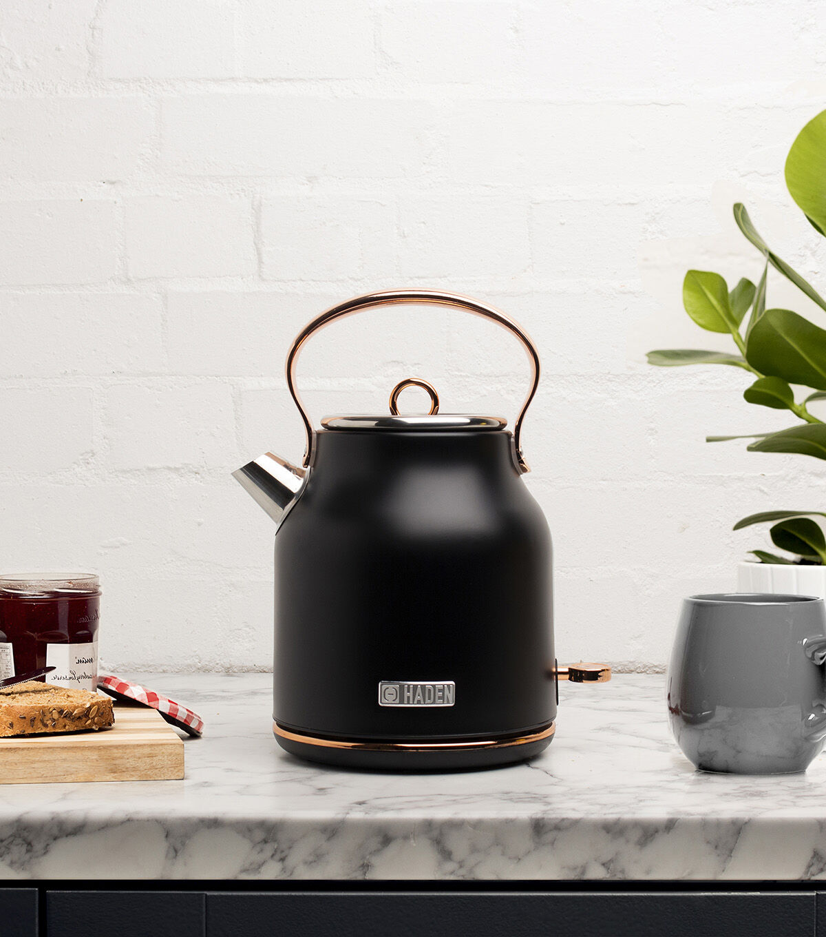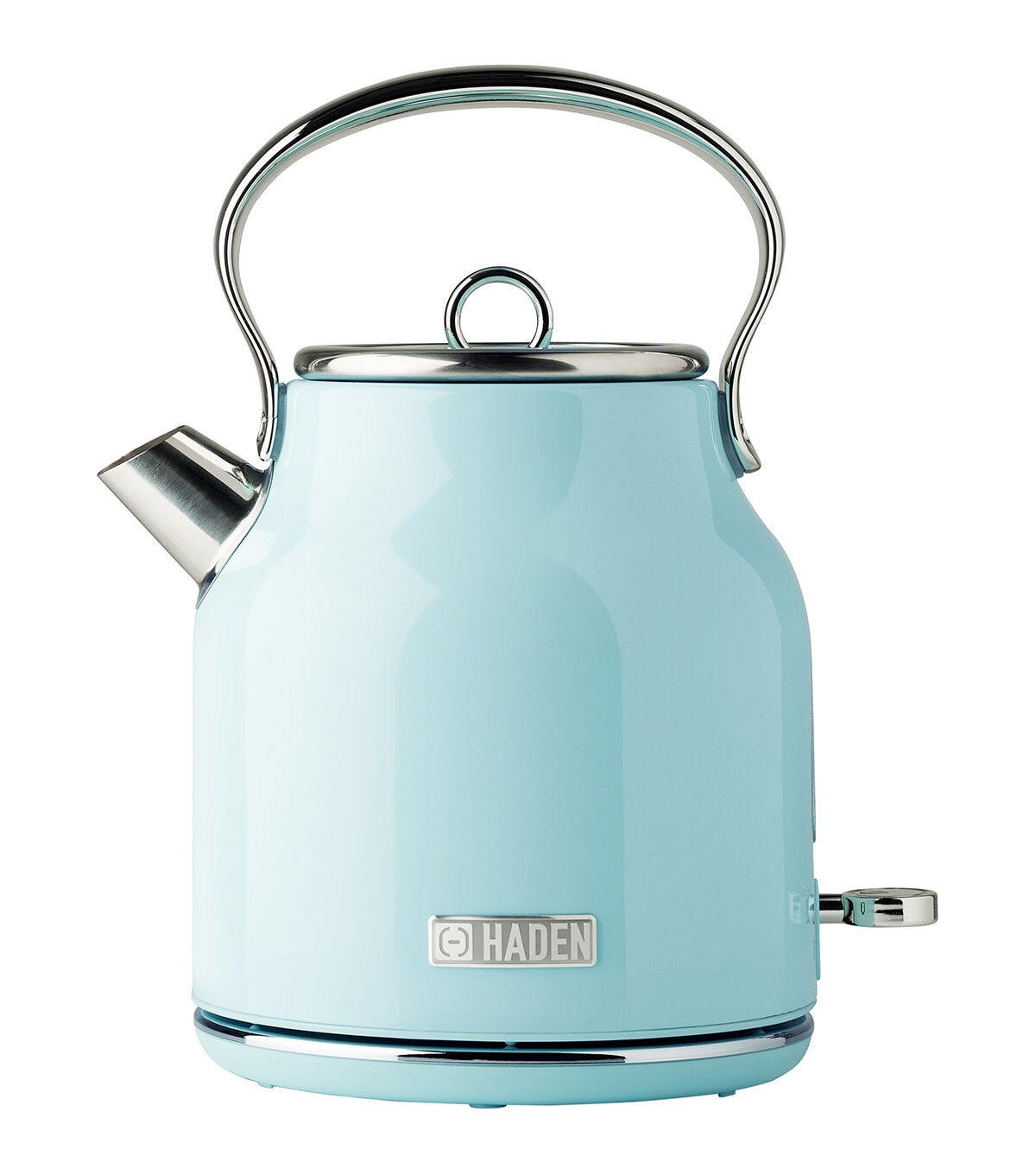 The classic shape of the Heritage electric kettle by HADEN offers a 1.7-Liter (7 cups) capacity, water level window, power light indicator, and a spare filter. The cordless design makes it easy to maneuver. The boil-dry protection feature ensures that the kettle will not turn on if no water is inside. The retro design pops with classic colors or modern finishes. Shop the complete collection for more colors and products.