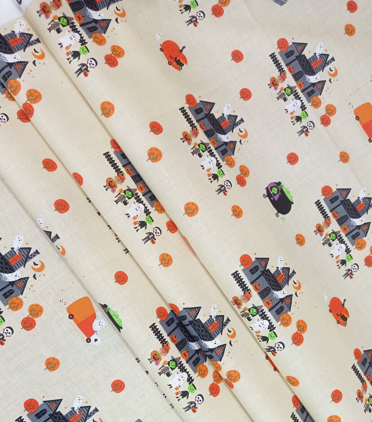 • Halloween Haunted House on White Cotton Fabric