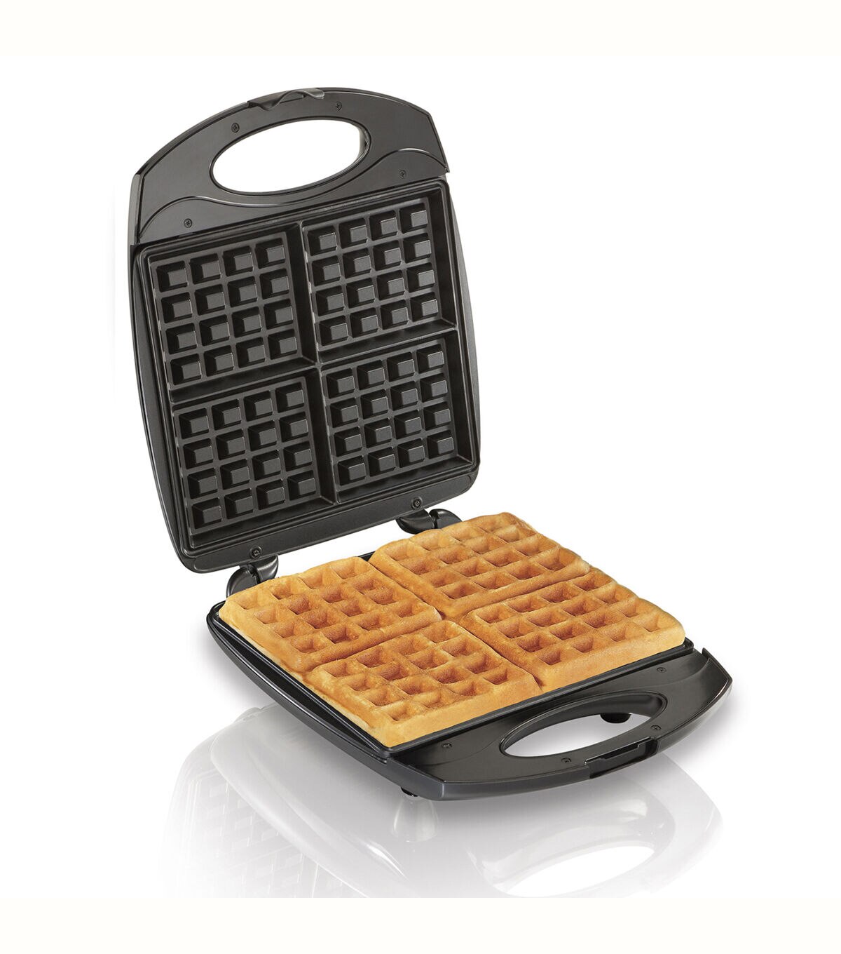 - Easy-clean nonstick grids make 4 waffles