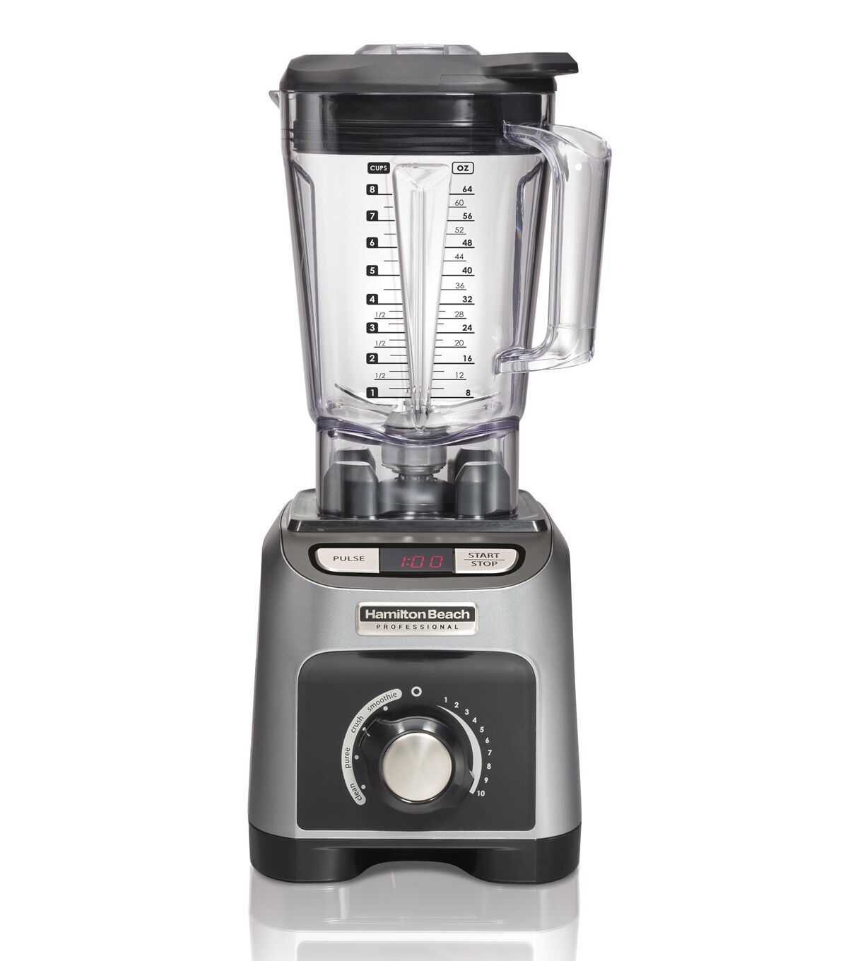 A professional blender with a 1800-watt and 2.4 HP motor. Stainless steel blades rotate over 140 MPH. Evenly blends smoothies juices blends whole fruits soups and more. 4 One-touch program settings: Smoothie Ice crush Puree and Clean. Variable-Speed dial. Thermal-protected motor. Rubber mounted components. Comes with a tamper to help blend thicker and more dens ingredients. Easy-pour measuring cap. BPA-free and shatterproof 64z jar. Dishwasher safe parts. 5-Year manufacturer limited warranty. Dimensions: 17.72''H x 7.09''W x 8.66''D.