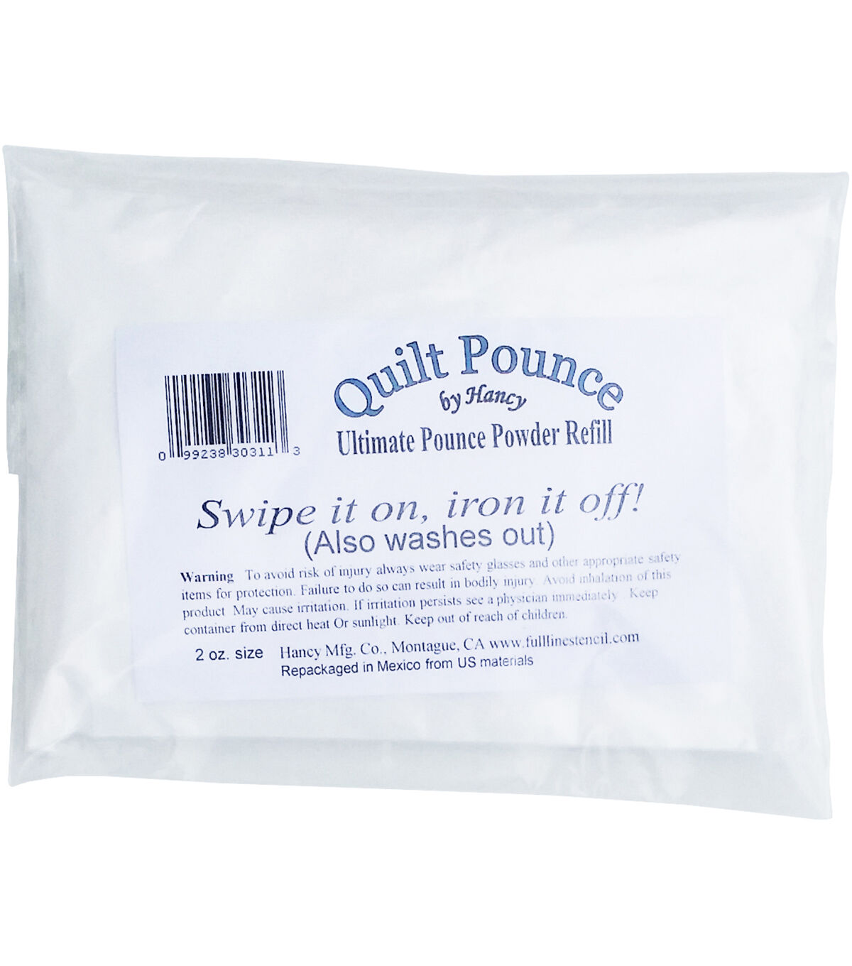 Use the Full Line Stencil Ultimate Quilt Pounce Chalk Powder Refill - White with your quilt marking tools to transfer any size and variety of stencils onto fabric. This pounce chalk refill bag easily fits within the marking tool and lasts for markings multiple stencil designs. Simply wipe the filled marking tool over the stencil to quickly transfer the design onto the fabric. The pack includes two ounces of non-toxic pounce powder refill.