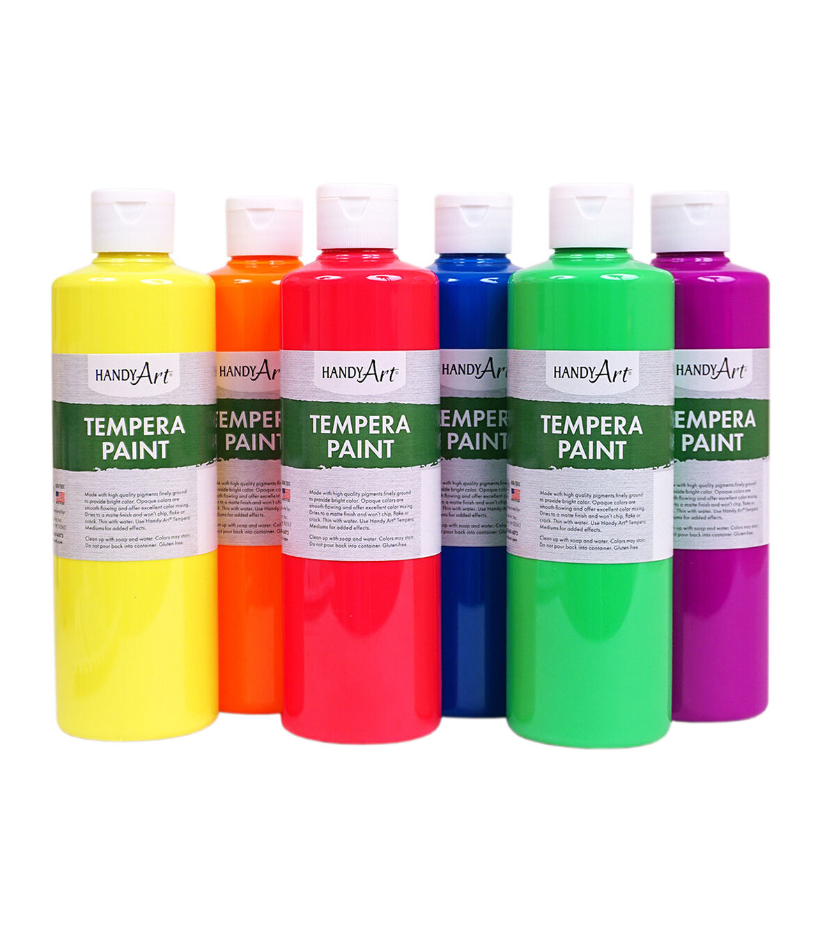 Handy Art Fluorescent Tempera Paint offers excellent opacity and coverage and adds a luminous neon gleam on art, craft and school projects! These creamy temperas can be used on surfaces such as paper, poster board, cardboard, wood and papier-mâché. Paint dries to a matte finish and won't chip, flake or crack when dry. Paint is non-toxic, water based and gluten-free and cleans up easily with soap and water. Made in the USA. Certified AP Non-Toxic. Set includes a pint each of: Fluorescent Yellow, Fluorescent Orange, Fluorescent Hot Pink, Fluorescent Blue, Fluorescent Green, and Fluorescent Violet.
