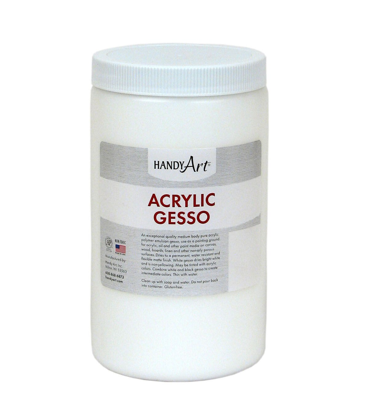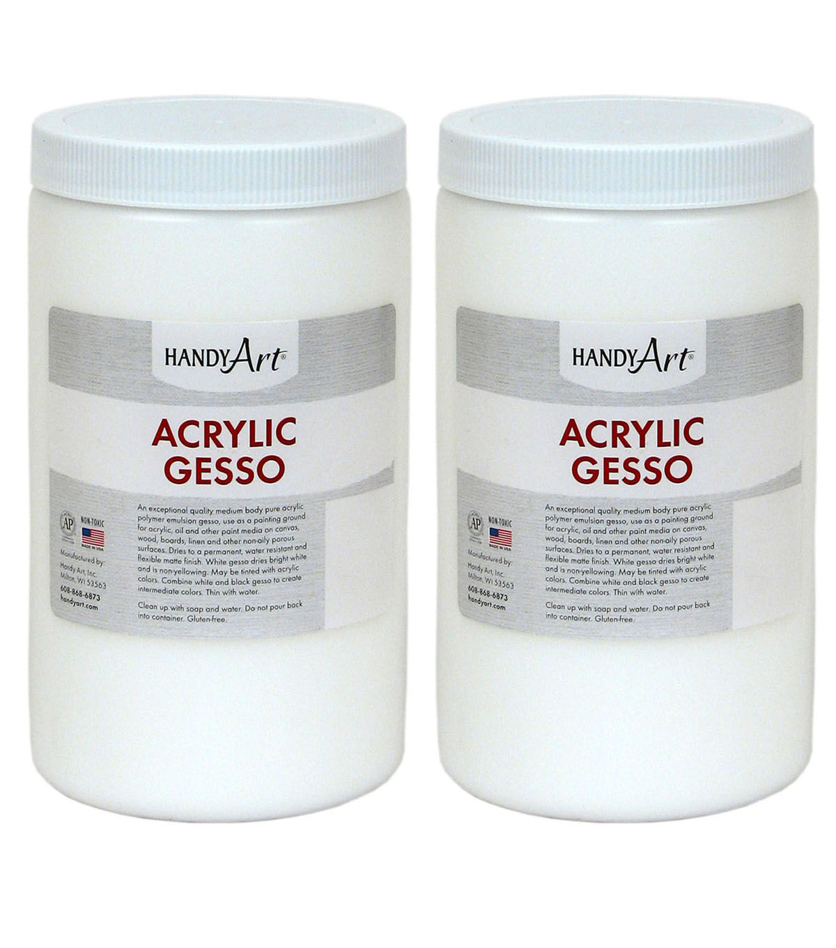 Handy Art Acrylic Black Gesso is an excellent quality student primer that dries to a flexible matte finish. Apply as an undercoating or primer to surface before painting to improve adherence. Clean up with soap and water. Certified AP Non-Toxic. Made in the USA. Each bottle includes 32 oz. Sold as a pack of 2 bottles.