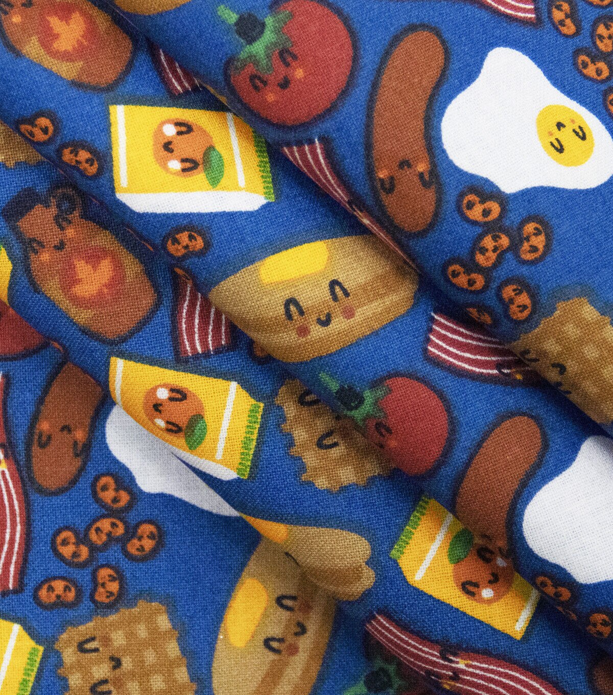 Make your mornings happier with our delightful Happy Breakfast Foods on Blue Novelty Cotton Fabric. This fabric features a charming print of pancakes, waffles, eggs, and bacon on a cheerful blue background. Perfect for creating aprons or other projects, this fabric is sure to brighten up your day.