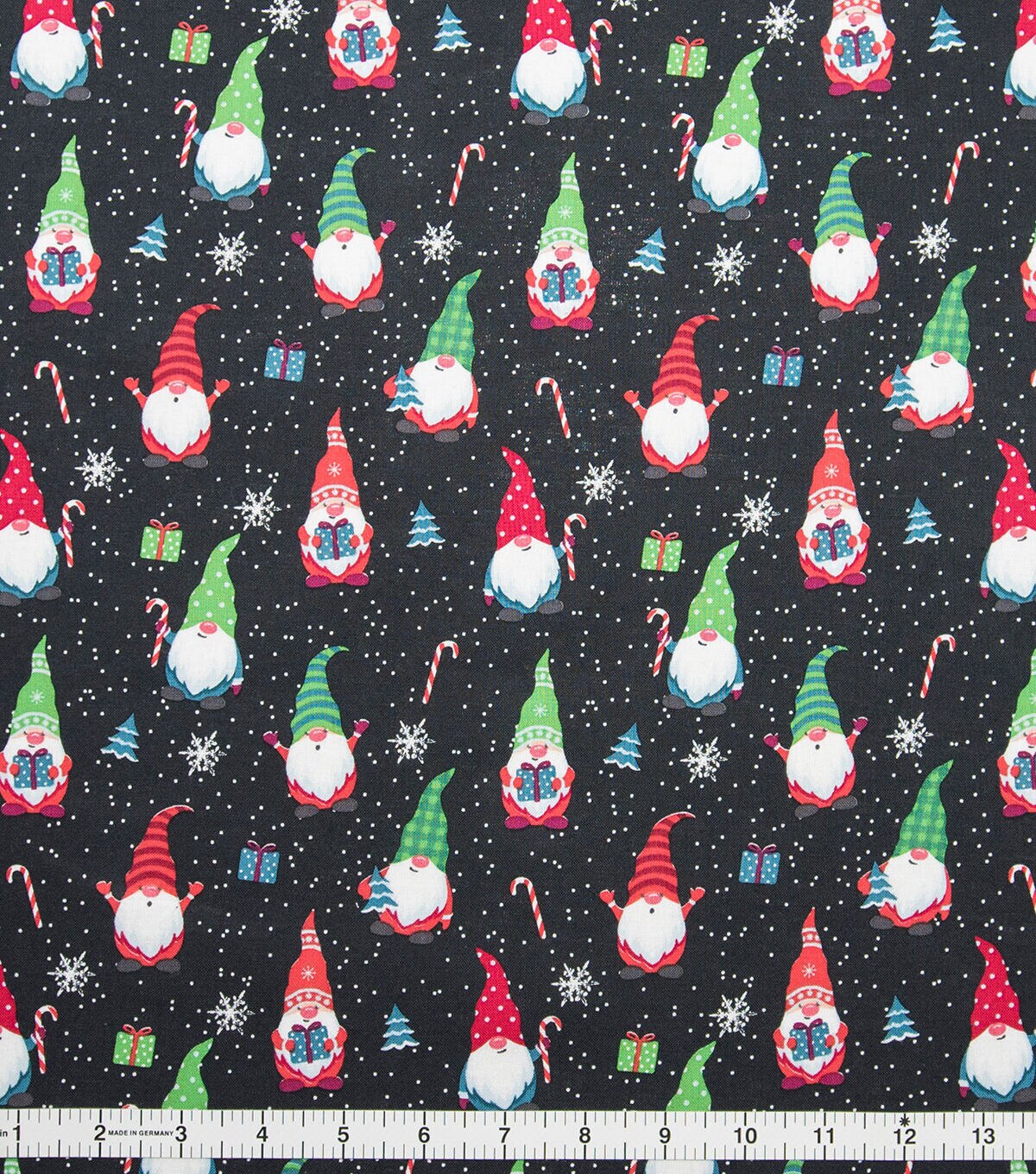 Happy Giving Gnomes on Black Christmas Cotton Fabric