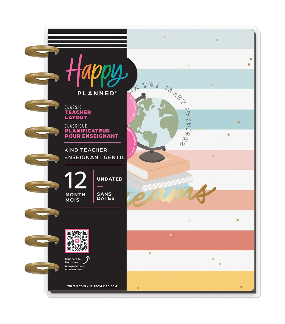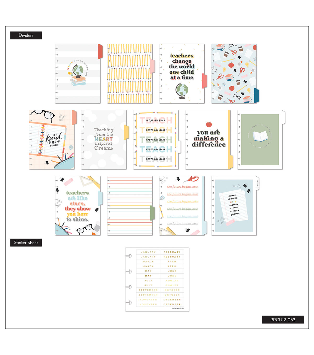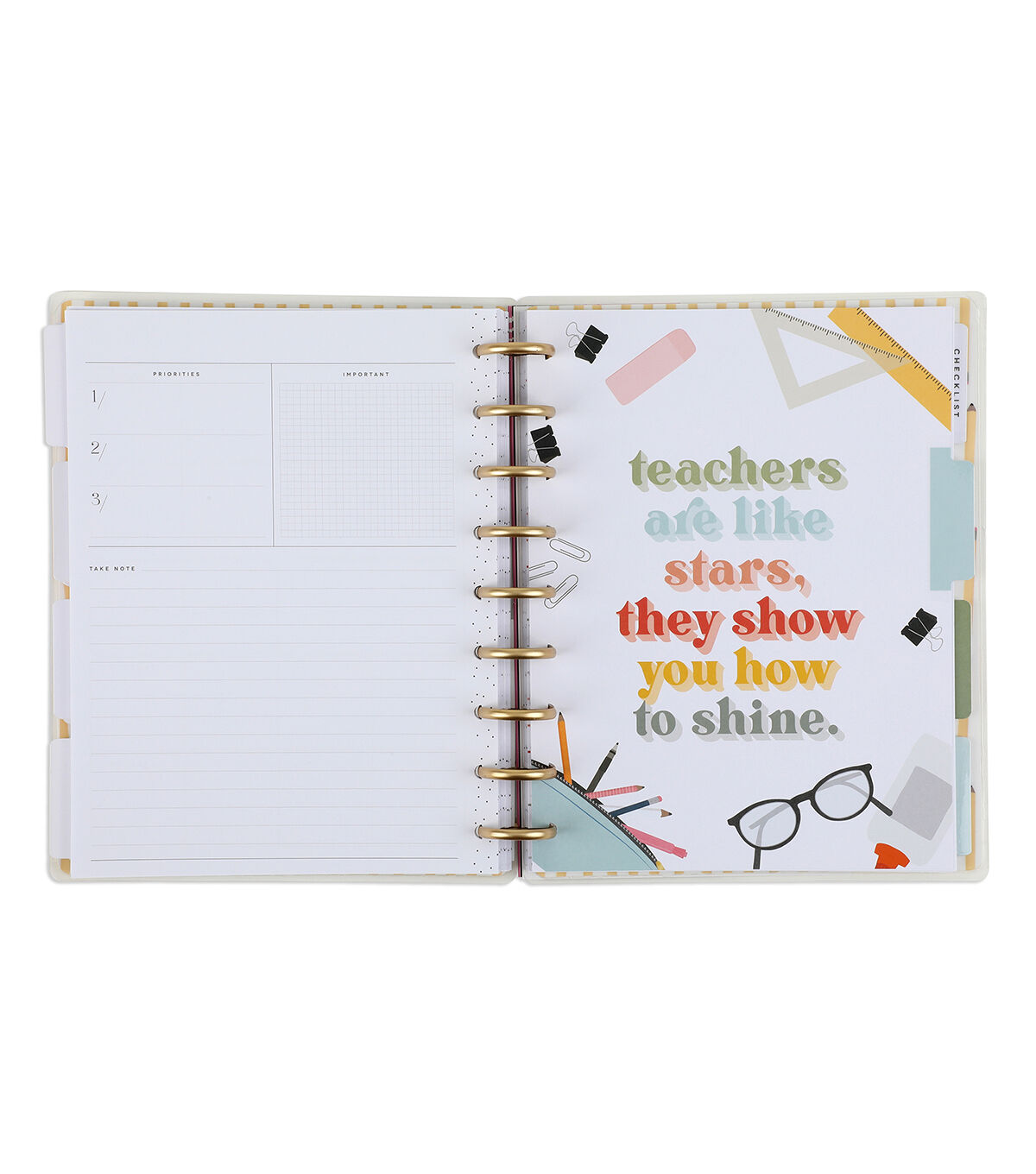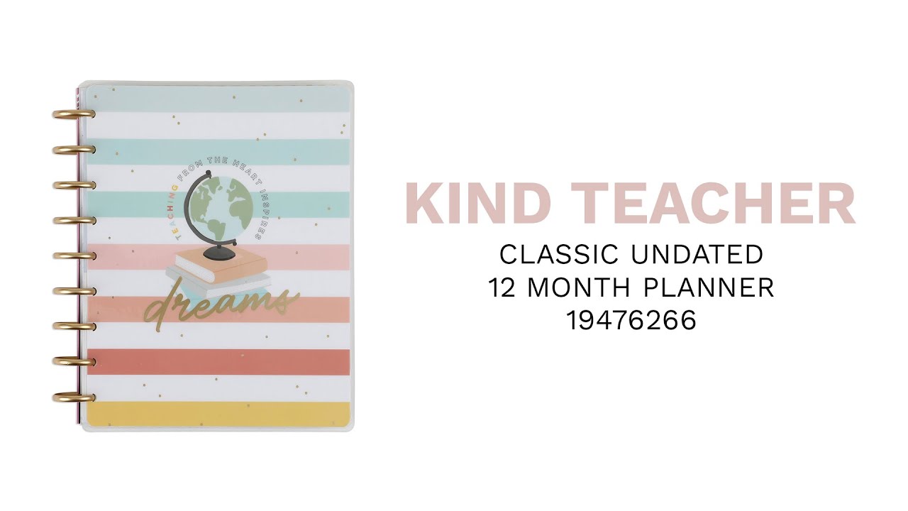 Teach from the heart. This Classic size Happy Planner is undated and can be started any time during the school year. It includes 12 months of calendars and weekly spreads. The teacher layout is formatted to help with classroom organization, lesson planning, and scheduling.