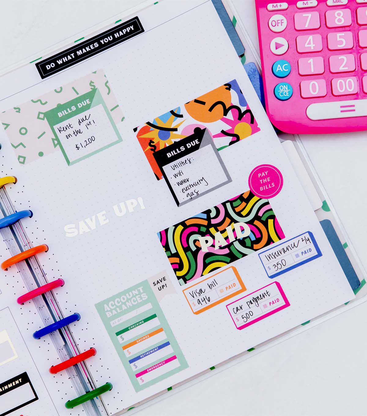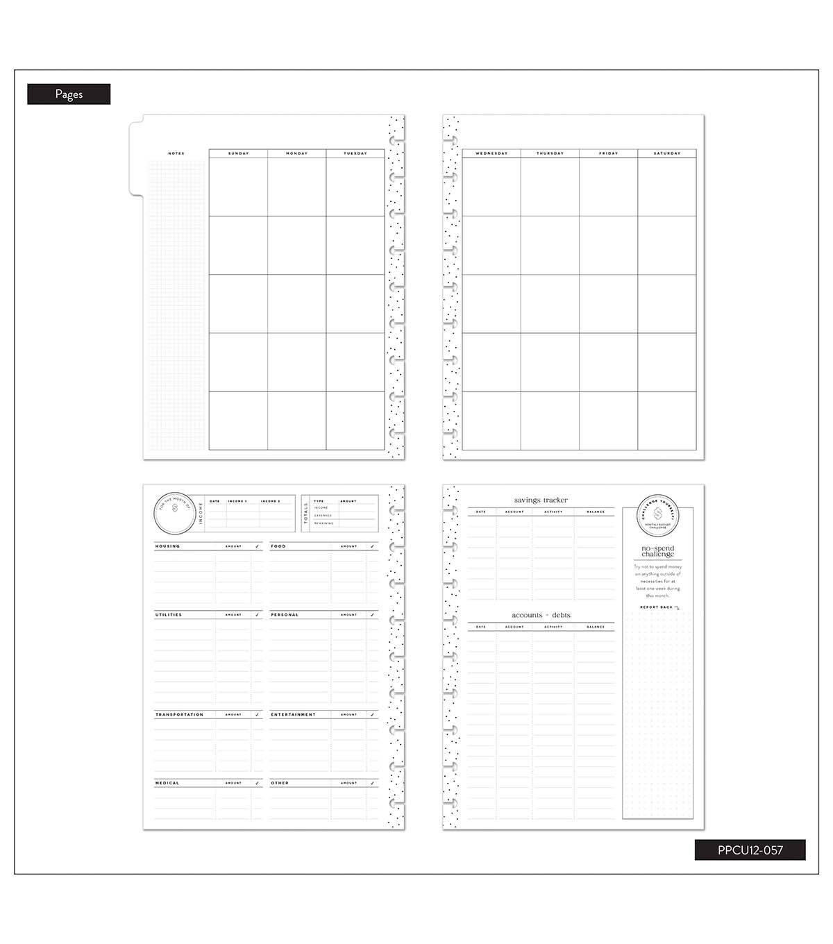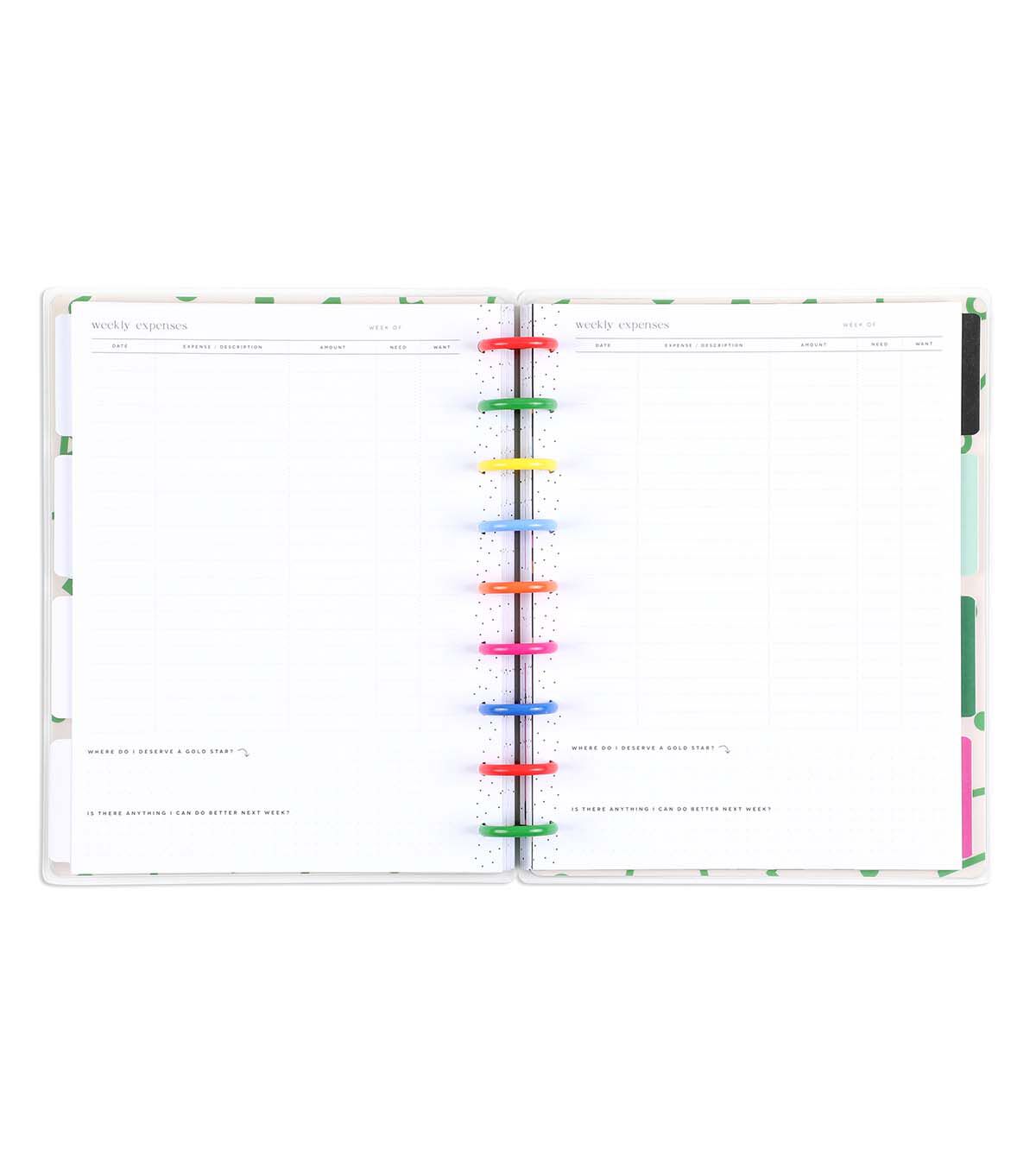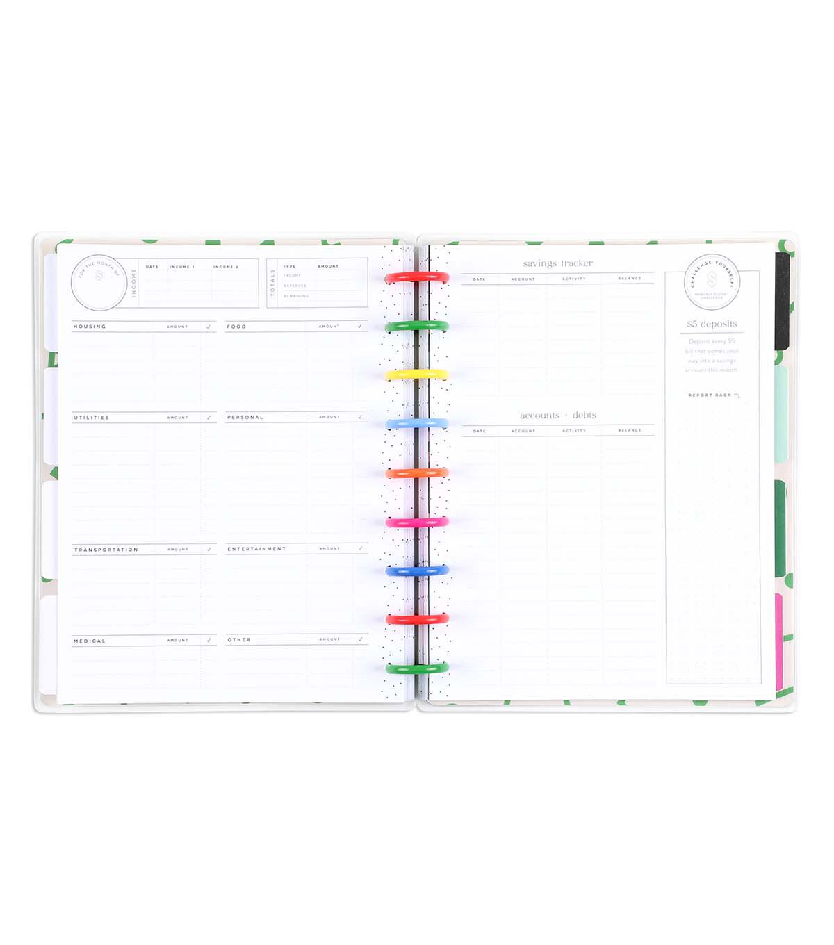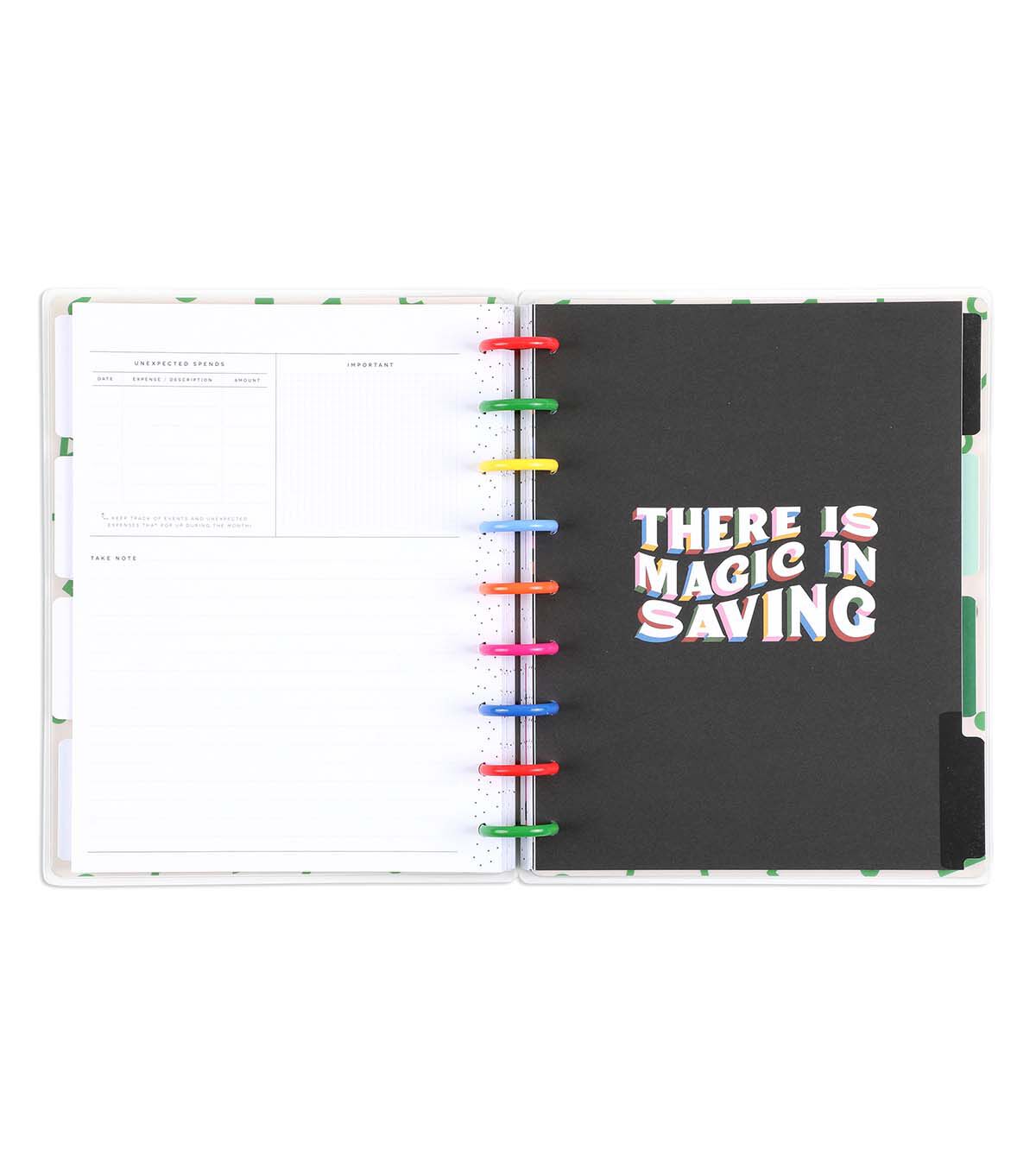 There is magic in saving. This Big size Happy Planner is the perfect guide for a beginner trying to monitor spending or the advanced saver who loves organization. This layout was specifically designed to help you save with weekly expense charts, sections for spending reflection and motivation. It has space to set and reflect on financial goals while monitoring unexpected expenses. Monthly calendar layouts with 12 dividers featuring whimsical prints, metallic foil accents, and money-motivated quotes to help you achieve your goals. Make planning your finances an exercise in creativity with this stand-out planner!