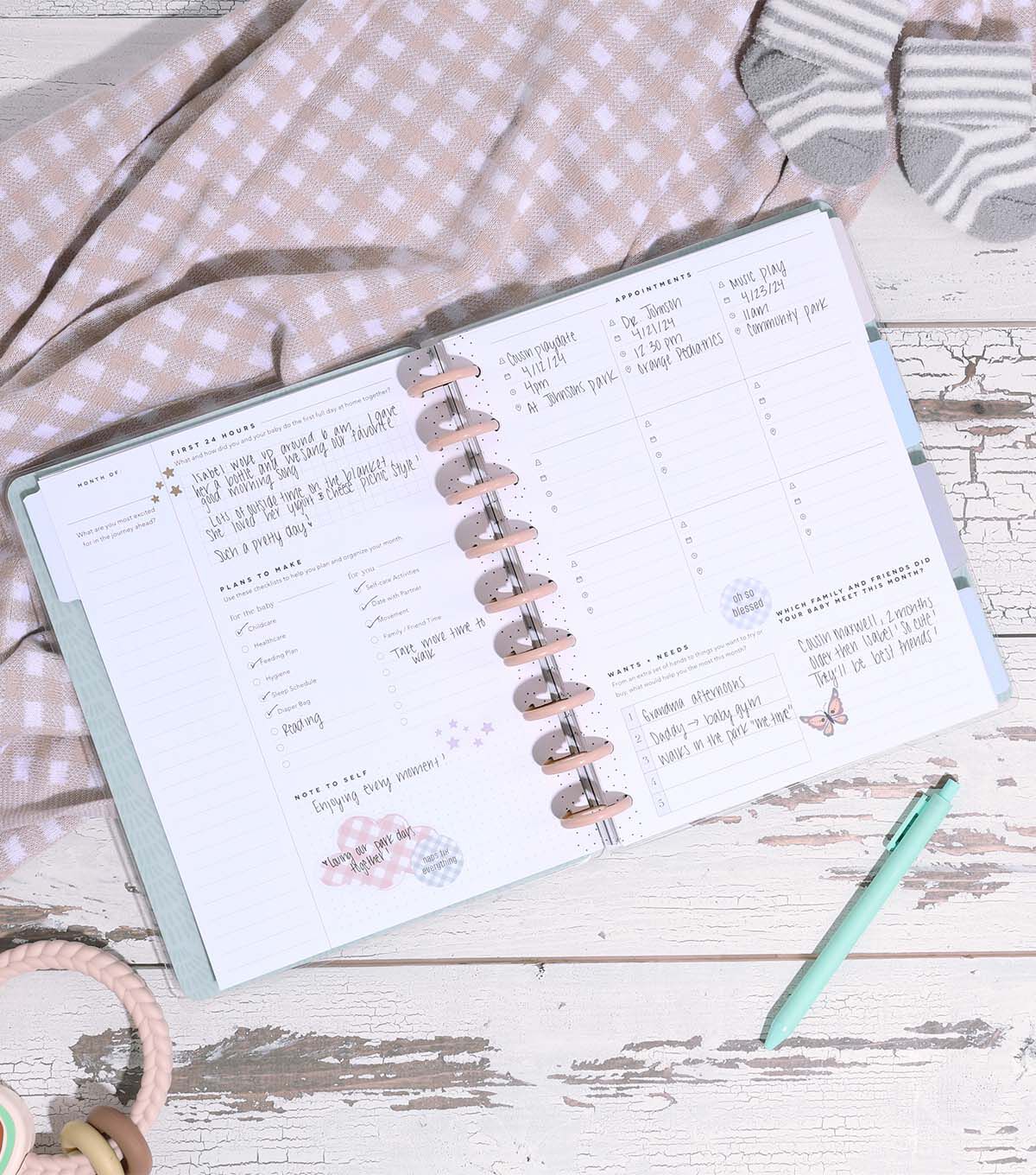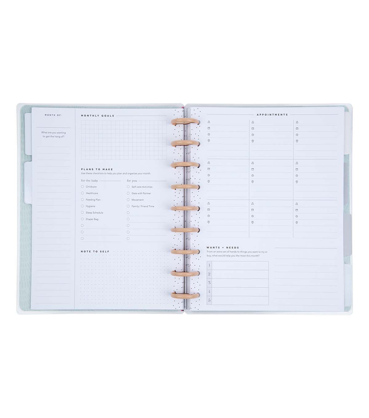 Little moments make lasting memories. Make a memorable and functional keepsake of the first 12 months with your baby. Practice self-care, affirm yourself daily, track habits, measure milestones, and plan for the first 24 hours and beyond with this unique planner layout for new parents! The dividers have affirming messages for you as you start your journey. Embrace the simple joys.