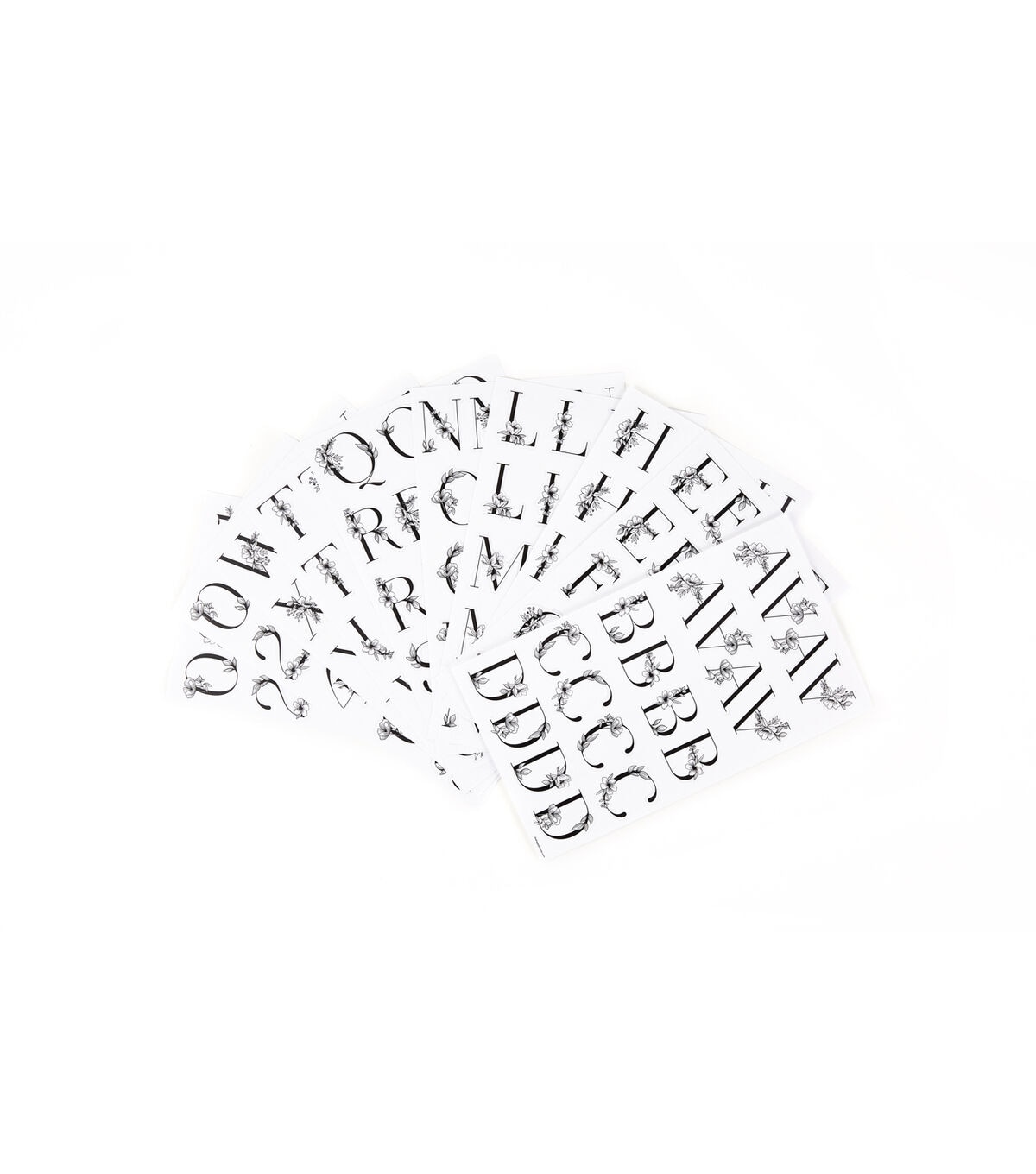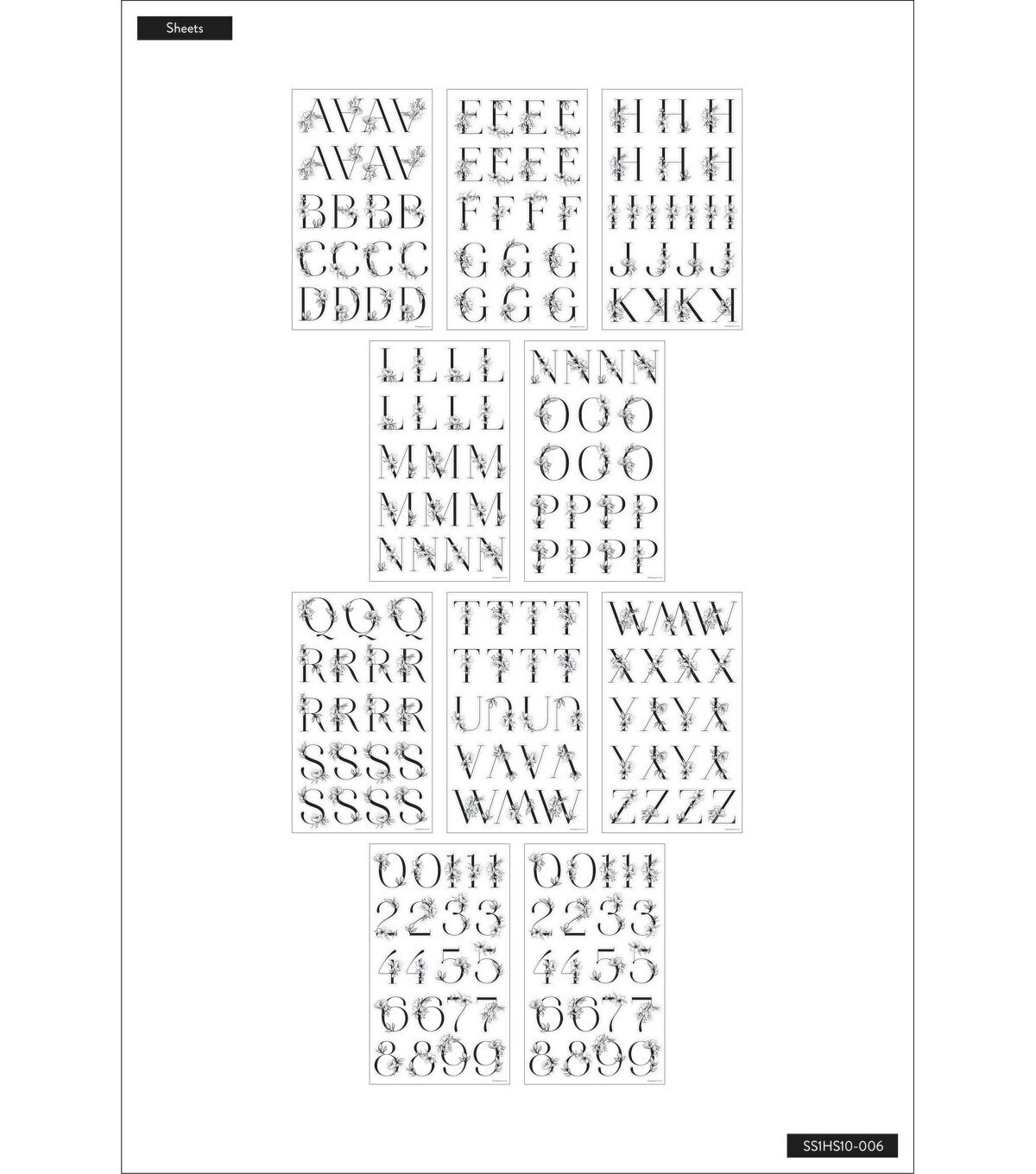 Spell out words, phrases and more with these sophisticated floral alphabet and numerical stickers. These large icons are ideal for signs, whiteboards or scrapbooking, just peel and stick! This set includes 10 sheets with 194 individual stickers.