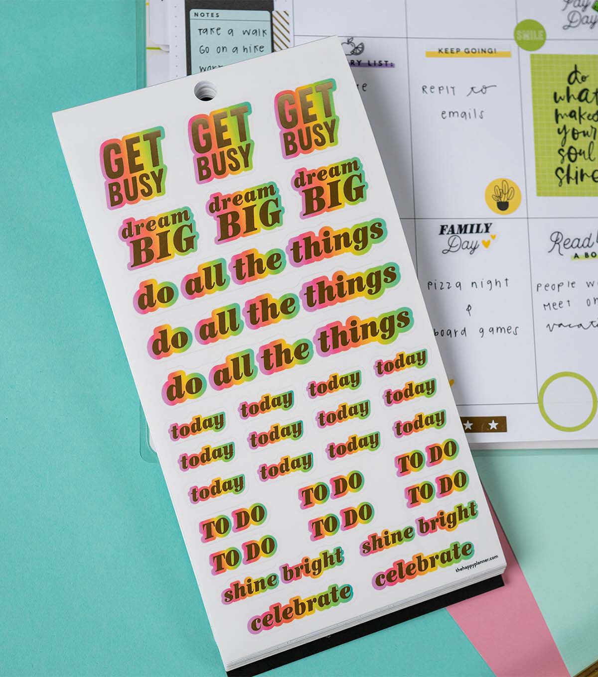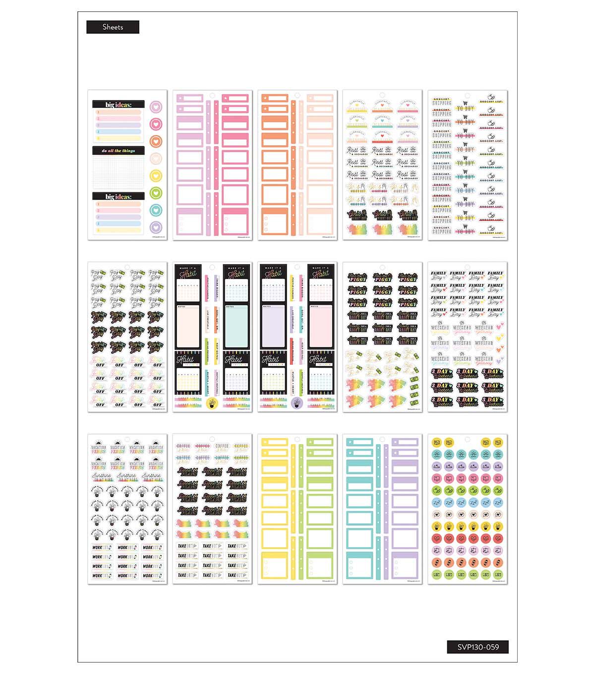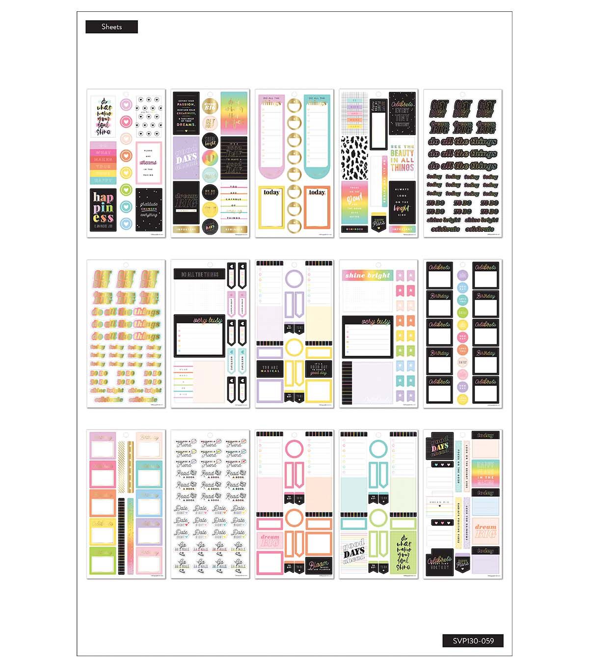 This Happy Plans sticker back features all the basic for making your most positive plans. The bright colors will lighten up any layout in your Happy Planner or notebook. Add to bullet journals to create completely customized plans. Make your plans work for you with stickers created especially for your favorite disc bound planning system.
