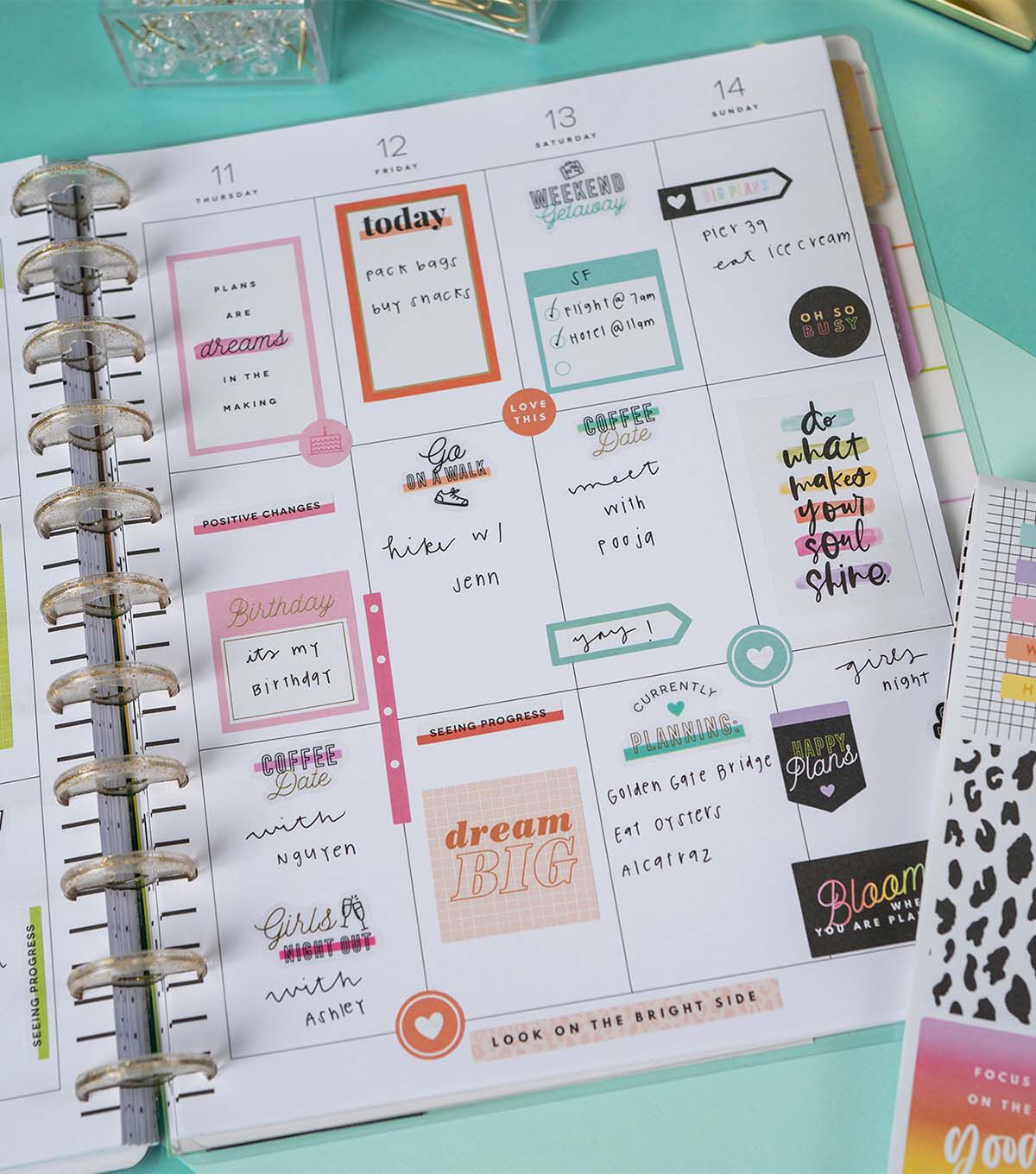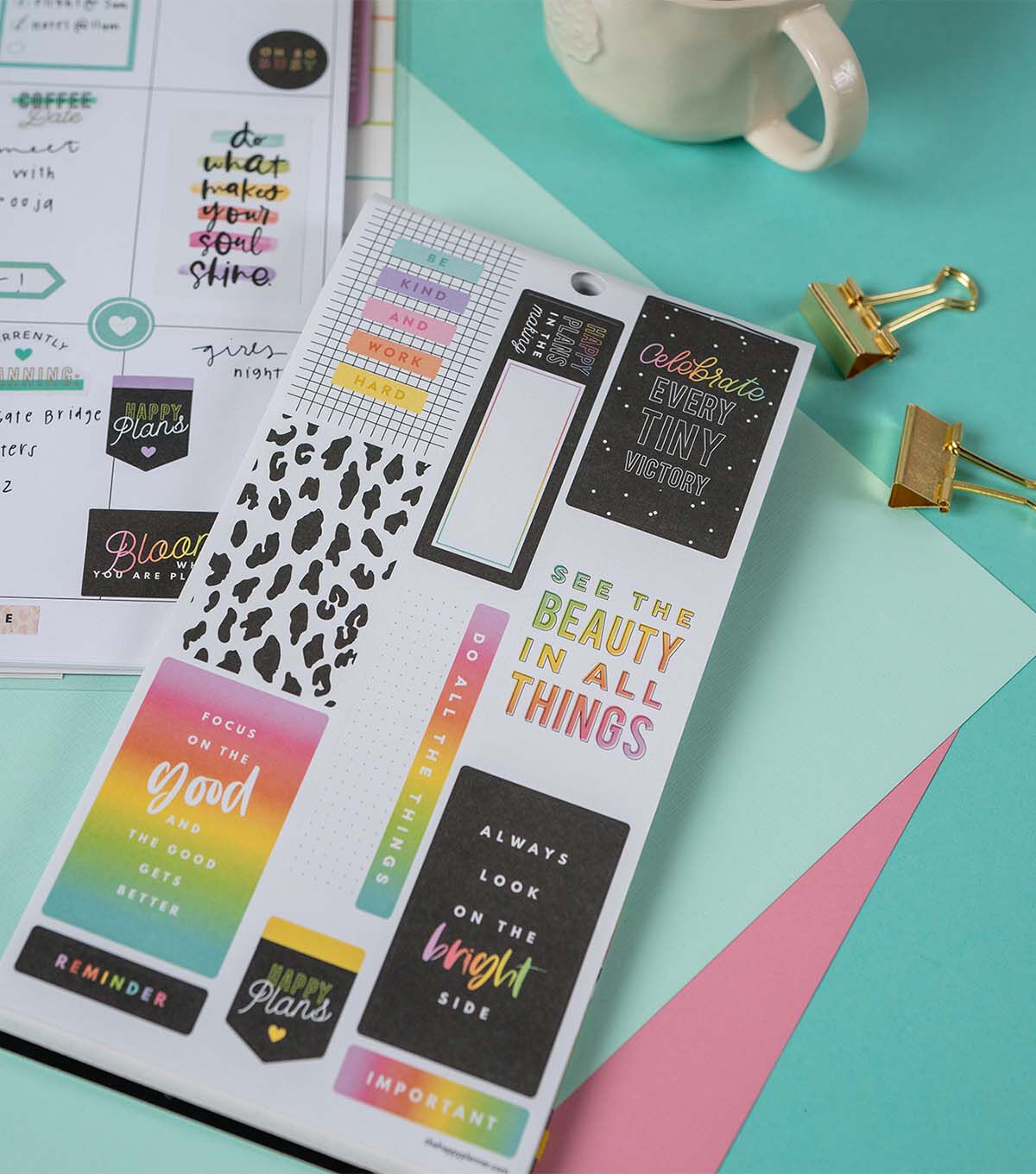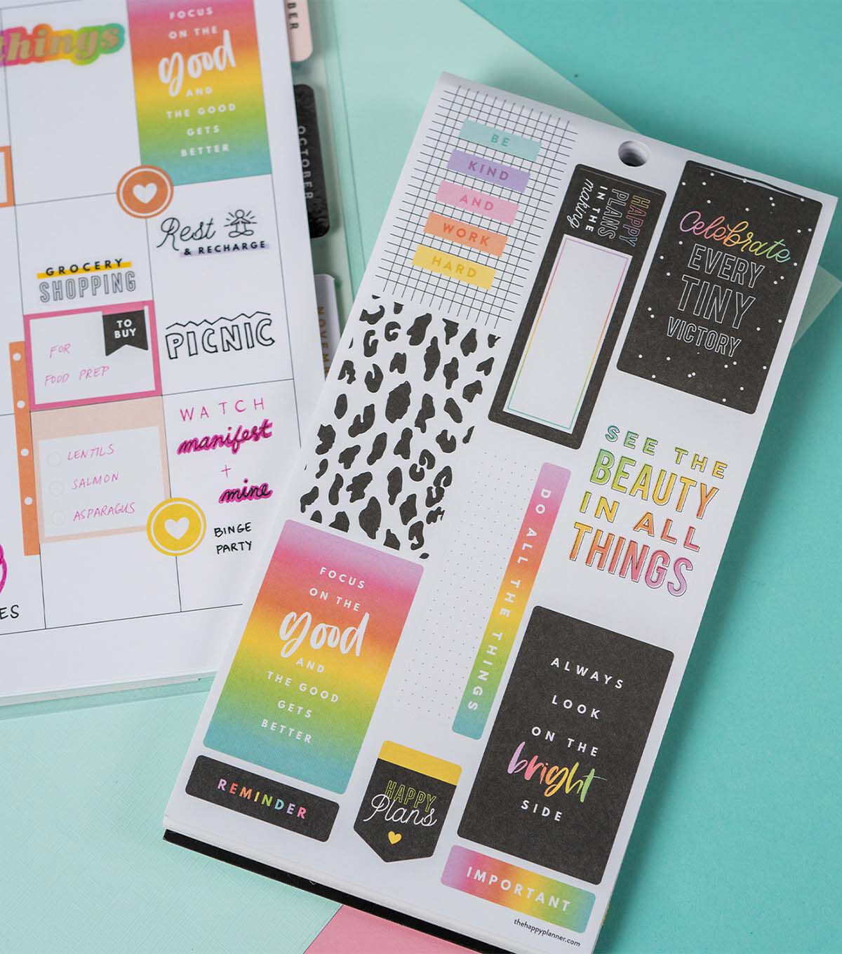 This Happy Plans sticker back features all the basic for making your most positive plans. The bright colors will lighten up any layout in your Happy Planner or notebook. Add to bullet journals to create completely customized plans. Make your plans work for you with stickers created especially for your favorite disc bound planning system.