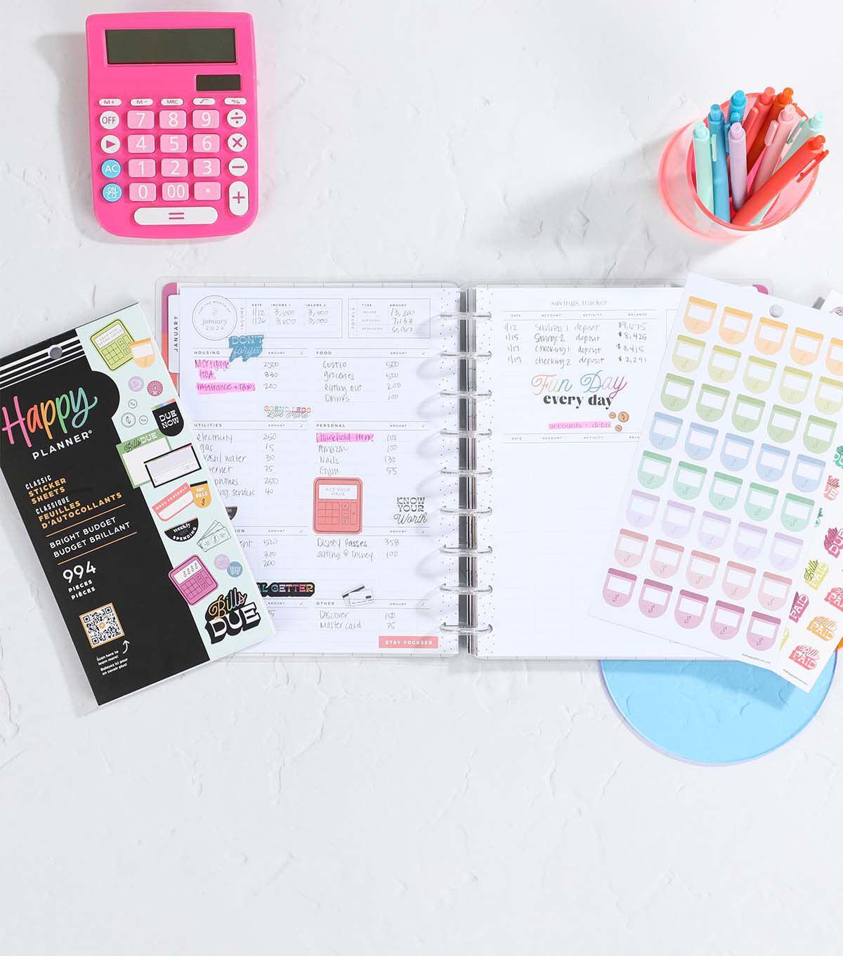 This Bright Budget sticker book features tool for making sound financial decisions. Use in any budget Happy Planner or notebook or add to your daily planner for an extra budget feature. Add to increase the function of your pages. Our stickers are especially made for our organized line of planner products.