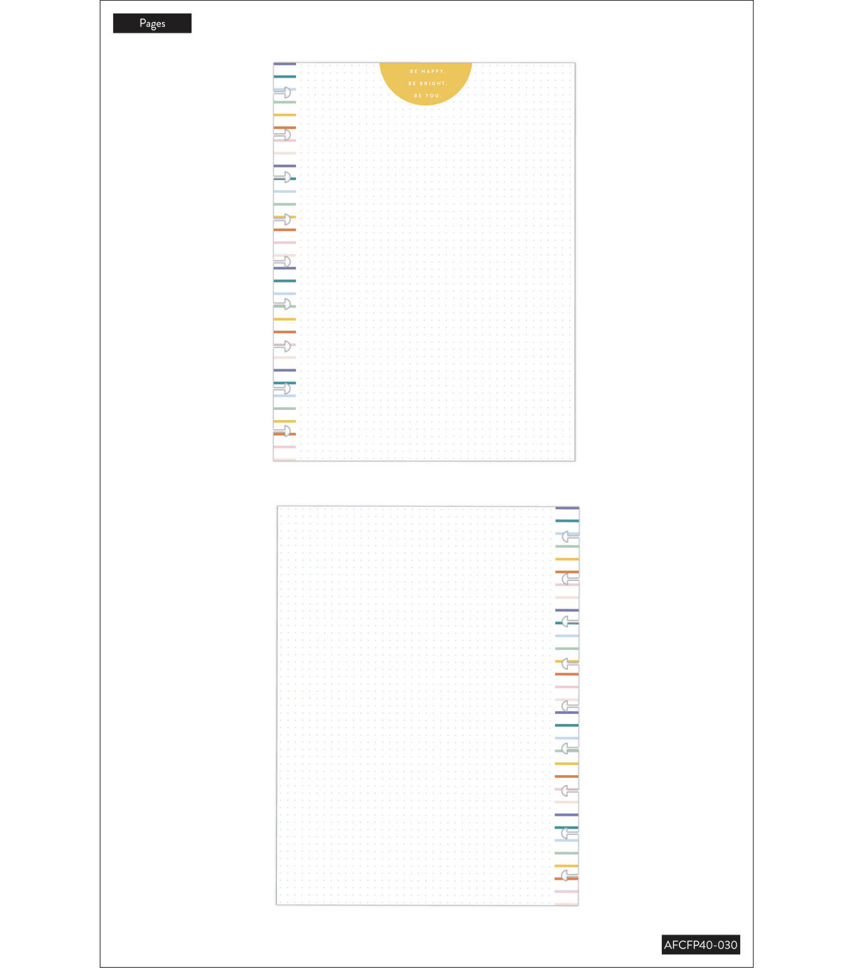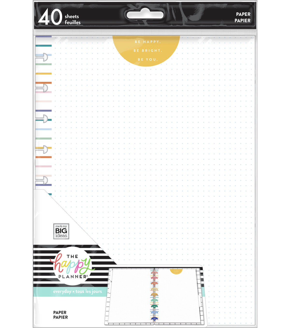 Be Happy. Be Bright. Be You. This everyday filler paper fits into Classic size Happy Planners, notebooks, and journals. Add these pages and use them to make lists, write notes, or journal. It includes 40 dotted grid pages with a “Be Happy” header and rainbow margins.