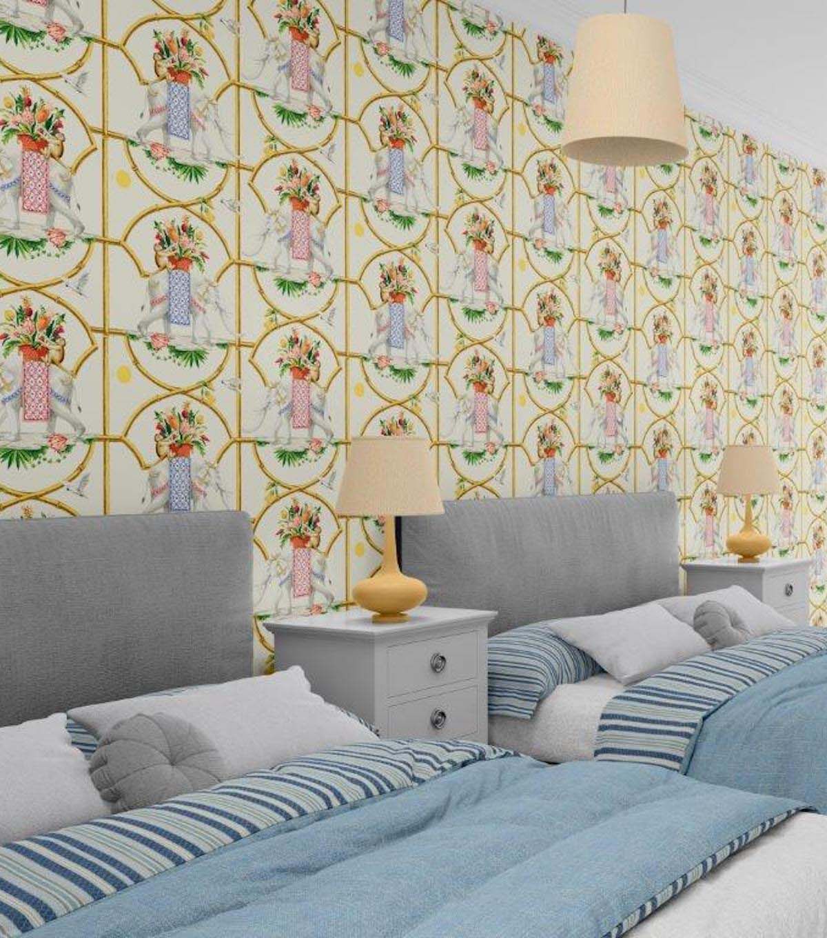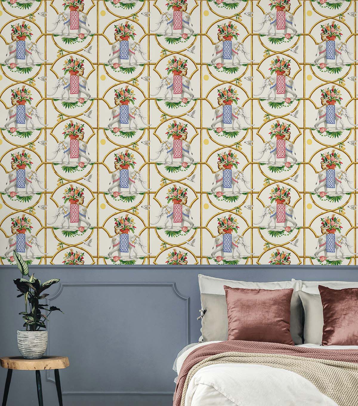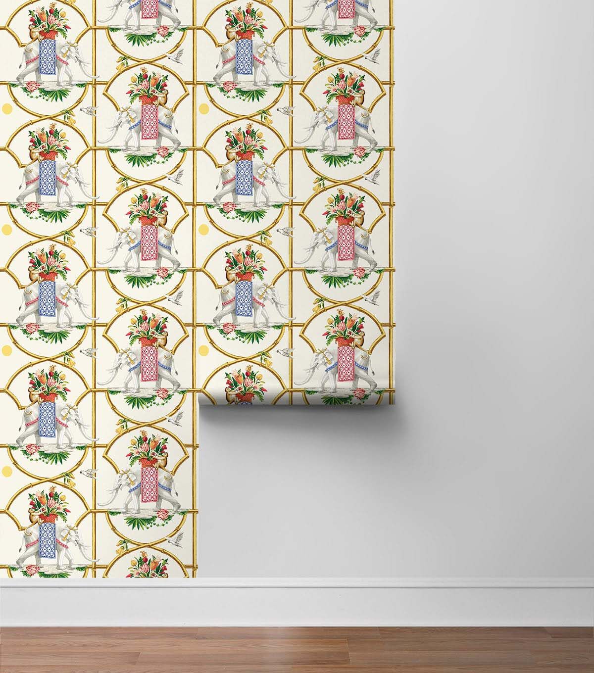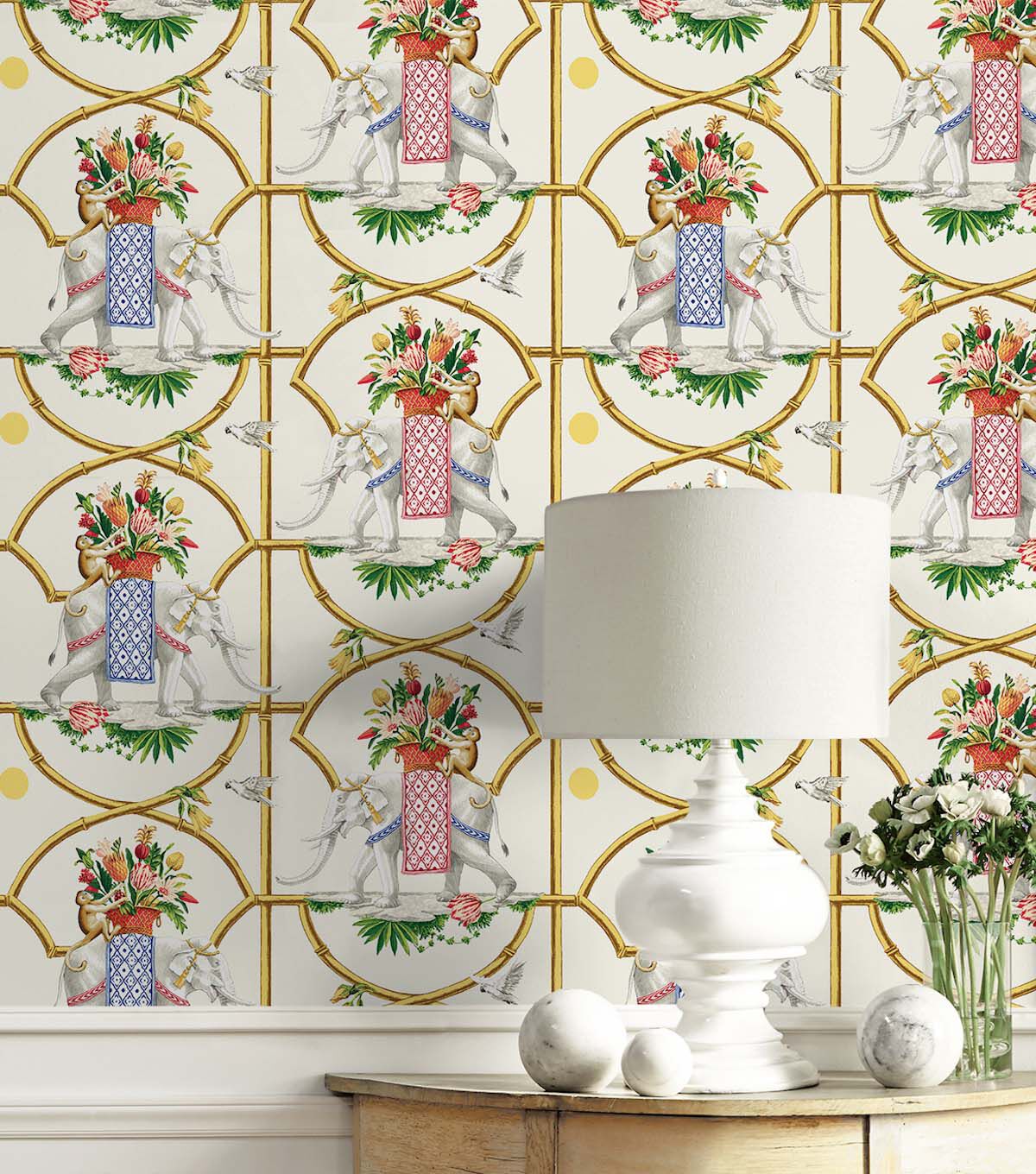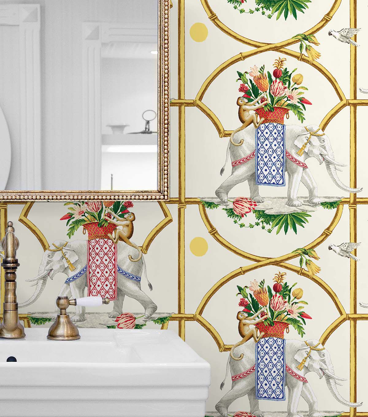 Bamboo lattices frame the scene as majestic elephants enjoy a delightful stroll with their flower filled baskets as simian and avian join their journey. A classic Harrison Howard pattern featuring a unique take on a geometric chinoiserie.