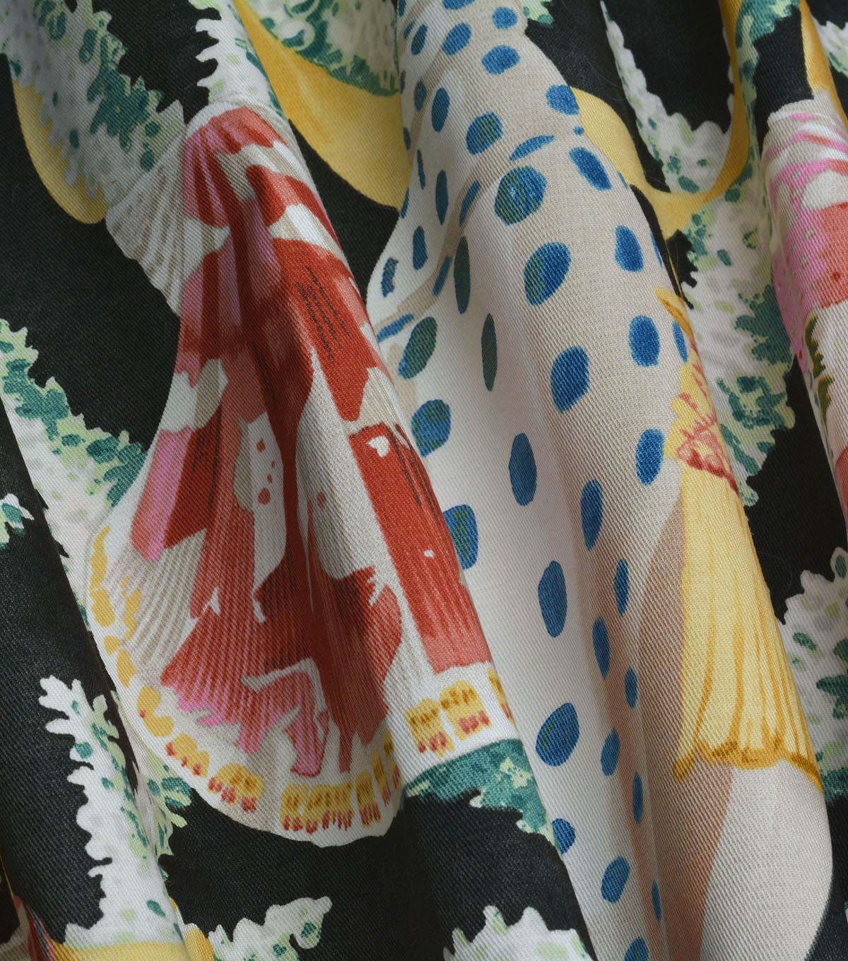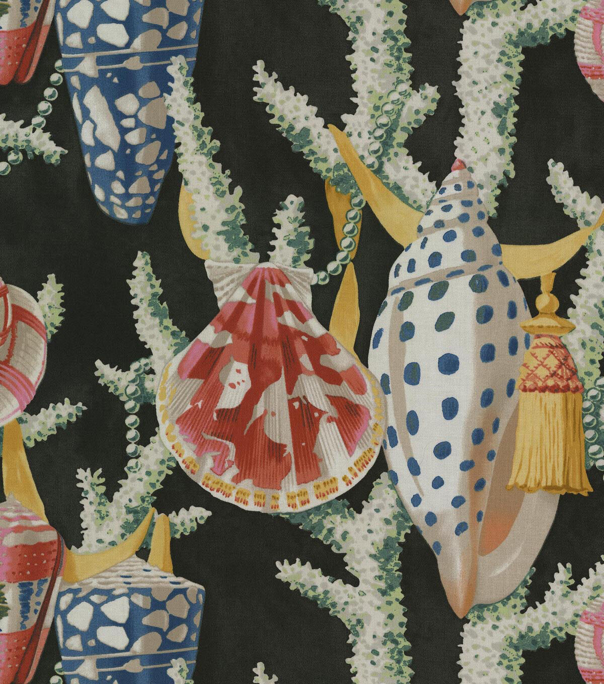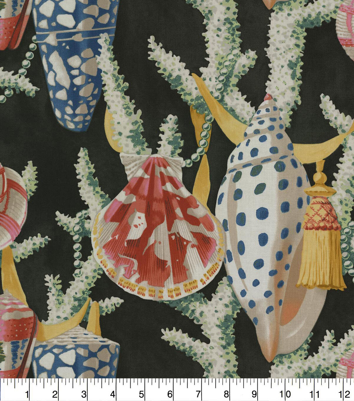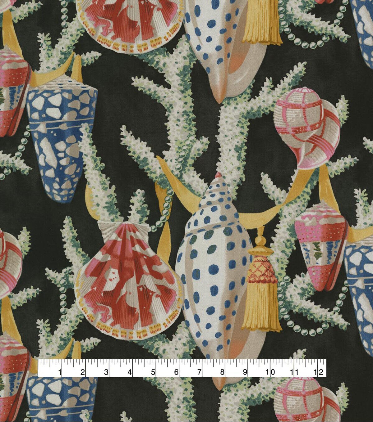 These intricately decorated shells of sea mollusks are strewn abut tasseled ribbons in a sea of majestic coral skies. Printed on a 100% cotton twill this beautiful, colorful design works well for upholstery, drapery, decorative pillows, tabletop and other decorative applications.
