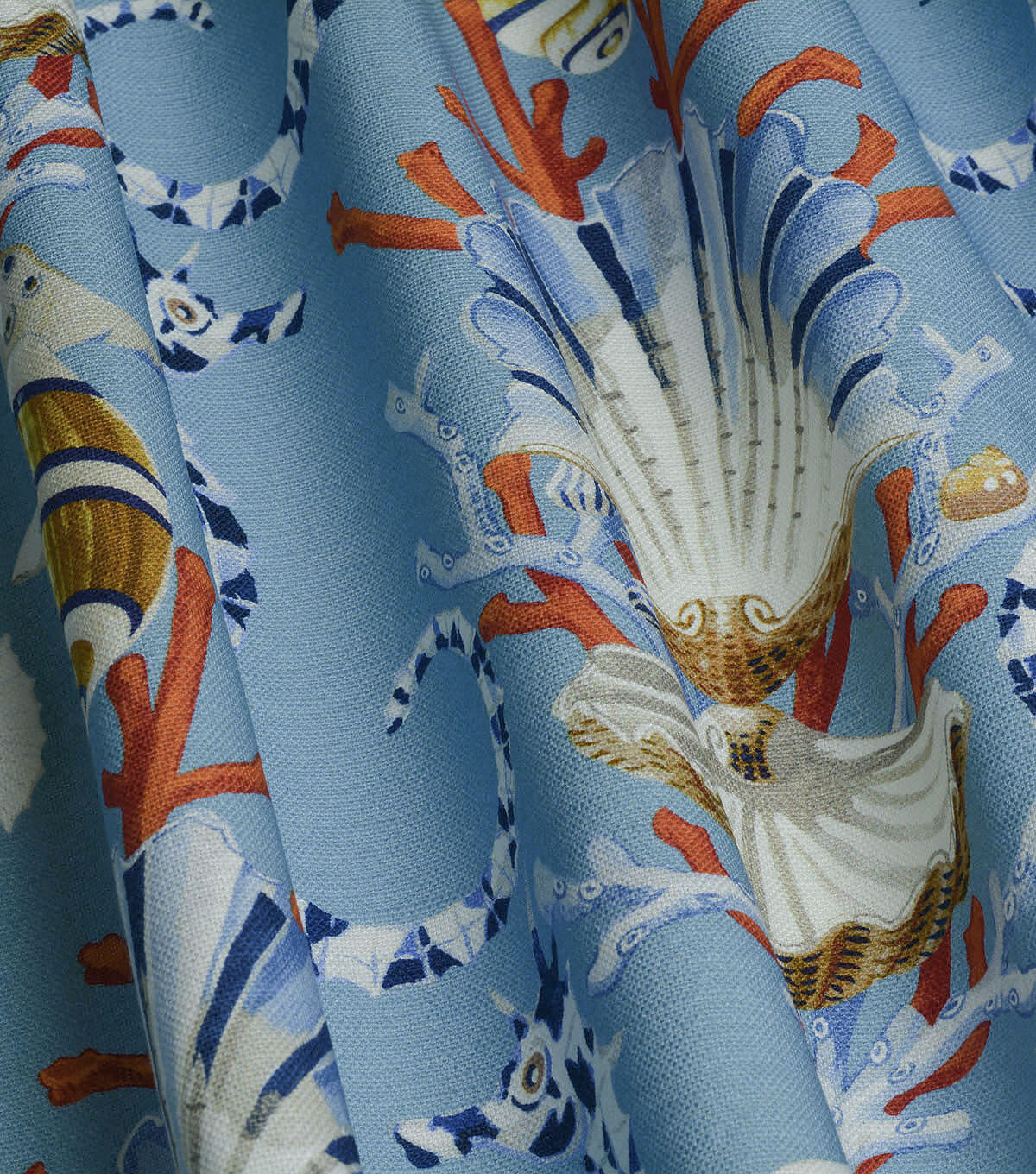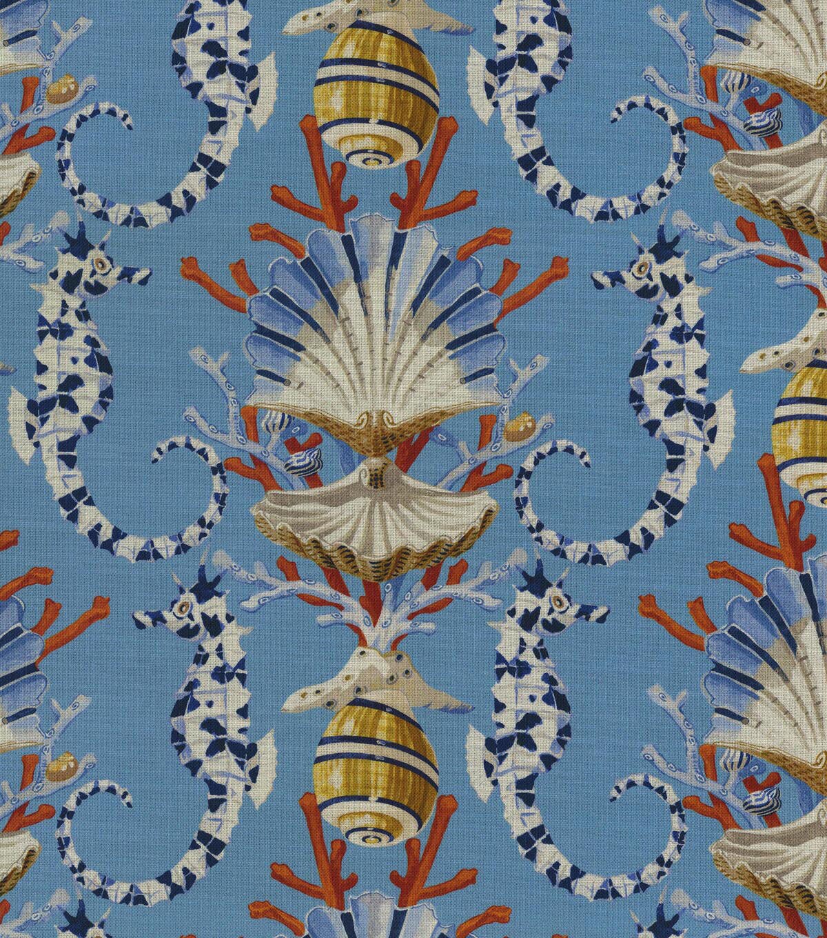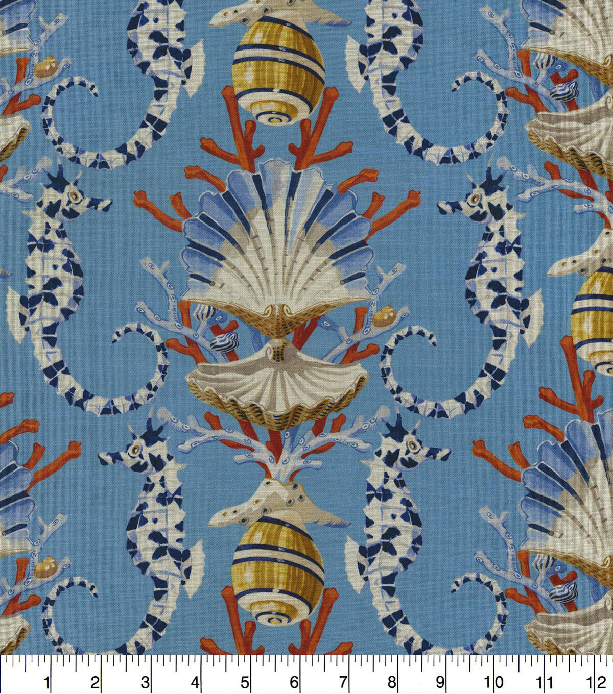 A popular Harrison Howard motif. Mariner's Song blends the shapes of elegant sea life with a mid-scale lattice pattern. Elegant seahorses flank a throne of regal scallops and cresting coral. Printed on 100% cotton twill makes for wonderful drapery, tabletop, upholstery, pillows and other decorative applications.