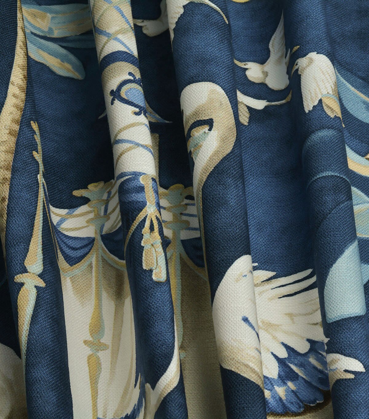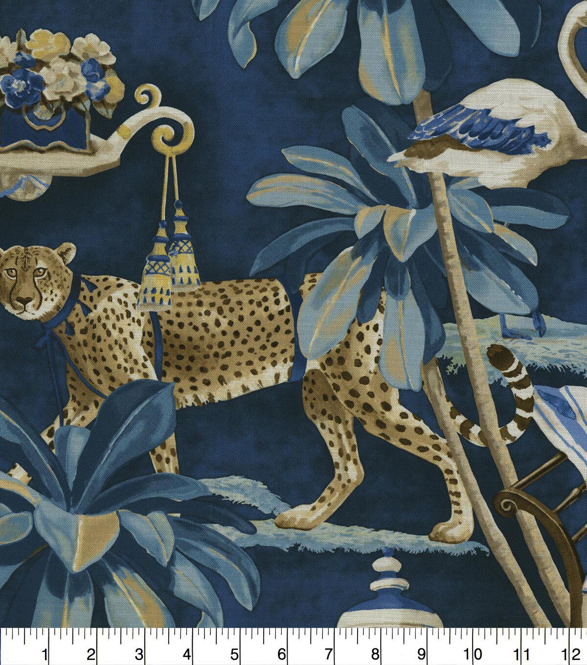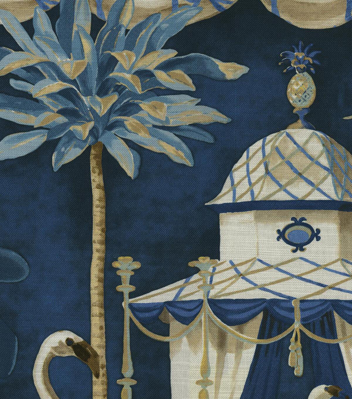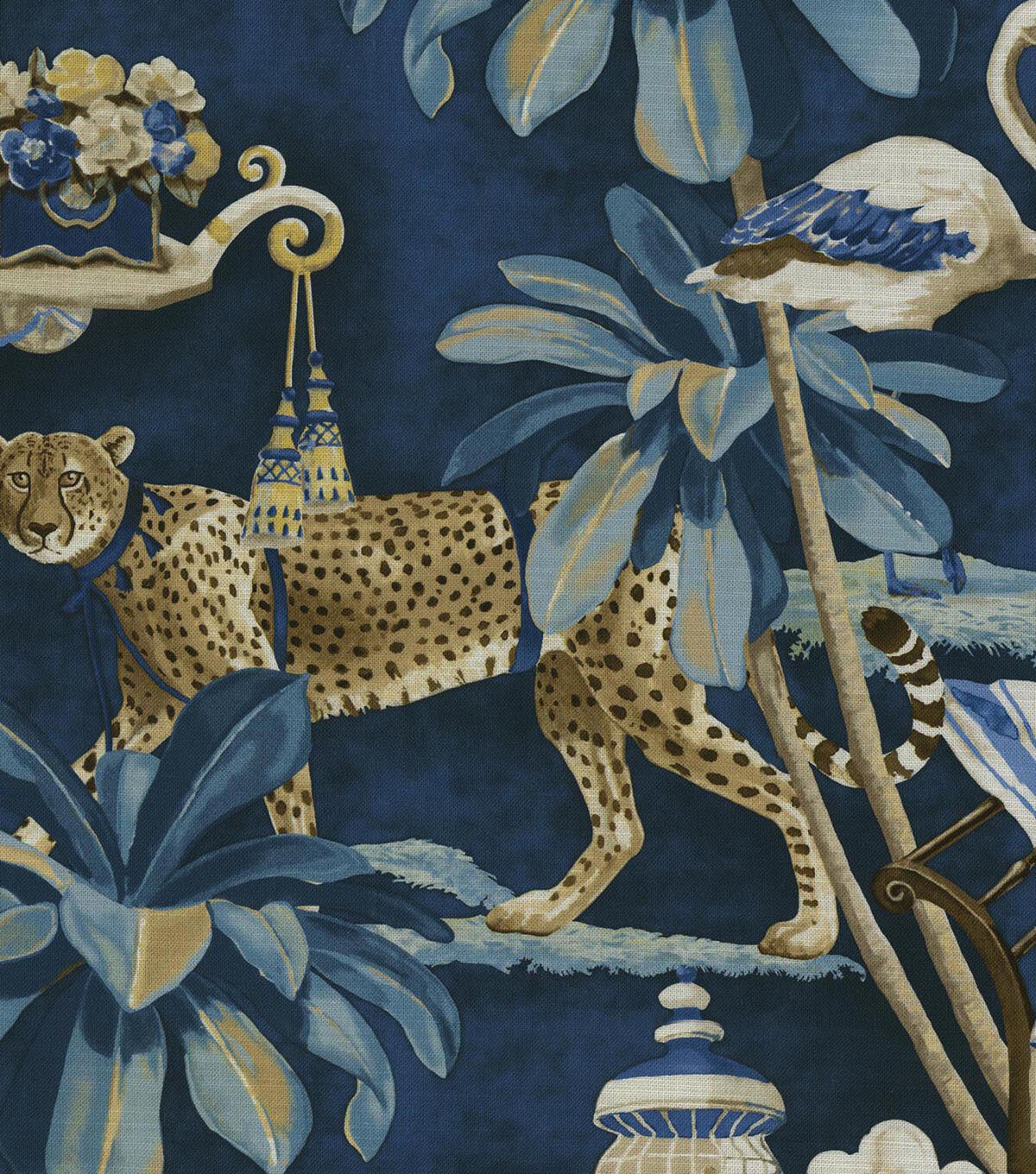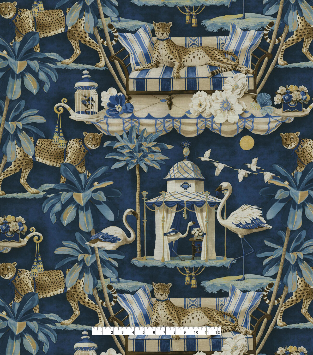 From the imagination of Harrison Howard comes a unique take on the exotic motifs of classical chinoiserie. A relaxing Indian gazebo sits flanked by the fantastical whimsy of majestic flamingos and lounging cheetahs. Printed on 100% cotton with a soft hand lends itself to upholstery, drapery, decorative pillows, bedding, head board and other decorative applications.