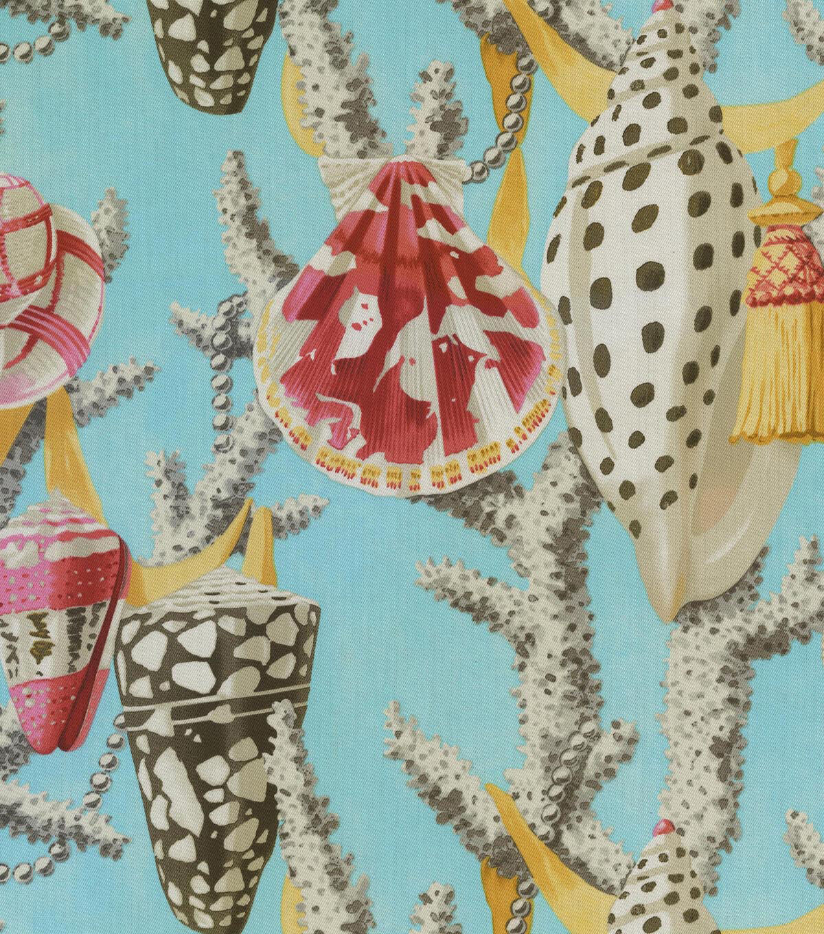 These intricately decorated shells of sea mollusks are strewn abut tasseled ribbons in a sea of majestic coral skies. Printed on a 100% cotton twill this beautiful, colorful design works well for upholstery, drapery, decorative pillows, tabletop and other decorative applications.
