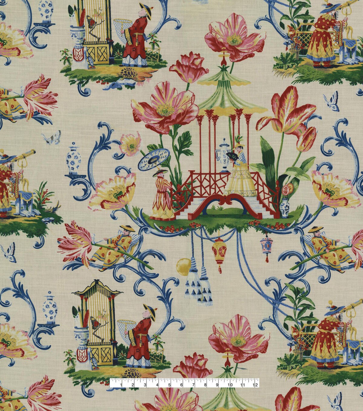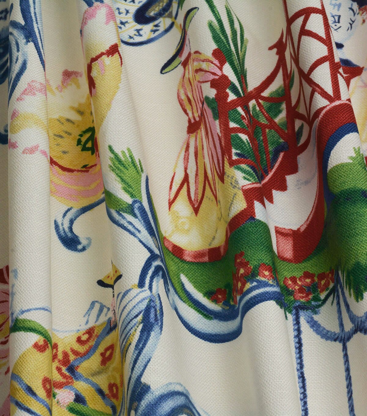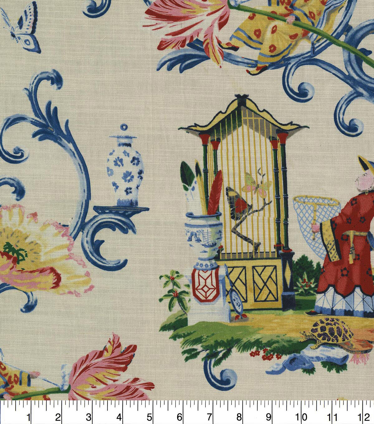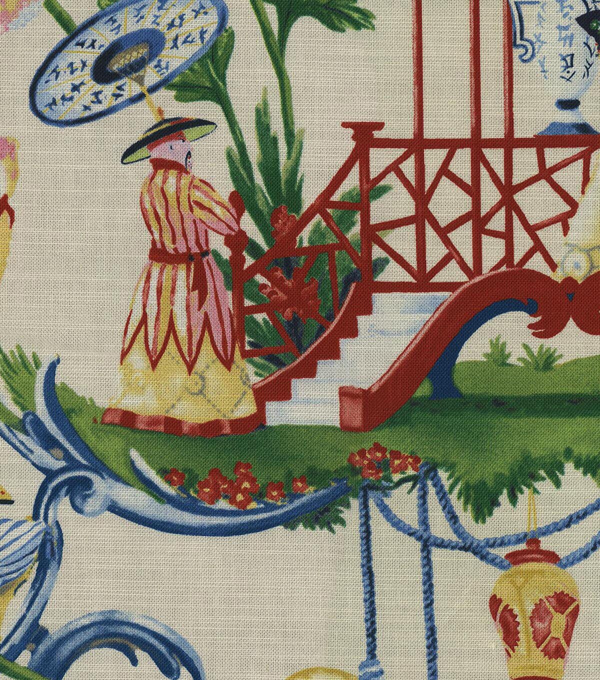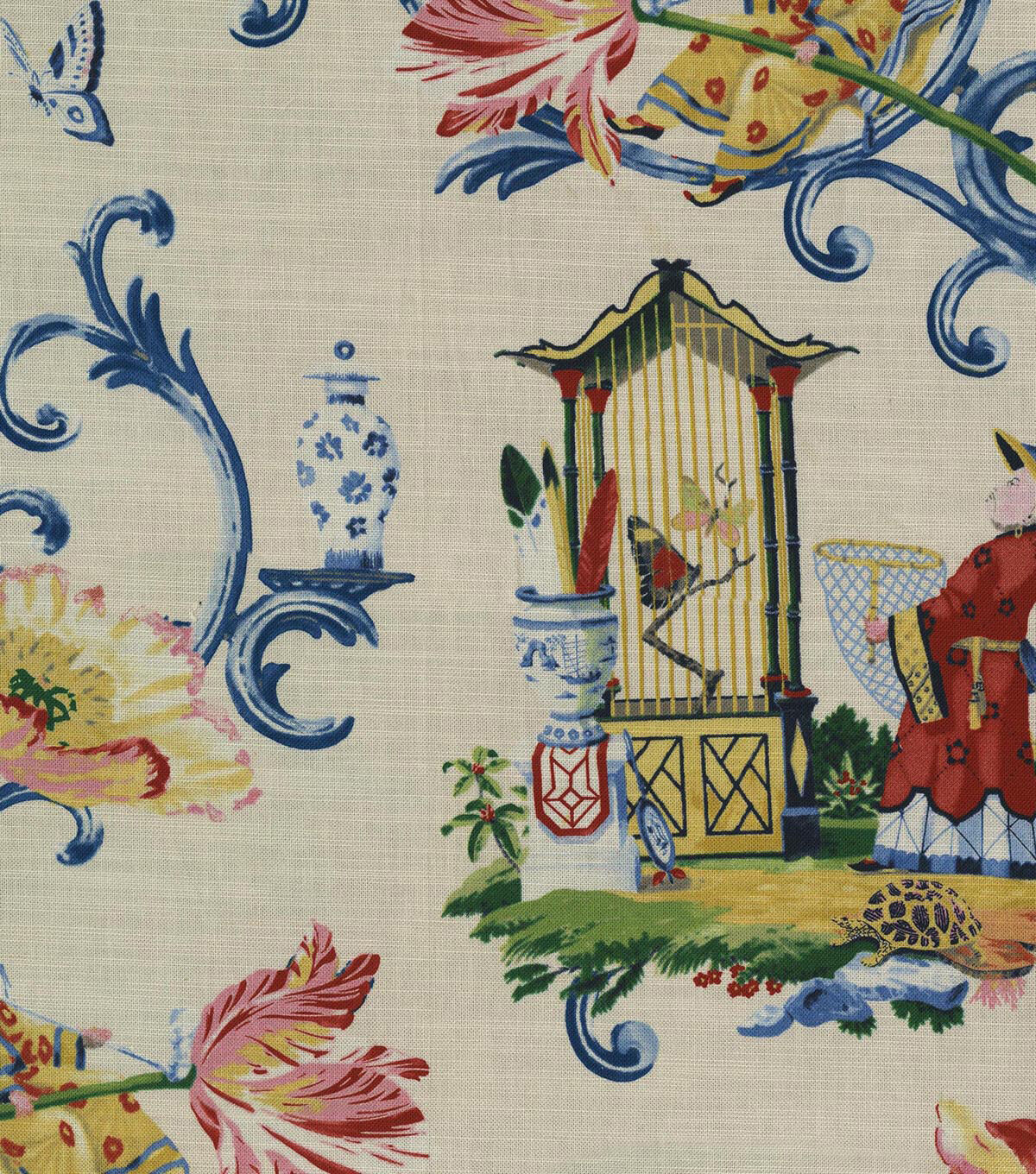 This lush and colorful chinoiserie is brought to life by Harrison Howard's distinctive hand and eye for arrangement. Printed on 100% cotton. This very striking traditional chinoiserie will make a welcomed addition to your interior for upholstery, drapery, headboard, throw pillows, bedding and more.