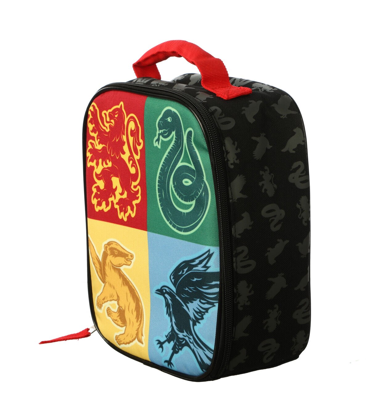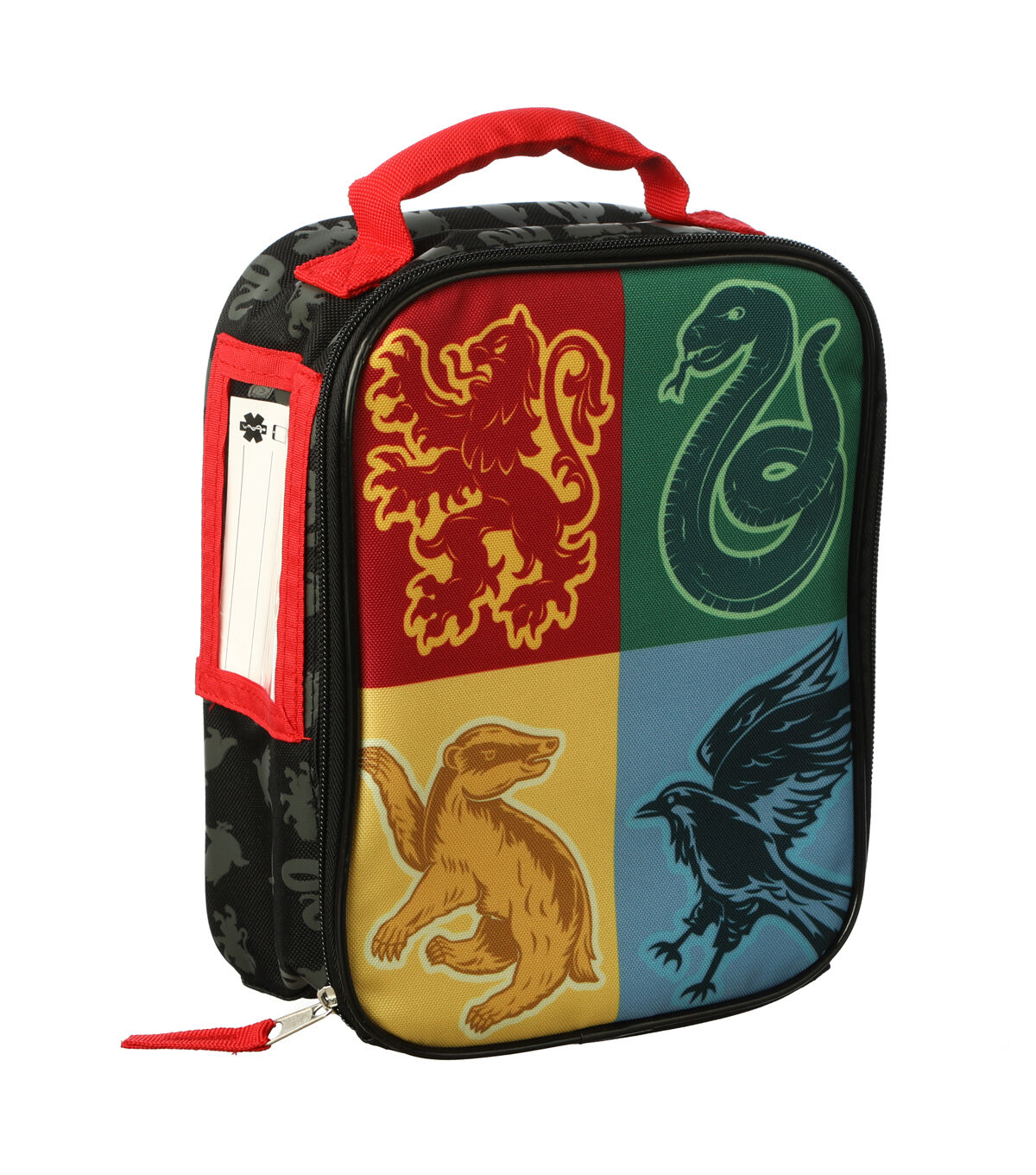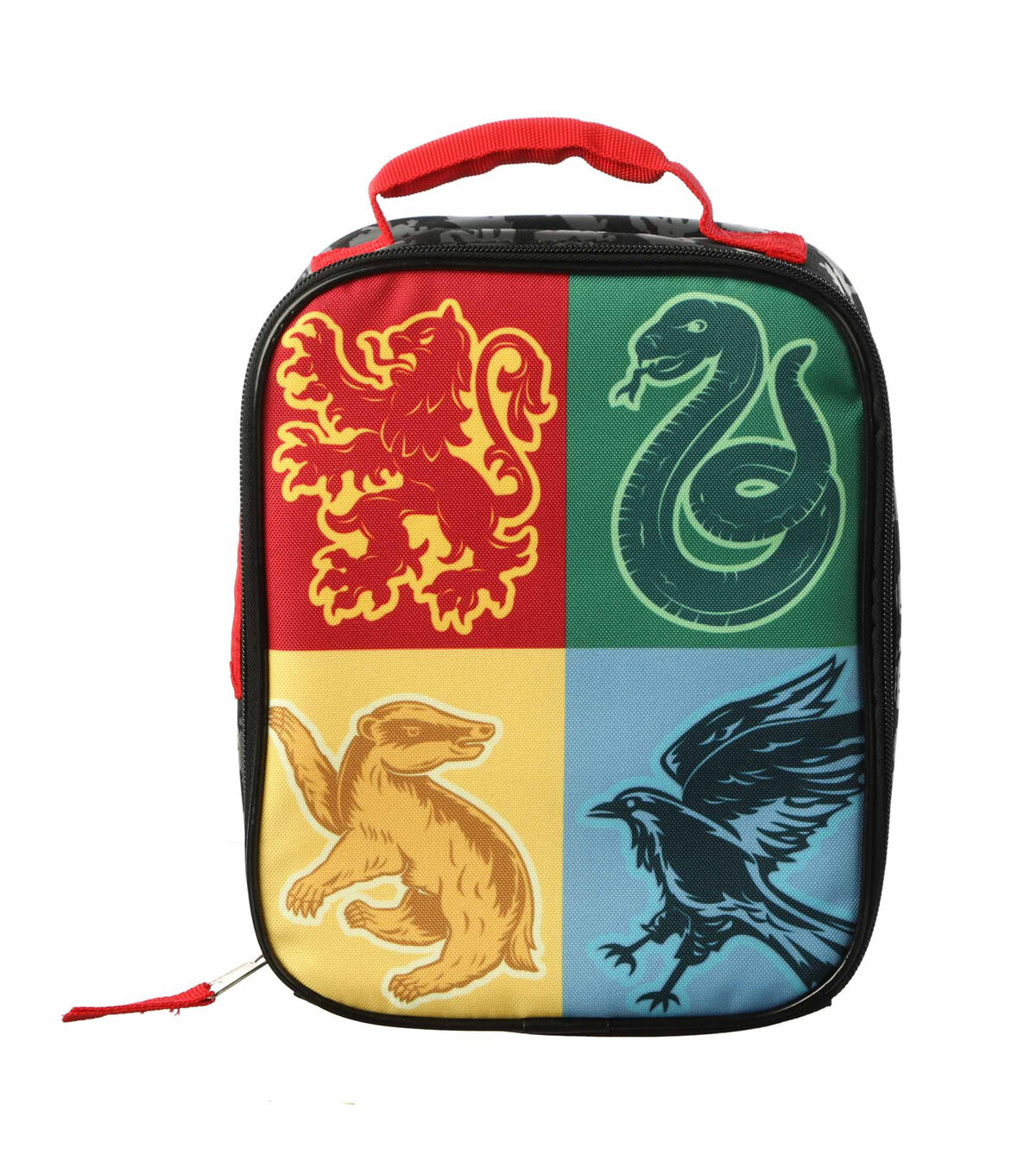 Your Harry Potter Fan will love to carry their lunch in 'Hogwarts Crest' Lunch Pack. It sports the colors of each house on the front with their sygil. And also has the Hogwarts crest on the back. . This lunch pack is designed with a handle on top and a zip closure.