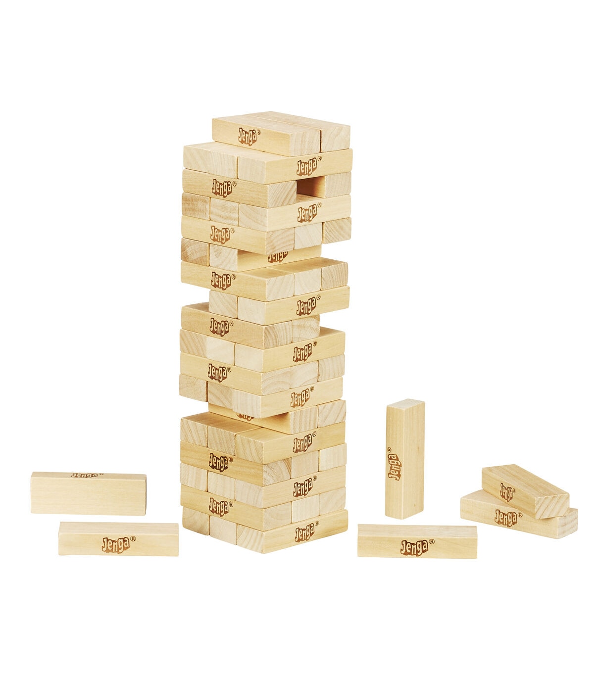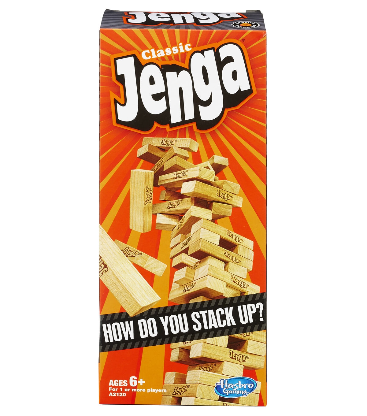 It's the classic block-stacking, stack-crashing game of Jenga. You will need to stack up against the law of gravity. Stack the wooden blocks in a sturdy tower, and then take turns pulling out blocks one by one until the whole stack crashes down. If your hand is steady enough to pull out the last block before the tower collapses you'll win at Jenga. Win by being the last player to remove a block without causing the stack to crash. The pack includes 54 hardwood Jenga blocks and a stacking sleeve. It is ideal for ages six and up.