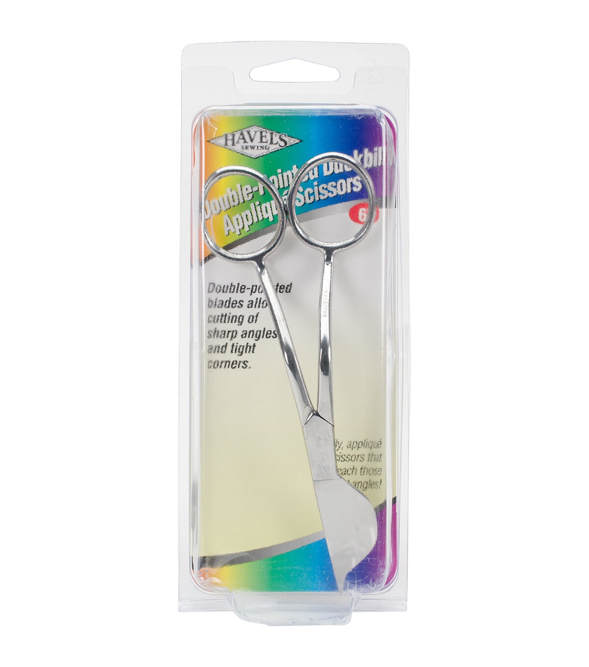 Havel's-Double Pointed Duckbill Applique Scissors. The double pointed blades allow cutting of sharp angles and tight corners. The large bill lifts fabric as it trims away. This package contains one pair of 6 inch scissors. Imported.