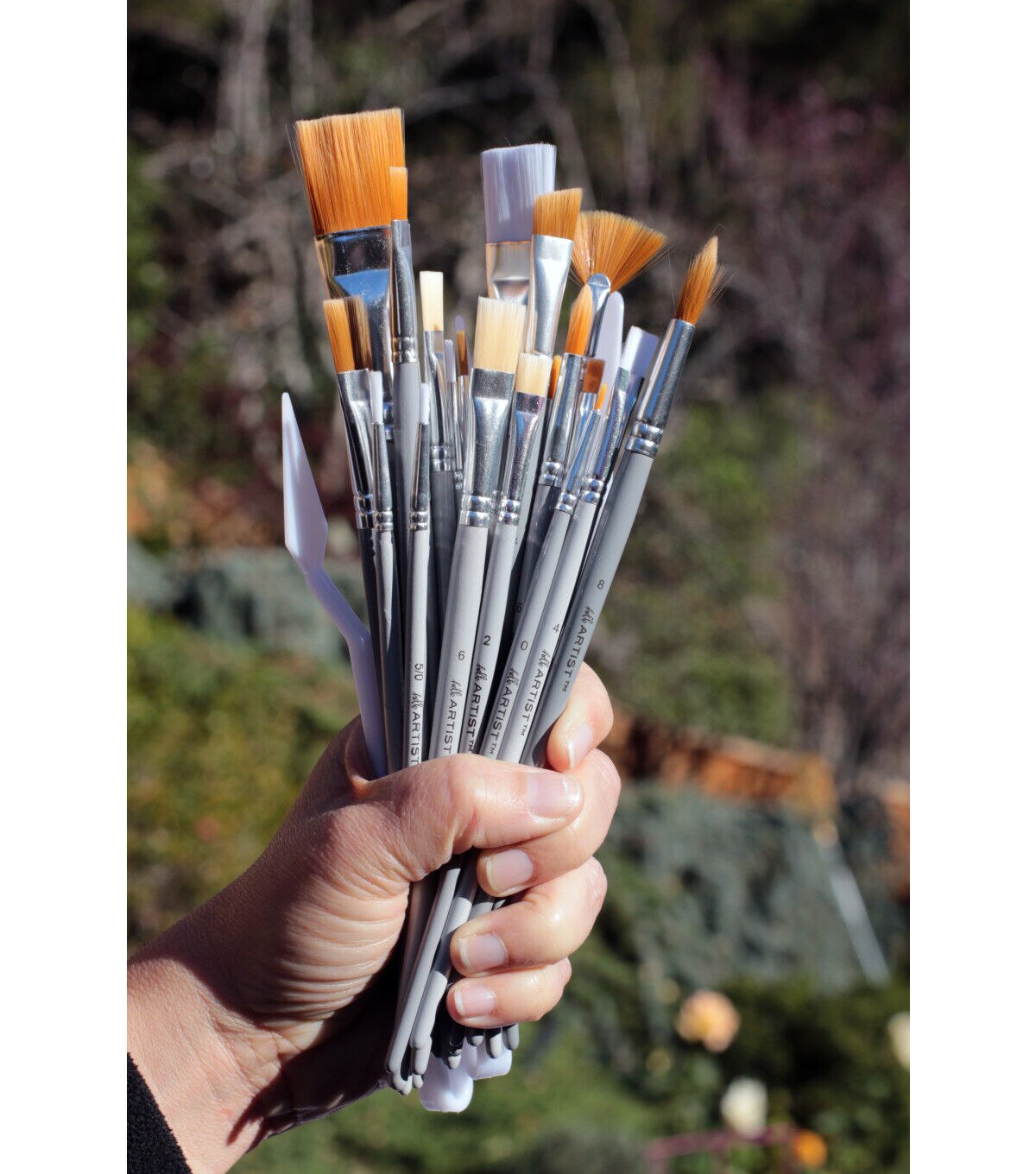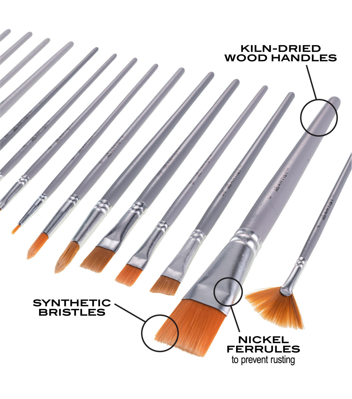 - Hello, Artist! brushes made with kiln-dried wood handles, nickel ferrules to prevent rusting, and synthetic bristles. The short handles allow you to work on projects up close. Designed in the USA